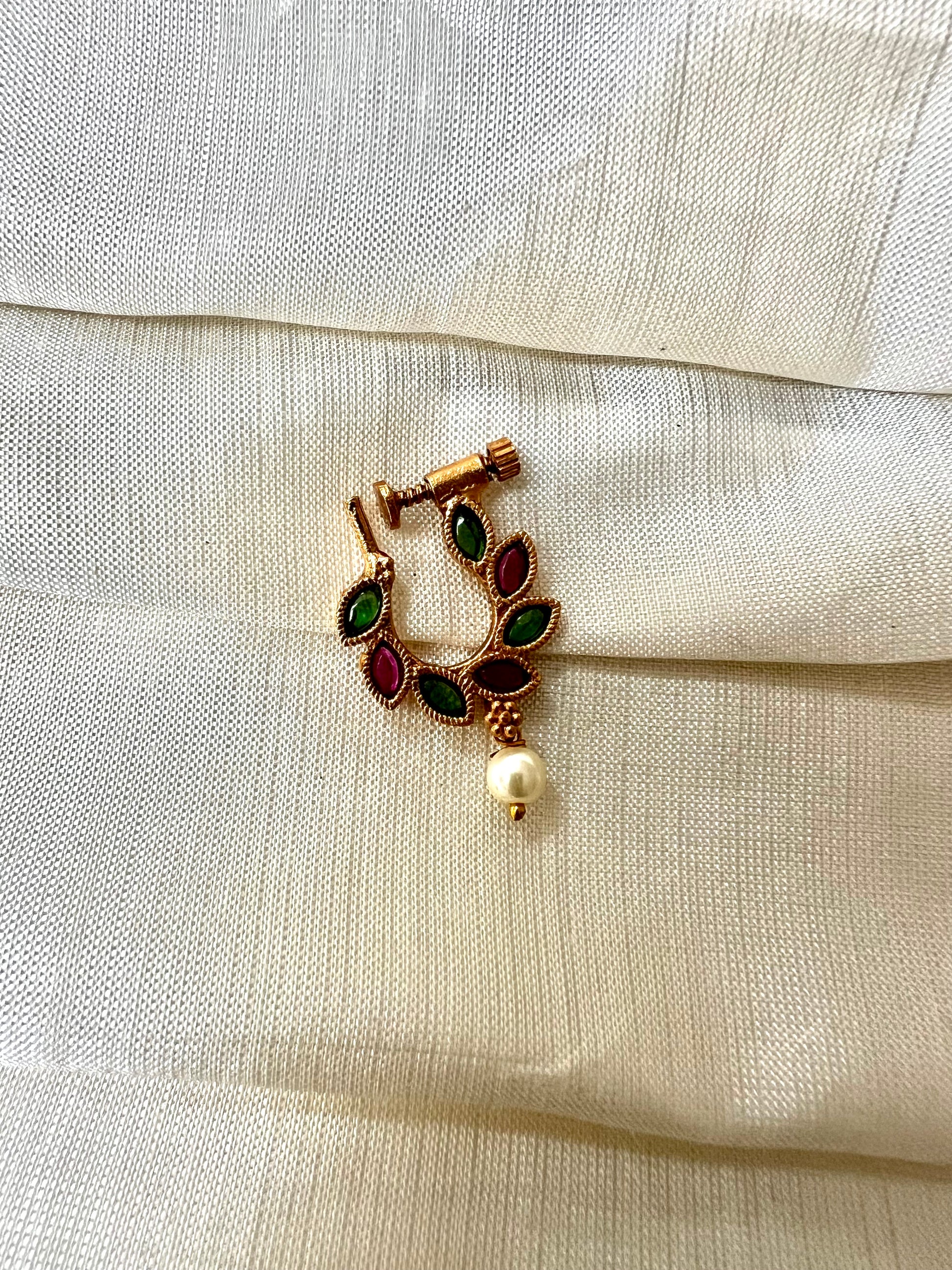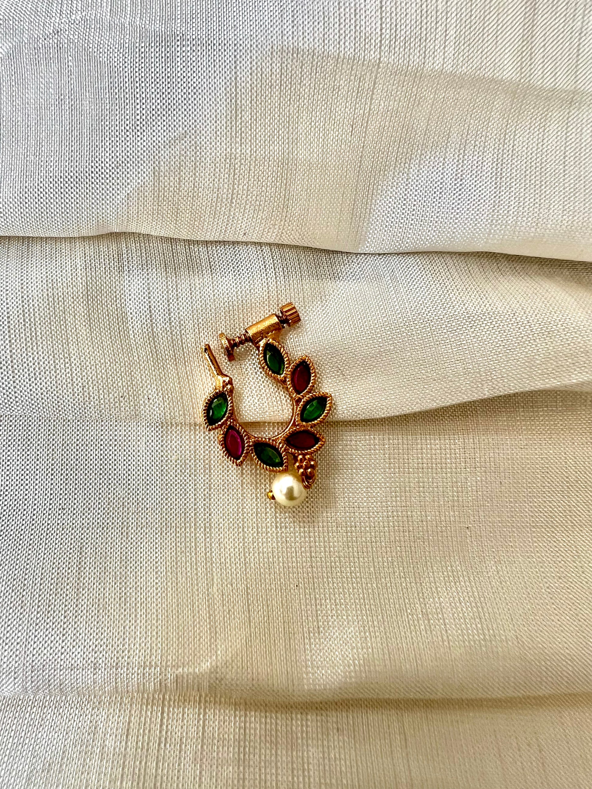 Beautiful oval shaped gold plated nosering embellished with ruby and green stones and a dangling ivory pearl.
