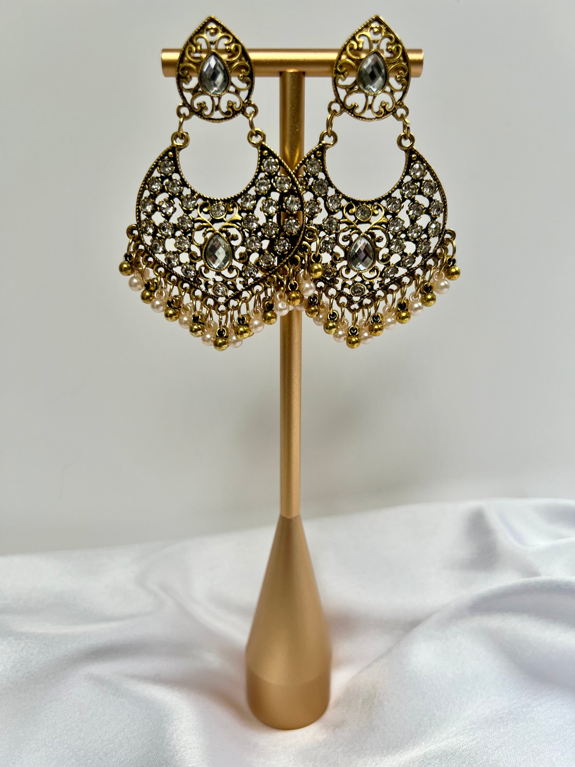 Antique golden white stoned flat earrings with golden and white pearls E3059