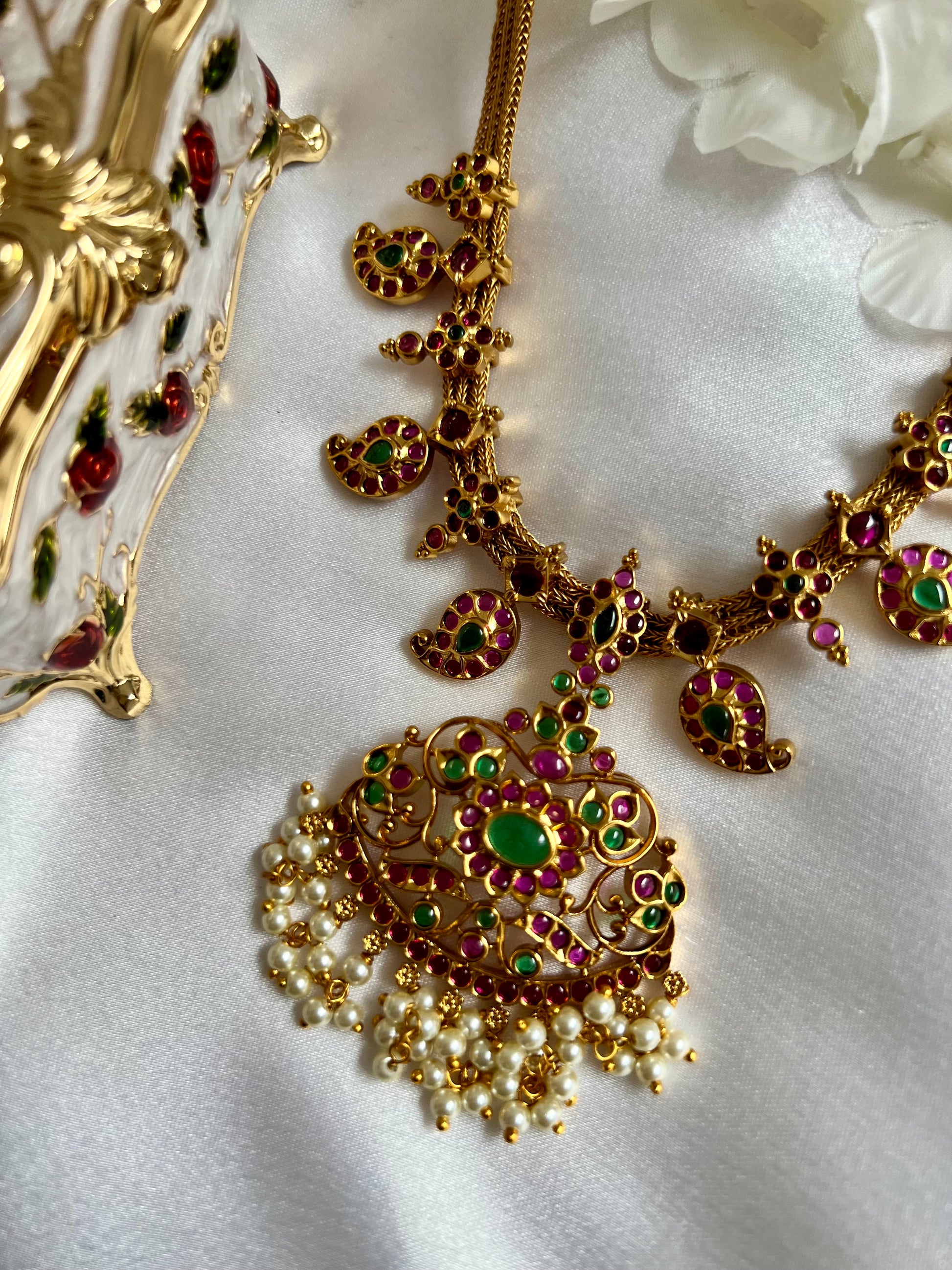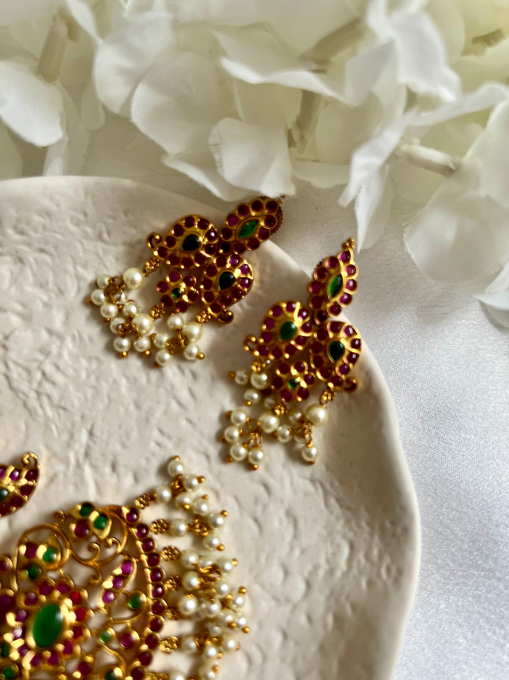 Beautiful rubygreen kemp stoned necklace set in a golden base with dangling white pearls, complement earrings included.
