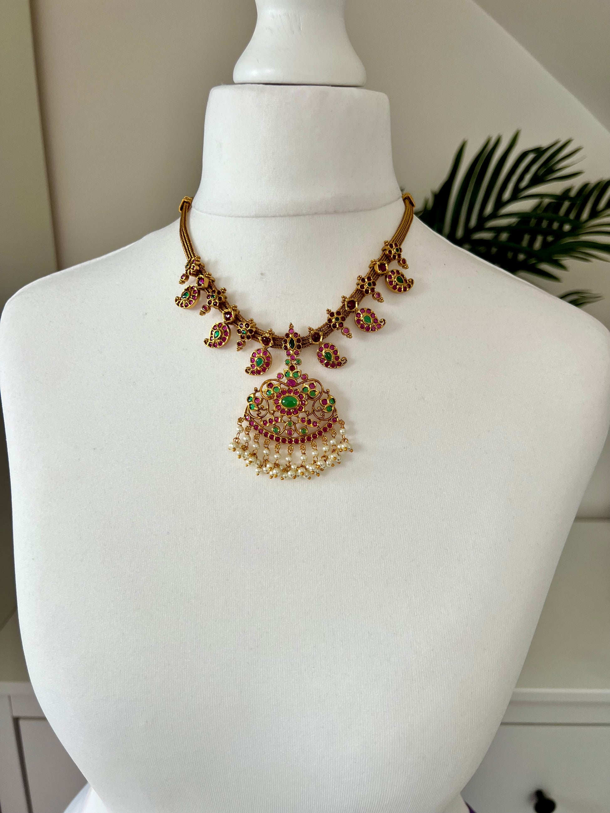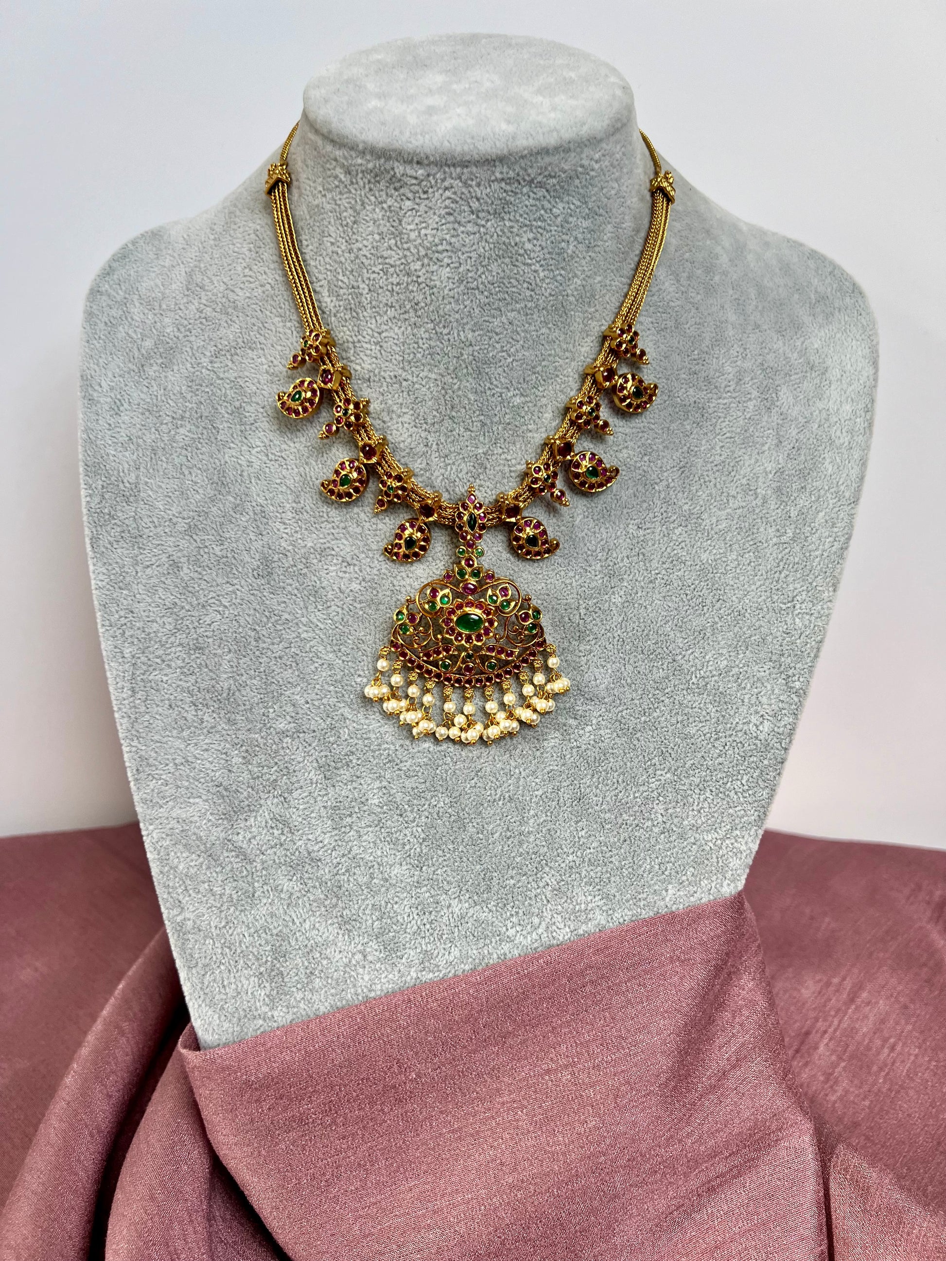 MAHA - Antique kemp stone style short necklace with mango motifs in rubygreen with matching earrings N3051