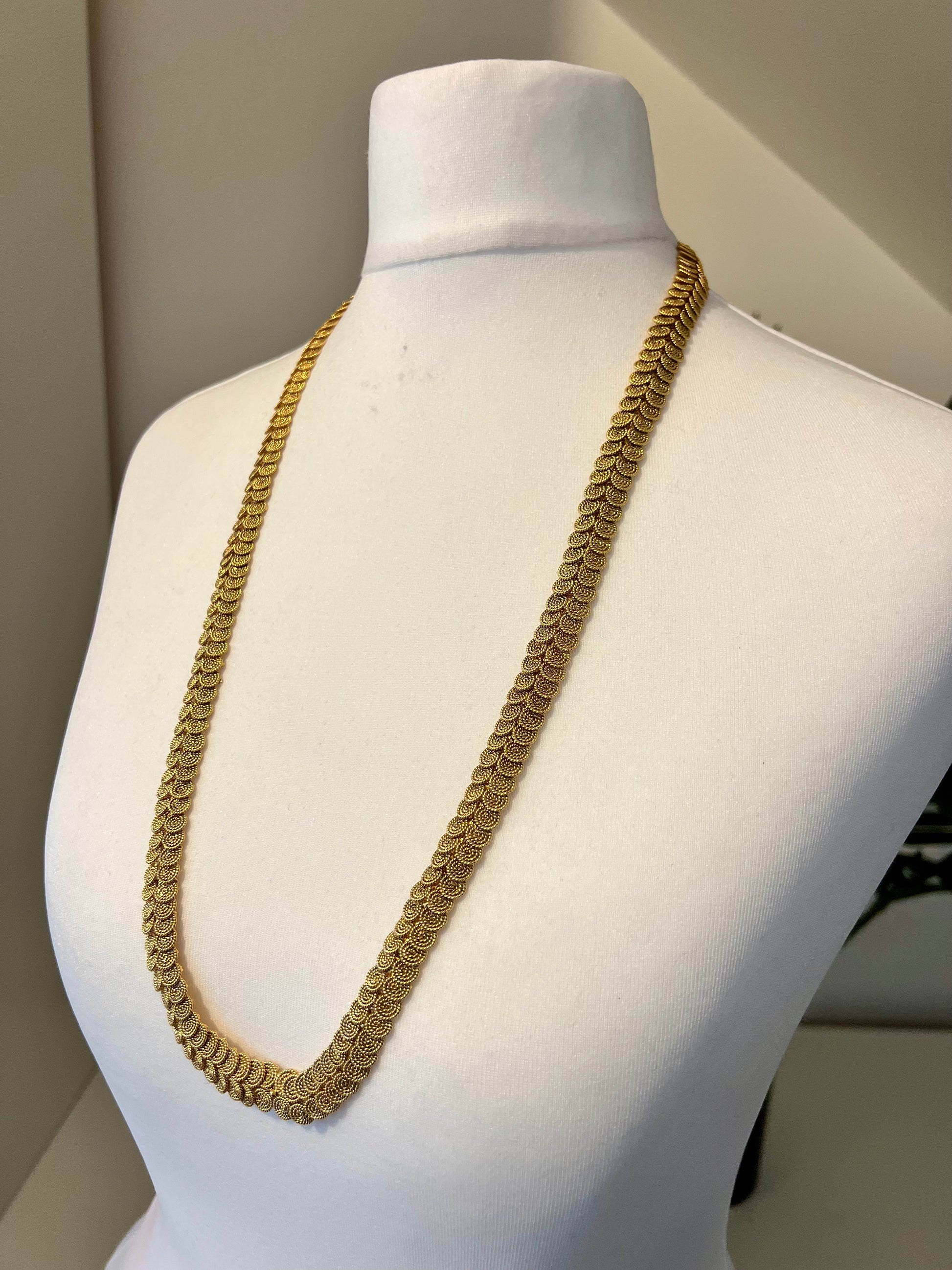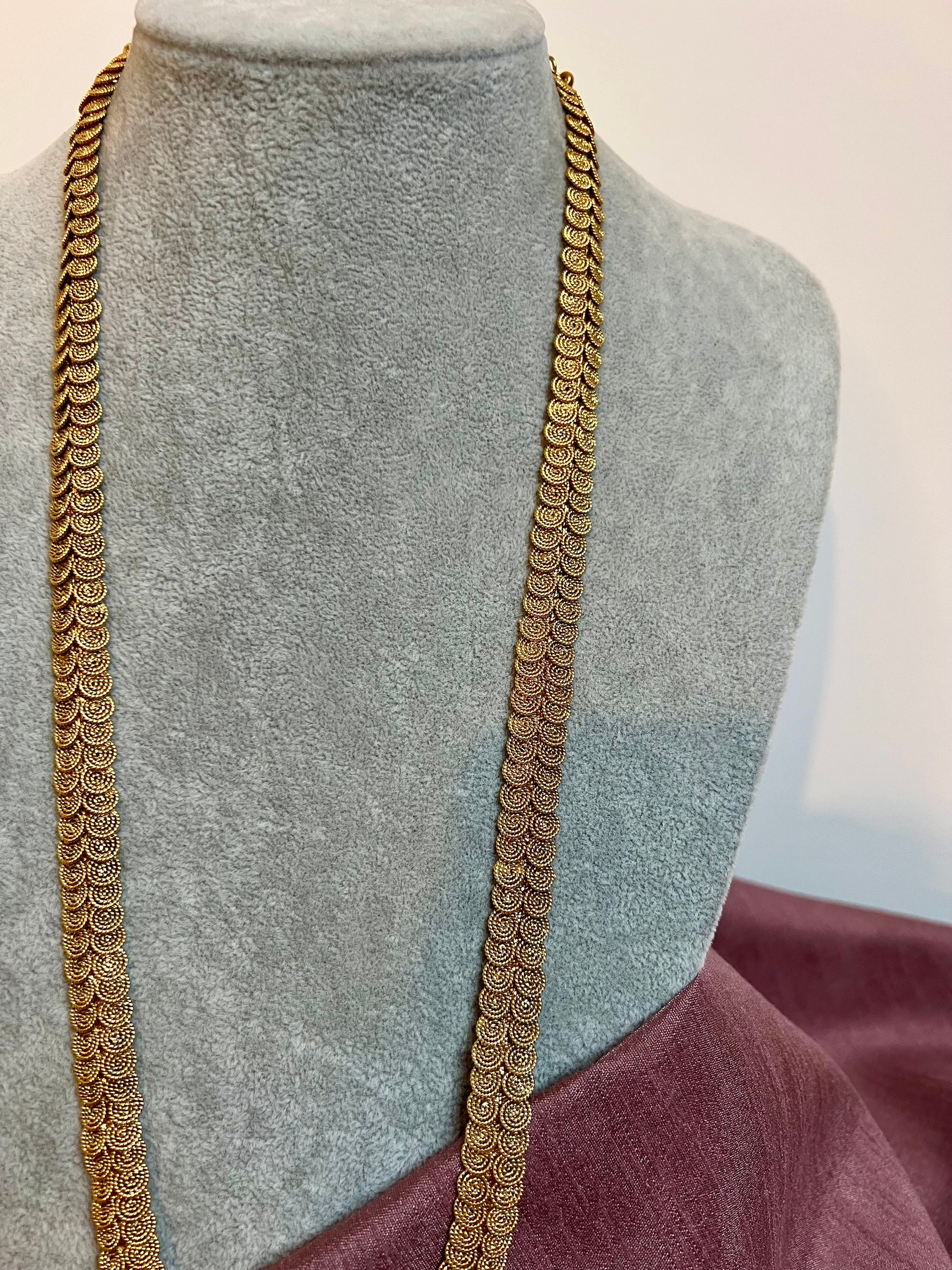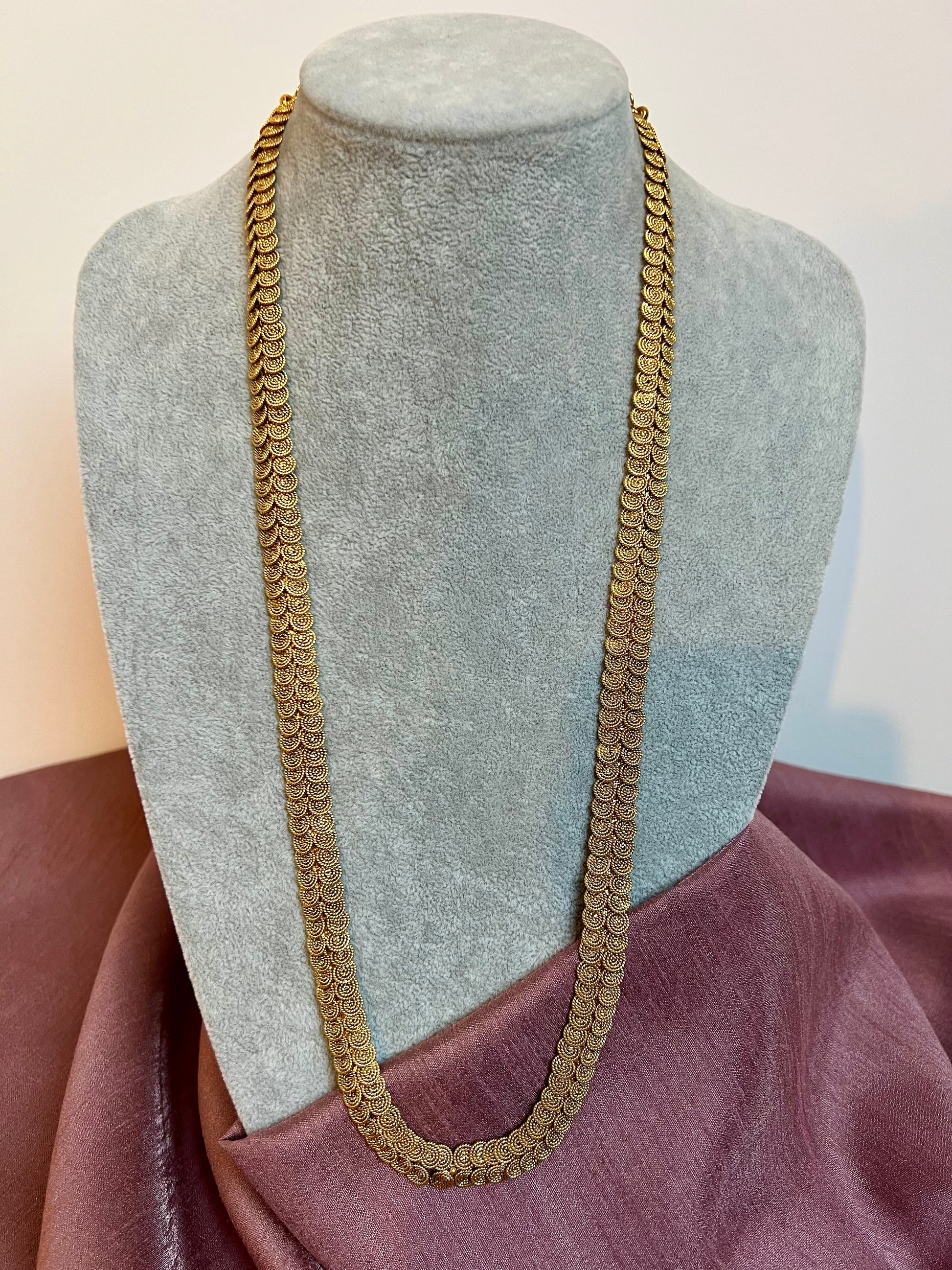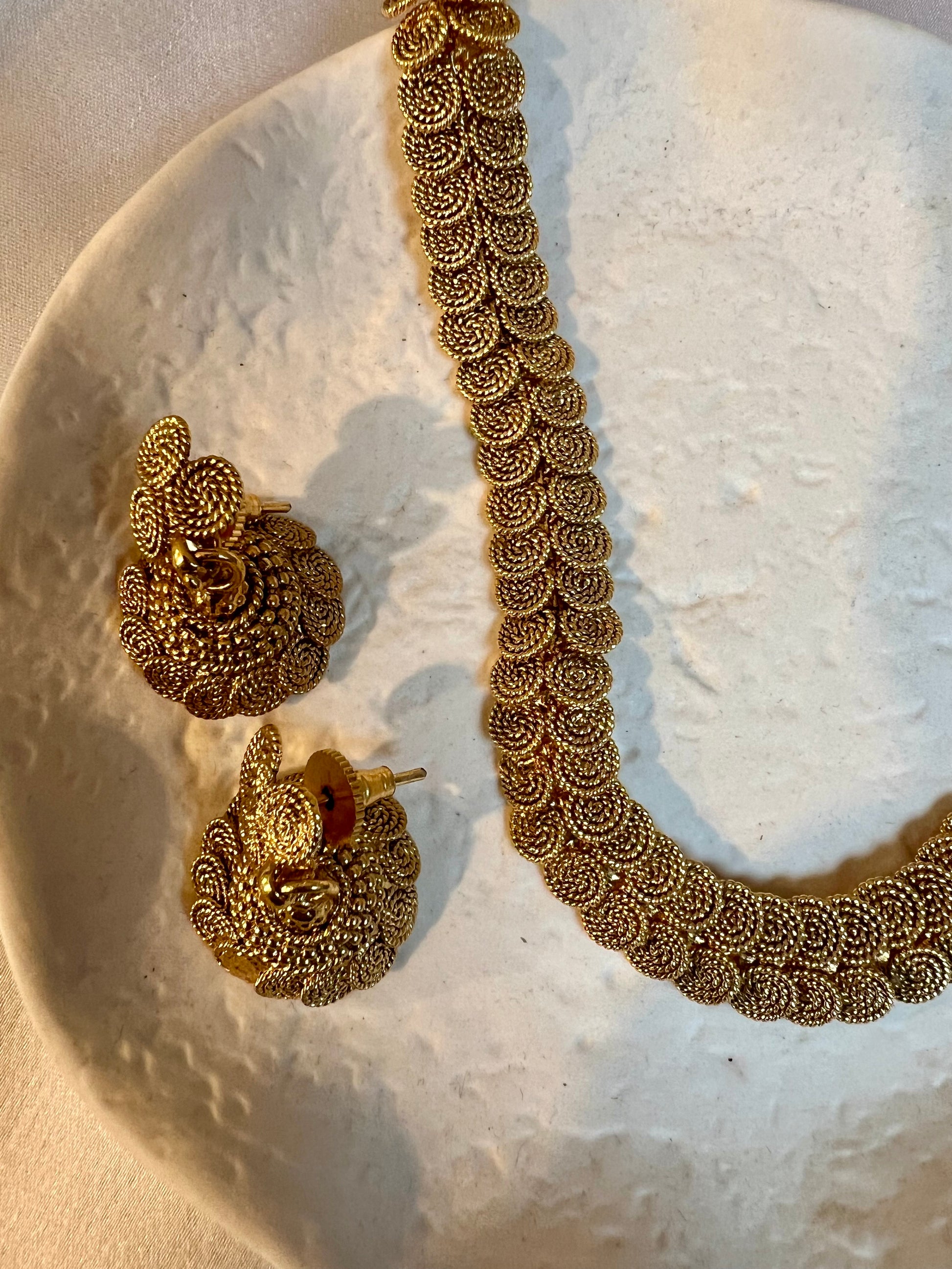 Simple long matte gold plated necklace with matching small jhumkas perfect to layer with a short necklace.