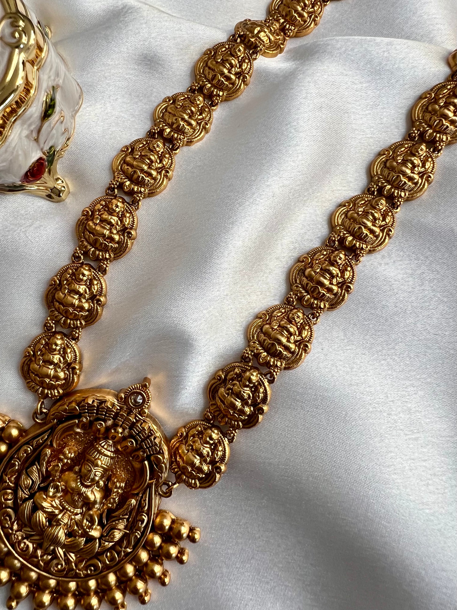 PRANAVI - Antique temple long gold plated necklace with matching jhumkas N3058