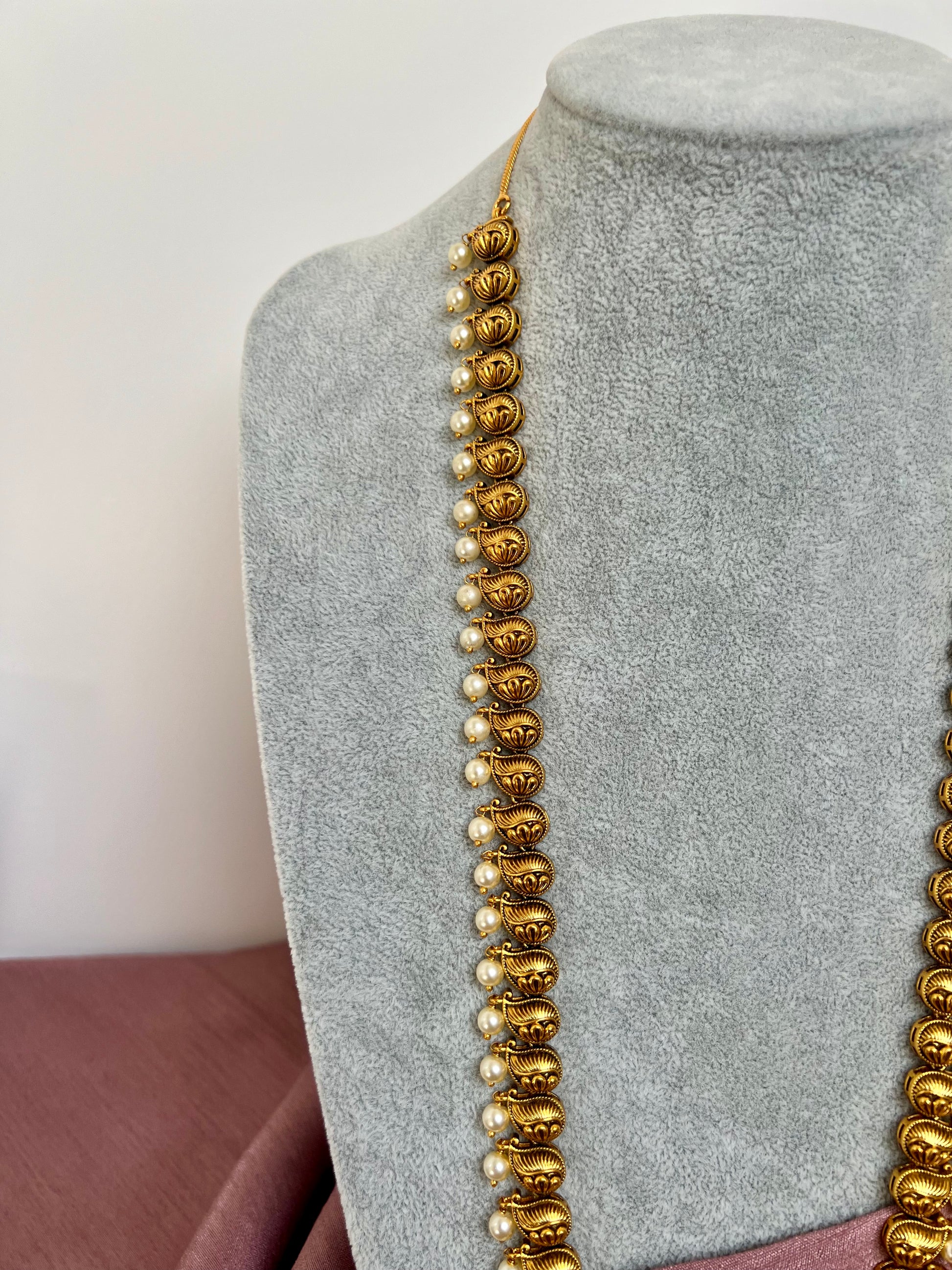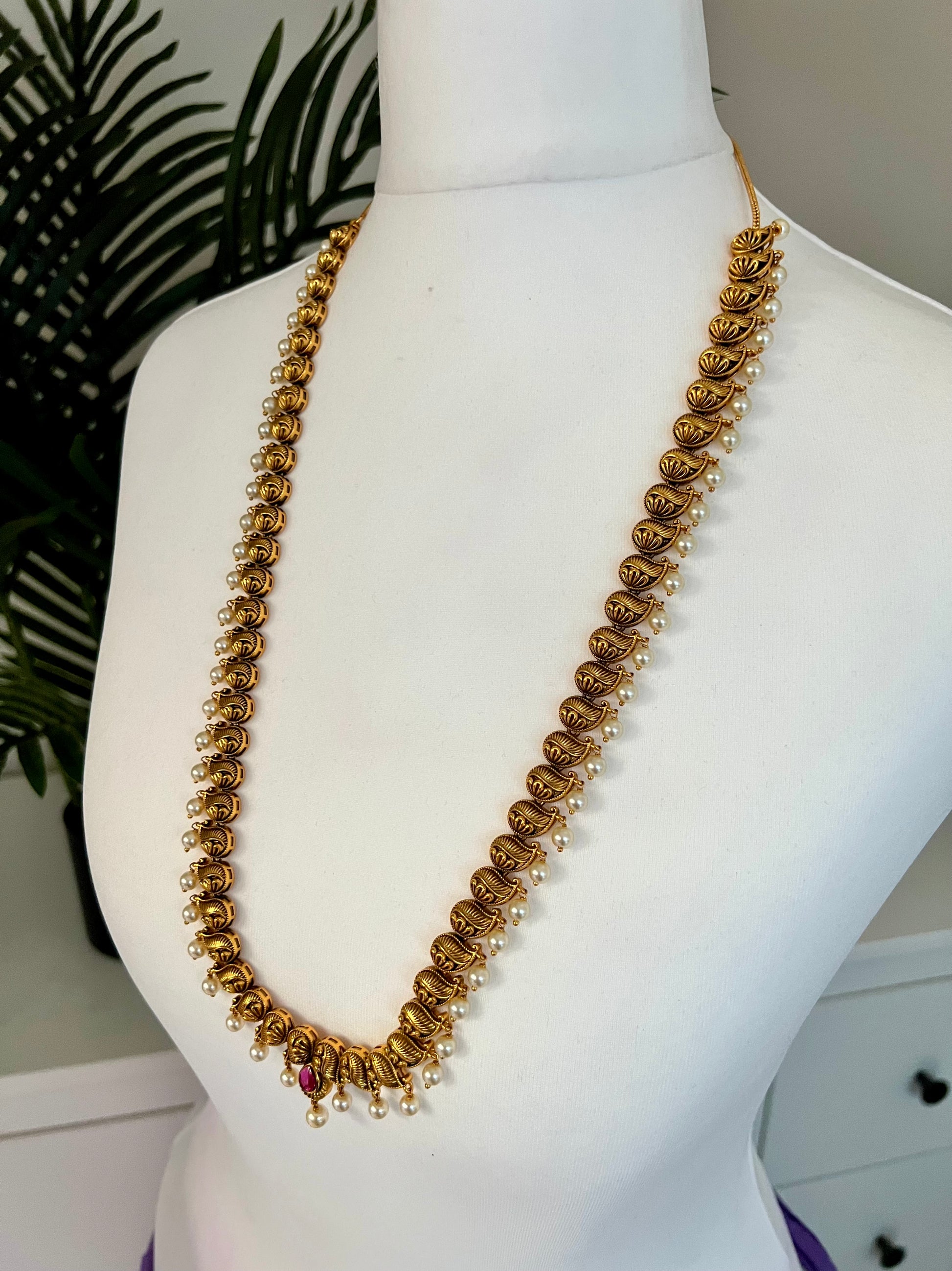 Long antique matte gold plated necklace with earrings. Pearls are seen on the entire necklace made of mango shaped motifs and earrings, a ruby stone at the centre of the piece making it one beautiful necklace to wear for your next occasion.