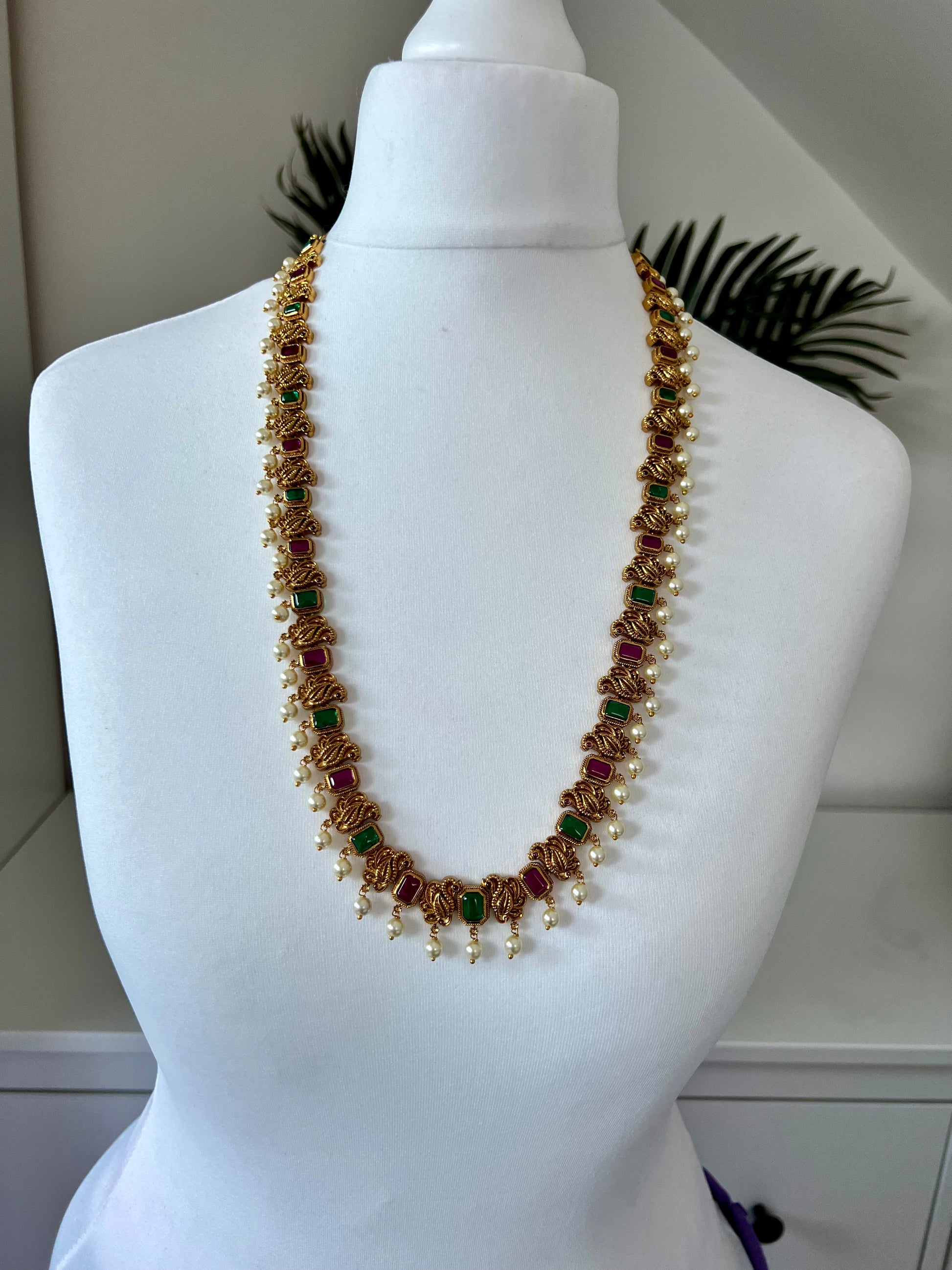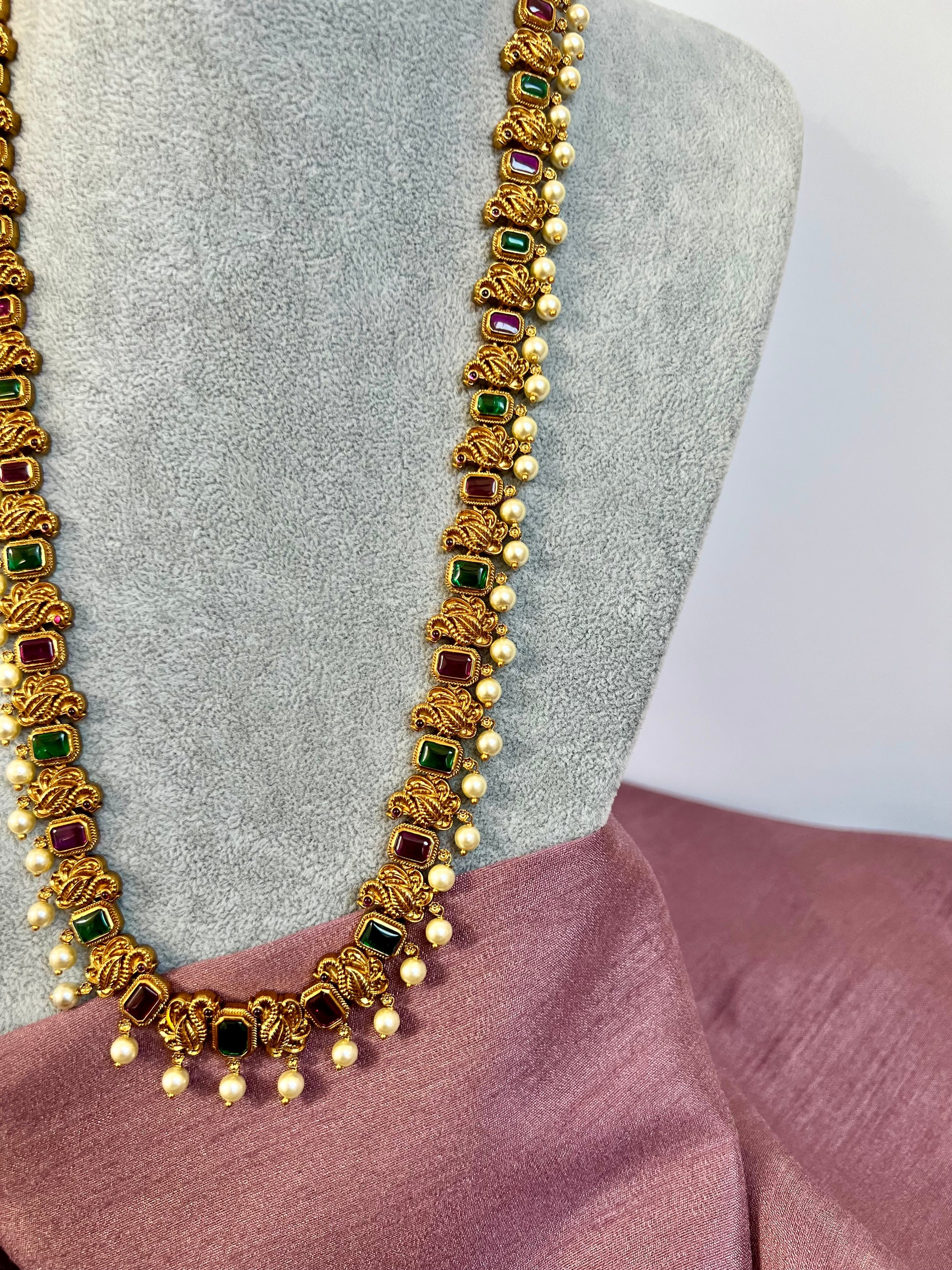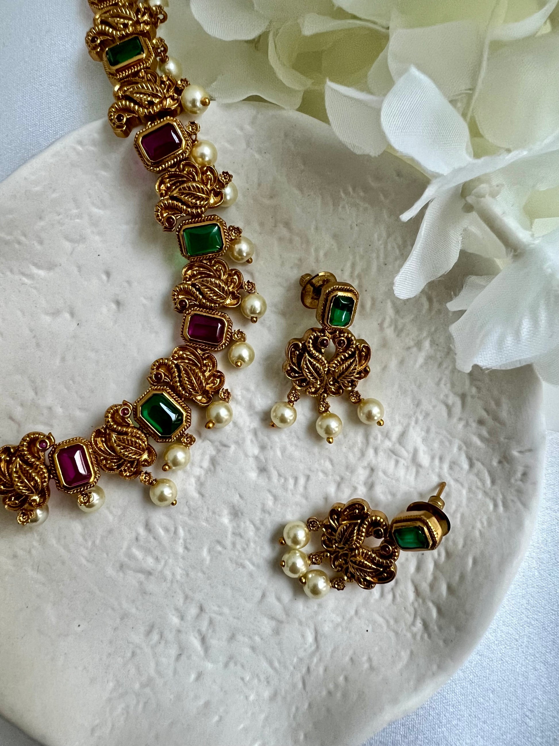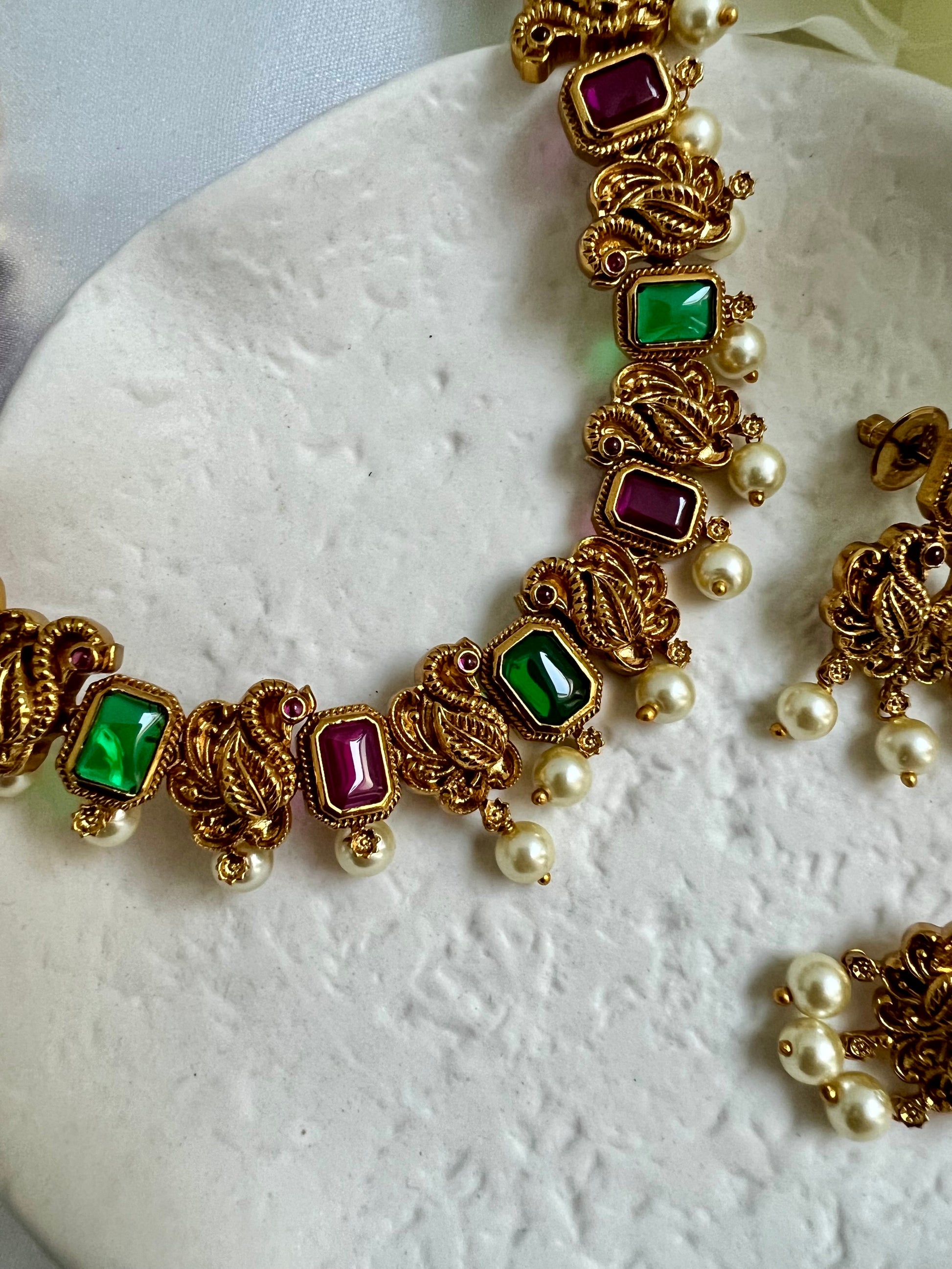 This beautiful piece is made up of a matte gold plated base with peacocks along the entire chain and embellished with ruby and green stones and dangling pearls, matching earrings are included.