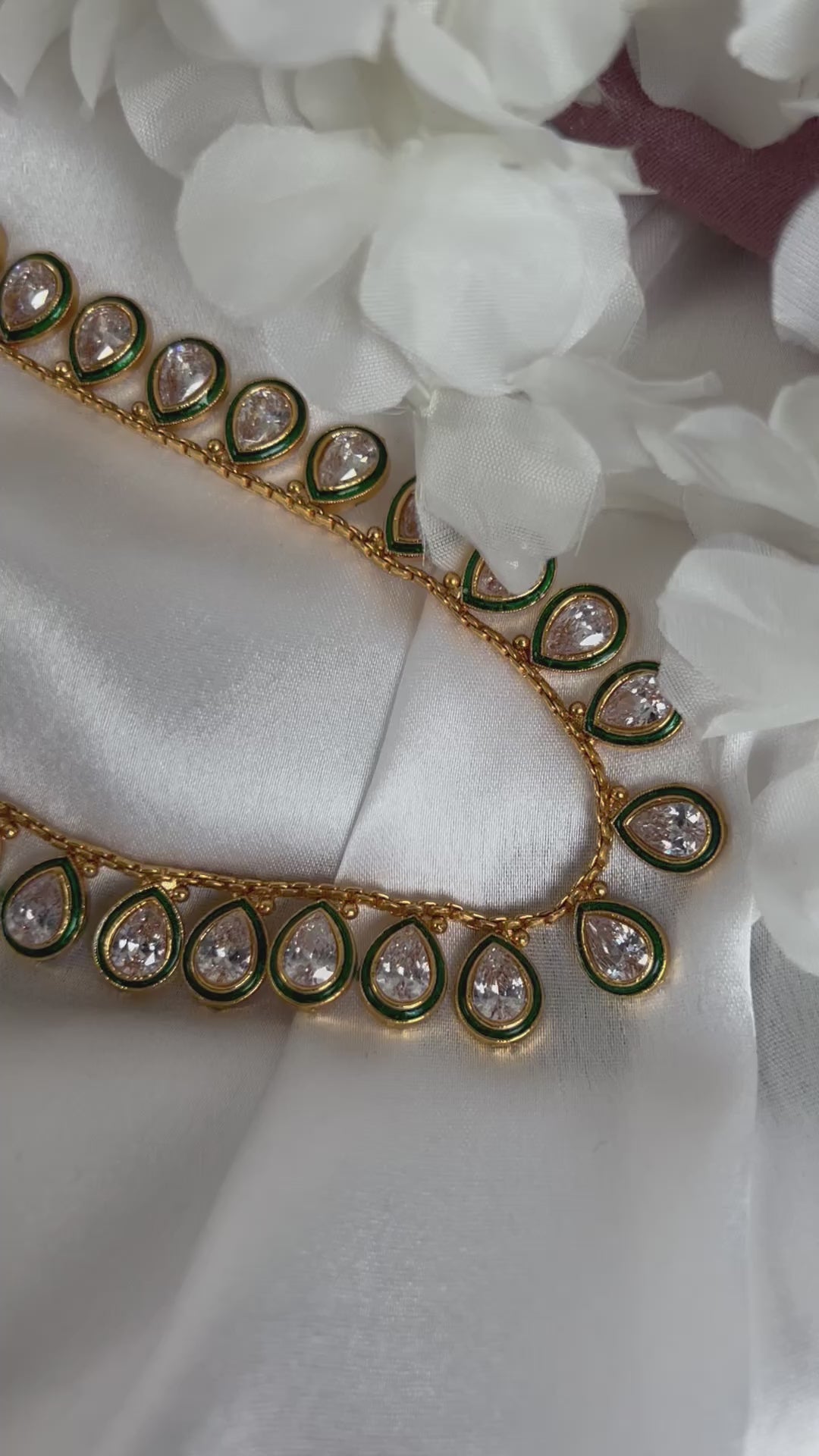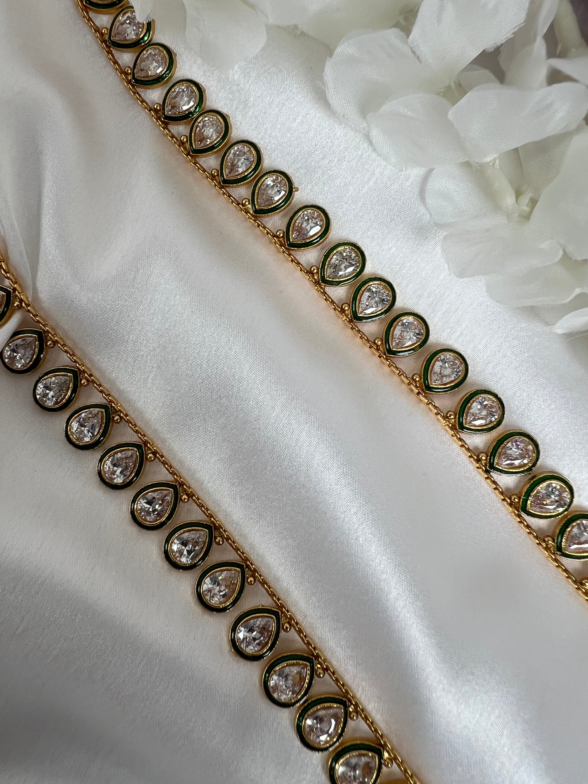 Antique waistchain with big tear drop shaped white stones encased in a golden frame green and painted in green.