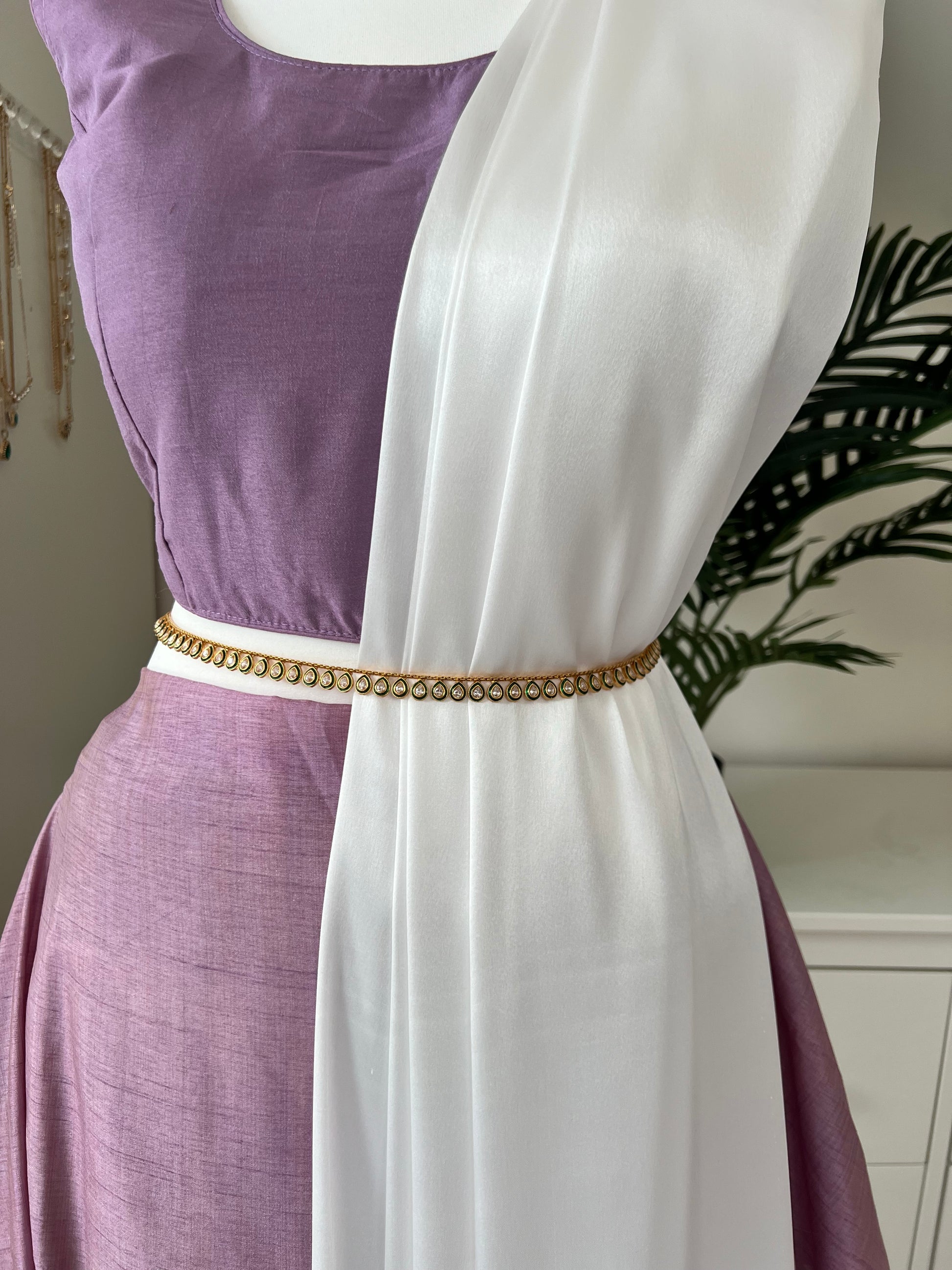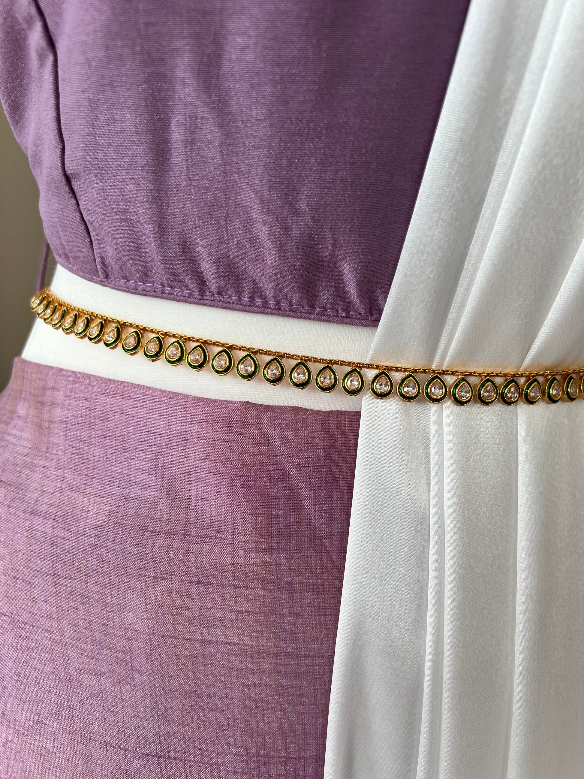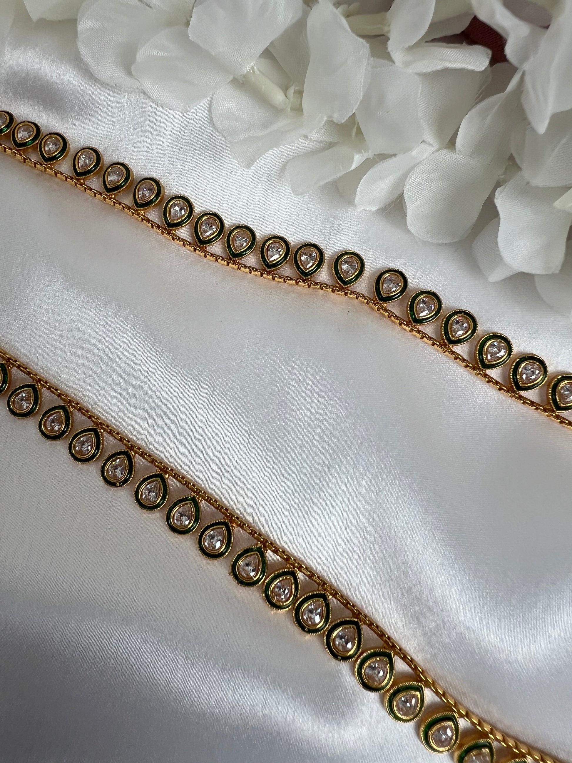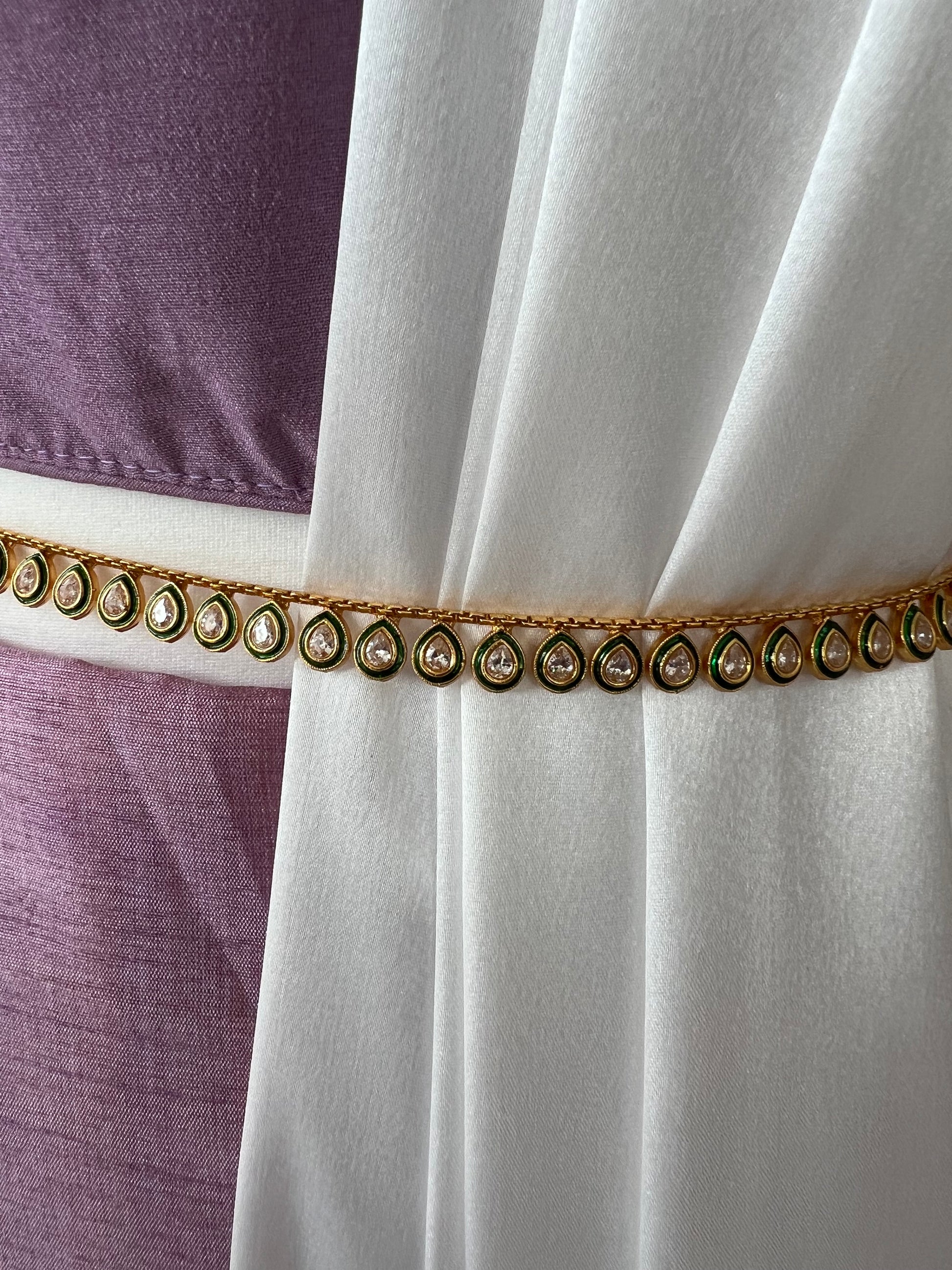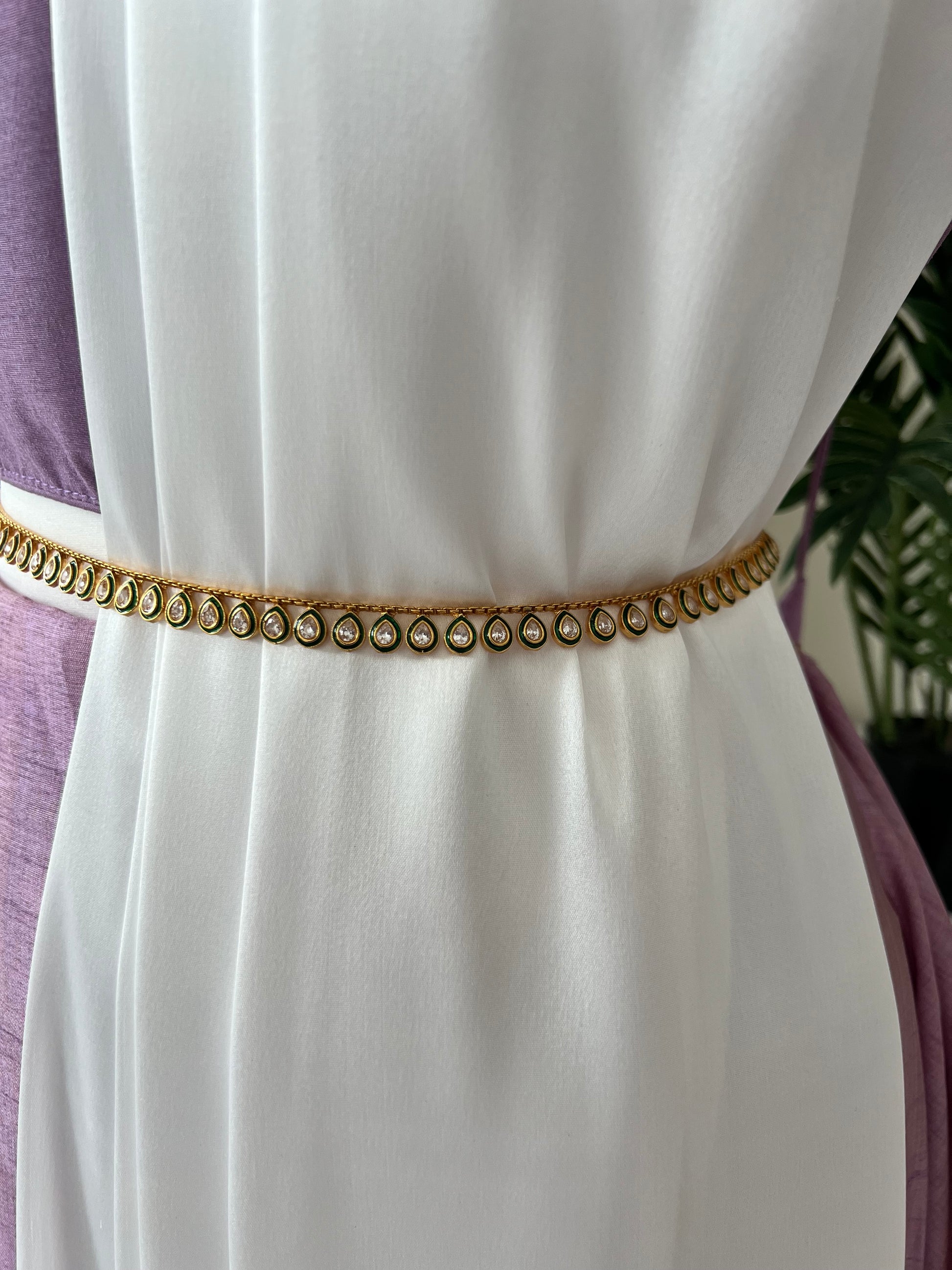 Antique green painted small tear drop white stoned, gold plated waistchain W3002