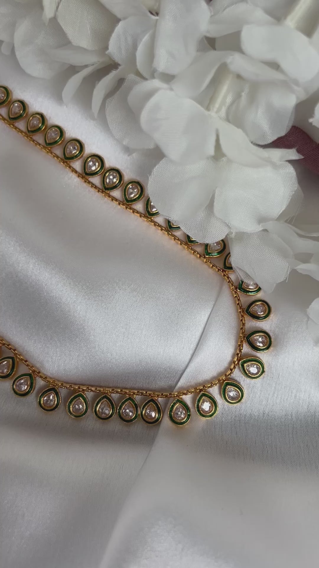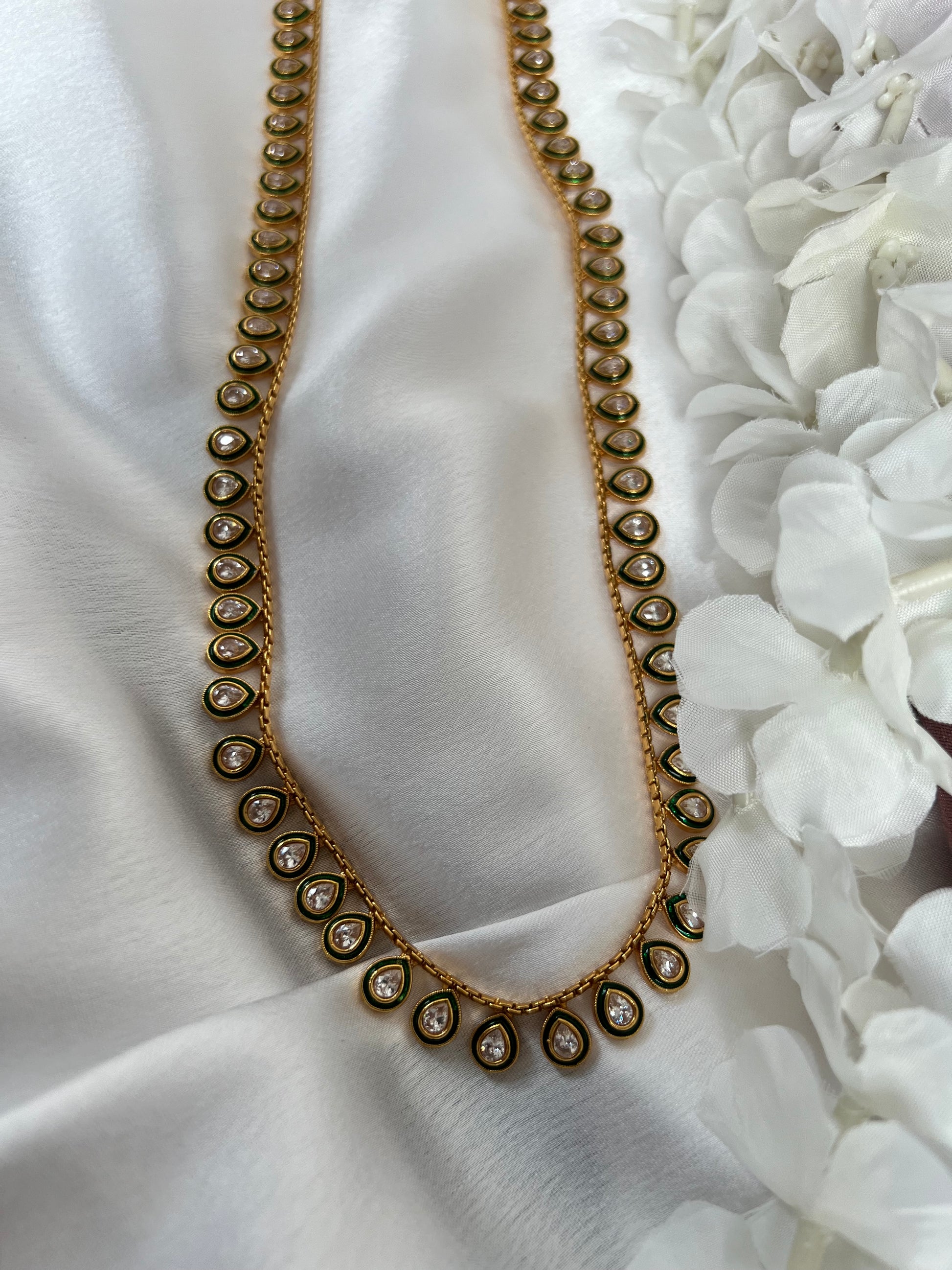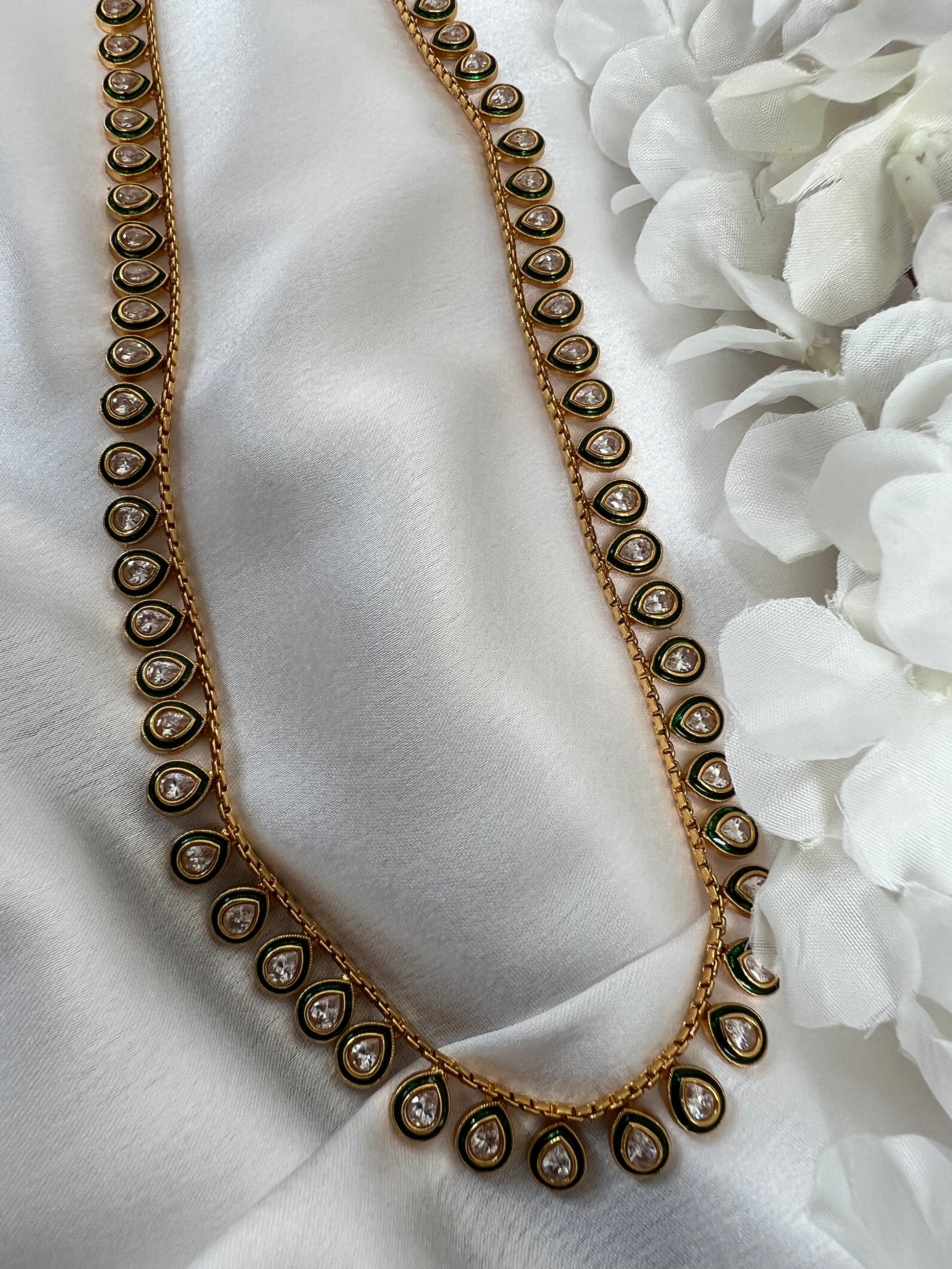Antique waistchain with small tear drop shaped white stones encased in a golden frame and painted in green.