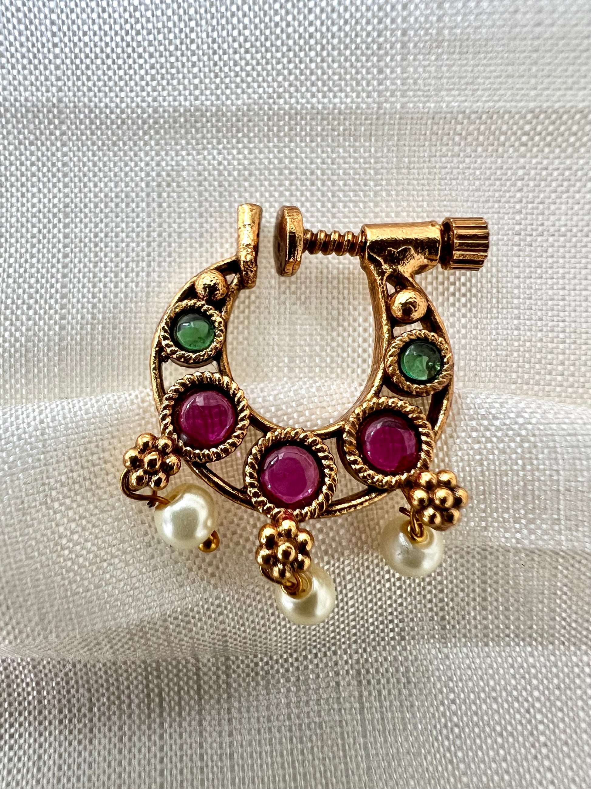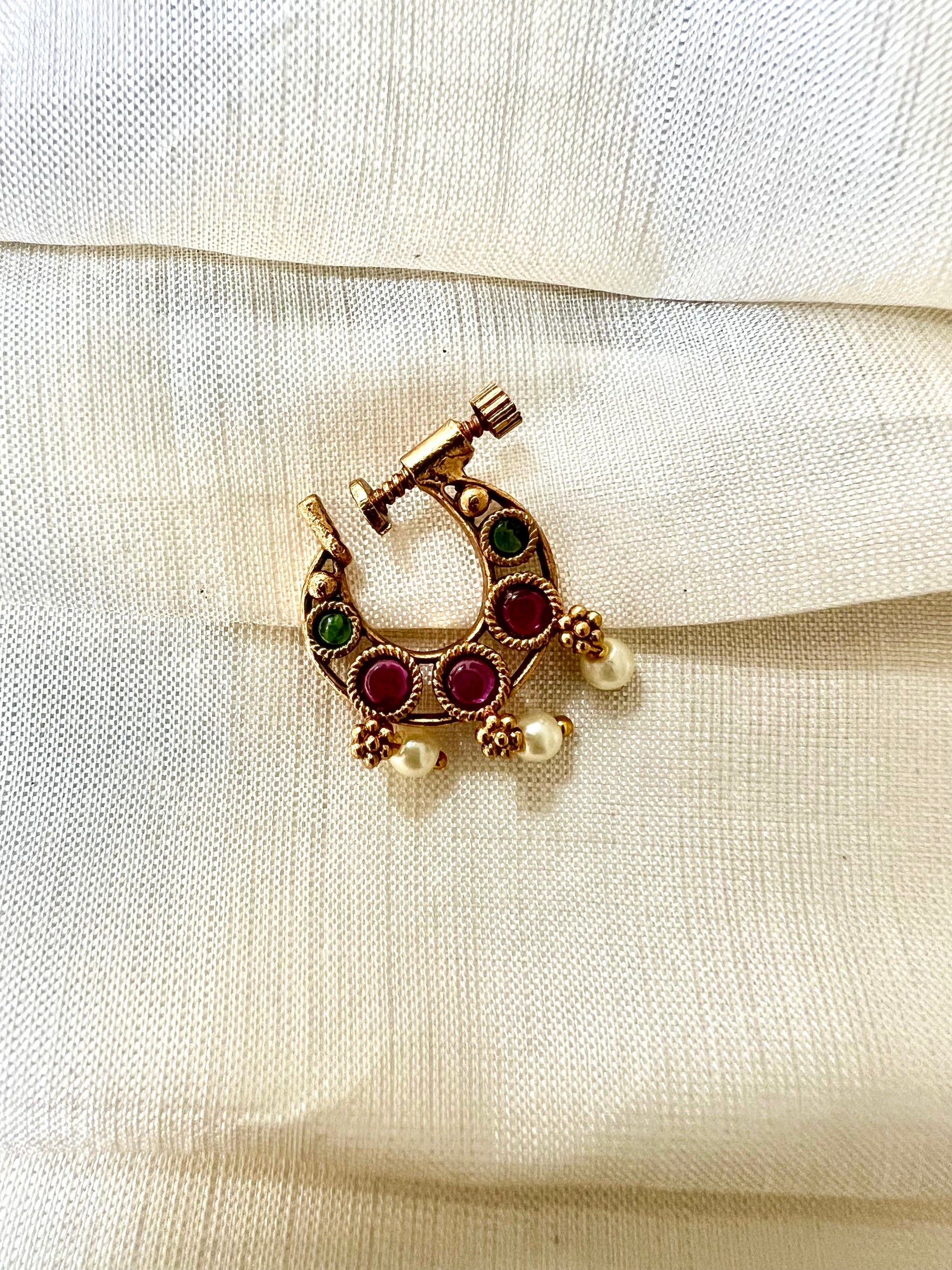 A beautiful gold plated nosering embellished with rubygreen stones and white pearls.
