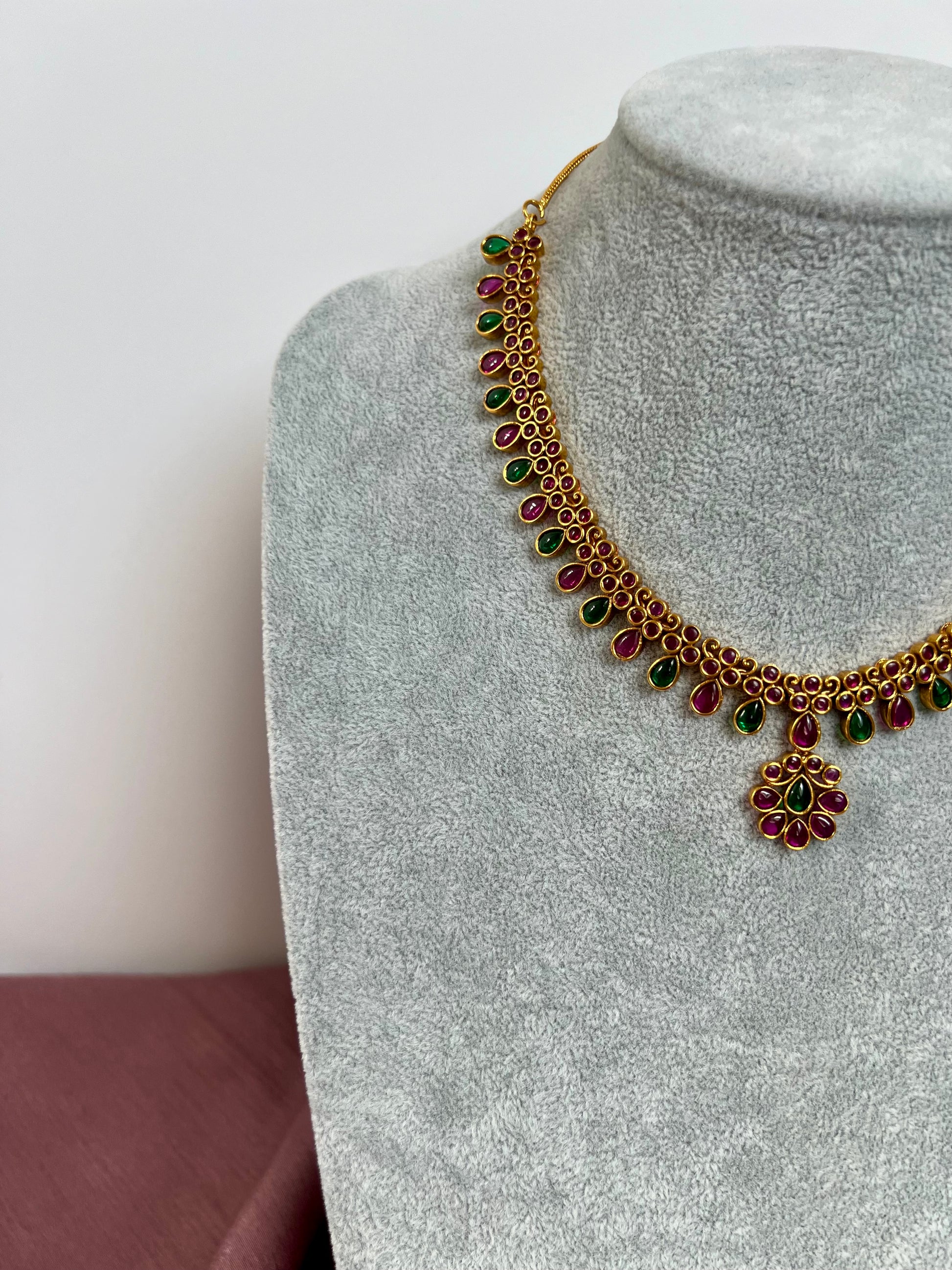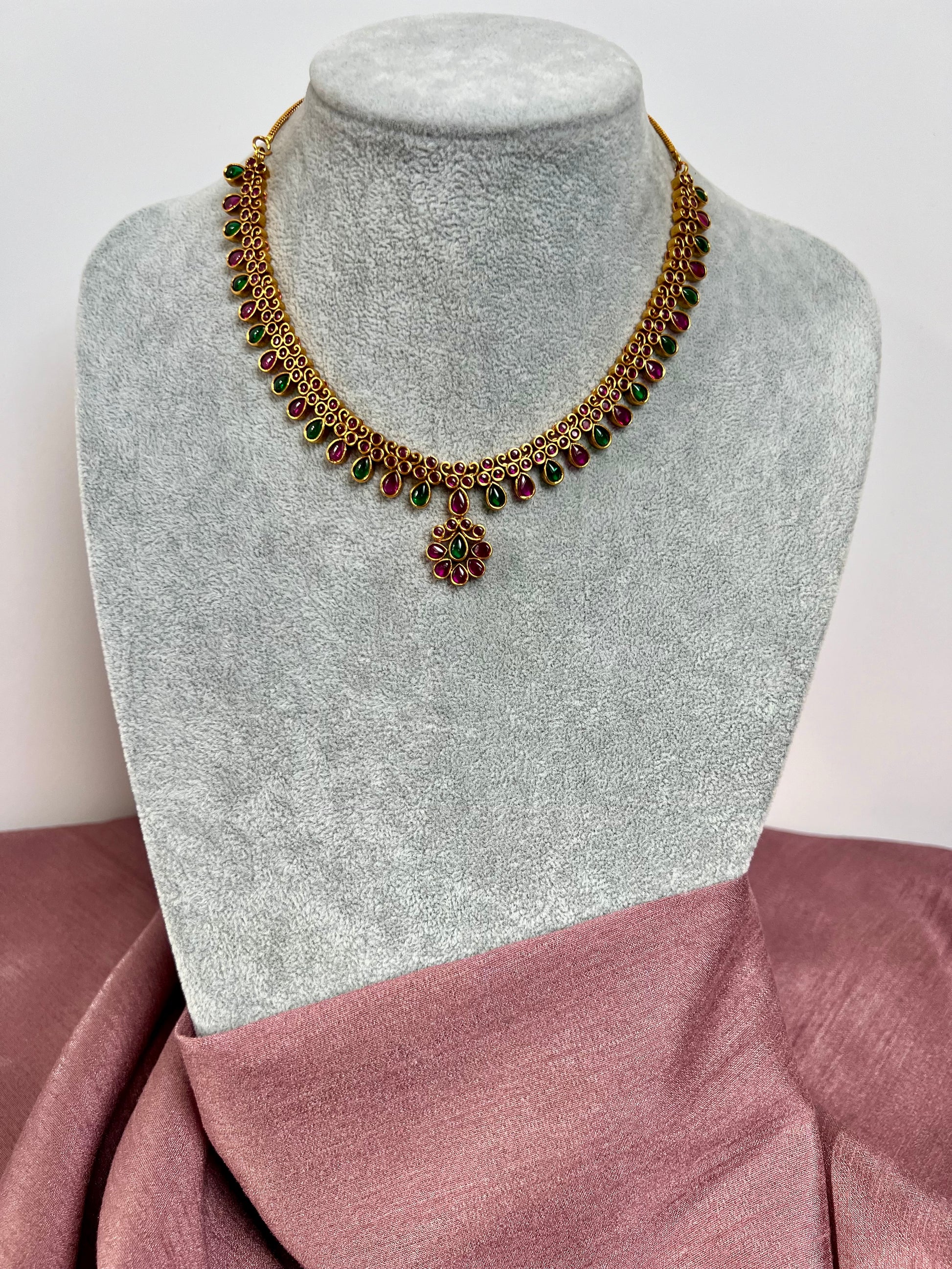 PAVITHRA - Antique rubygreen short necklace set with matching small earrings N3052