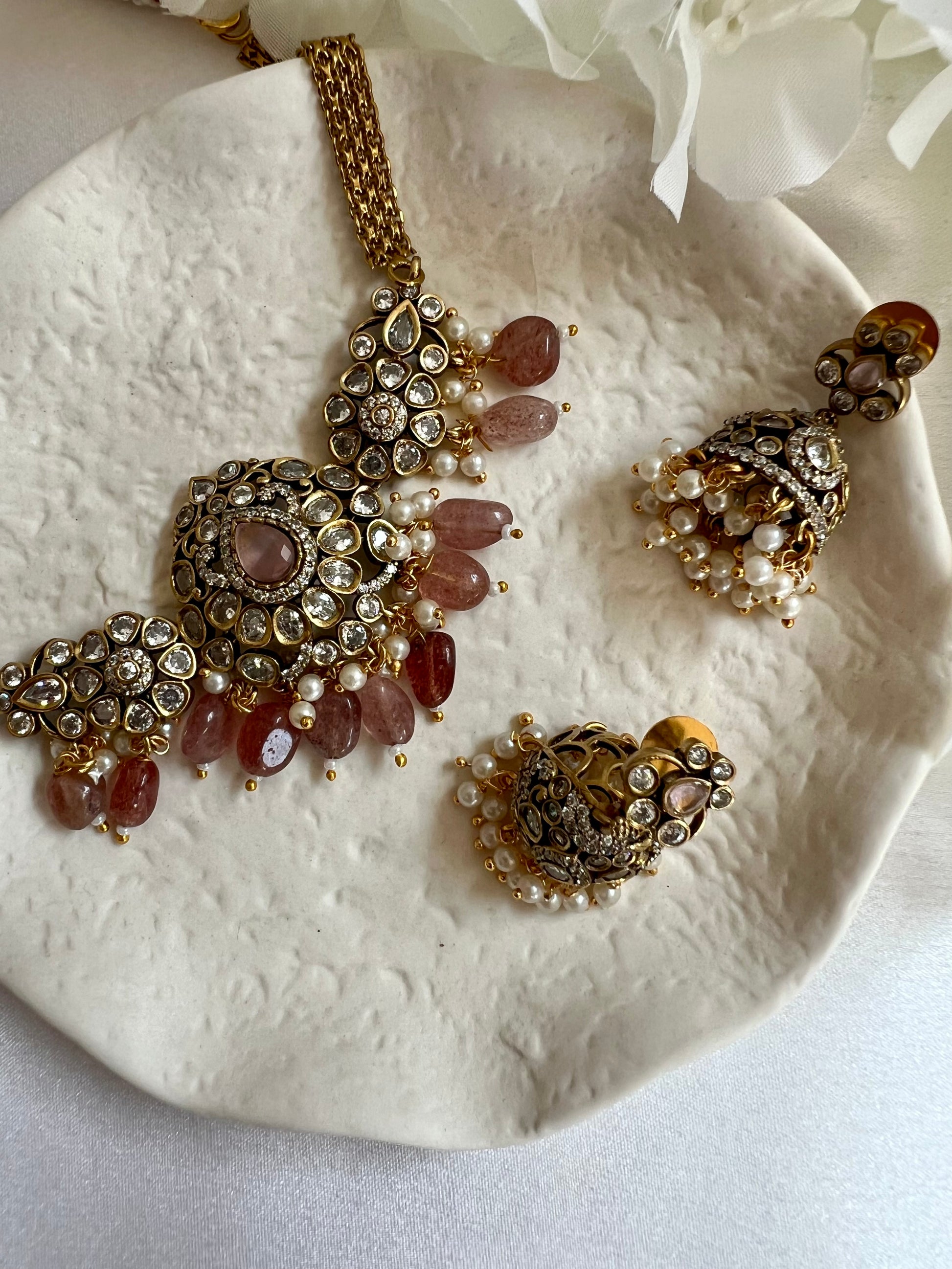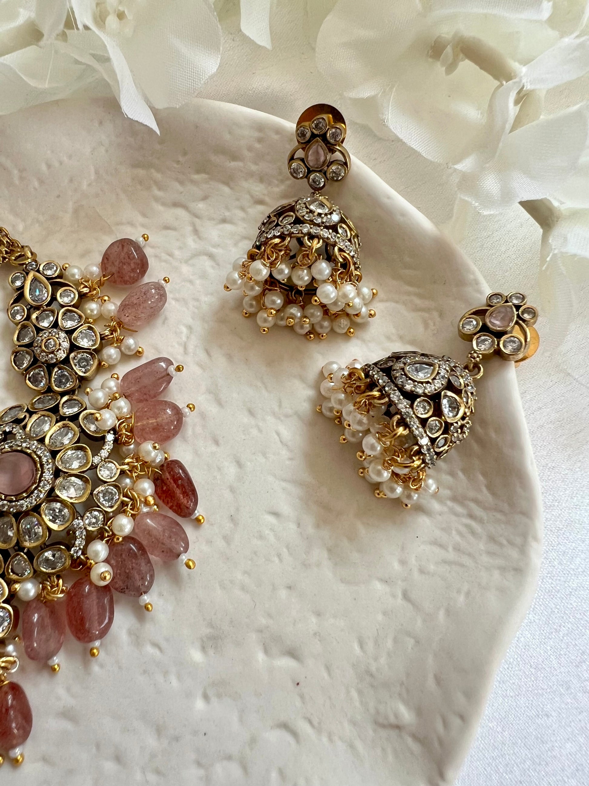 NANDINI - Small antique mehndi plated white stone with pink and white pearl choker and jhumkas N3099