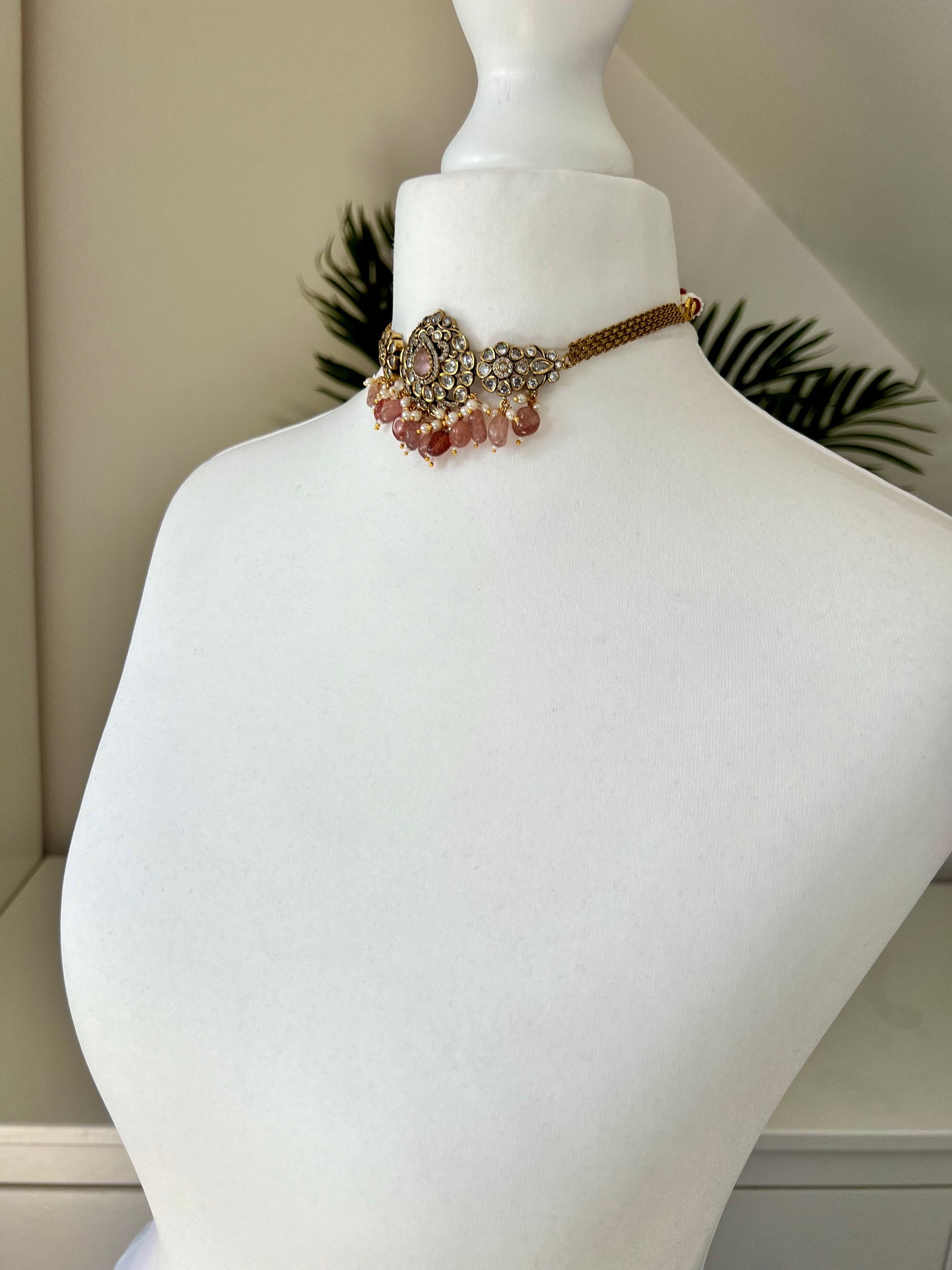 Simple small choker set in pink large stones and small white pearl, the choker is embellished with white stones and the gold is an antique dark gold.