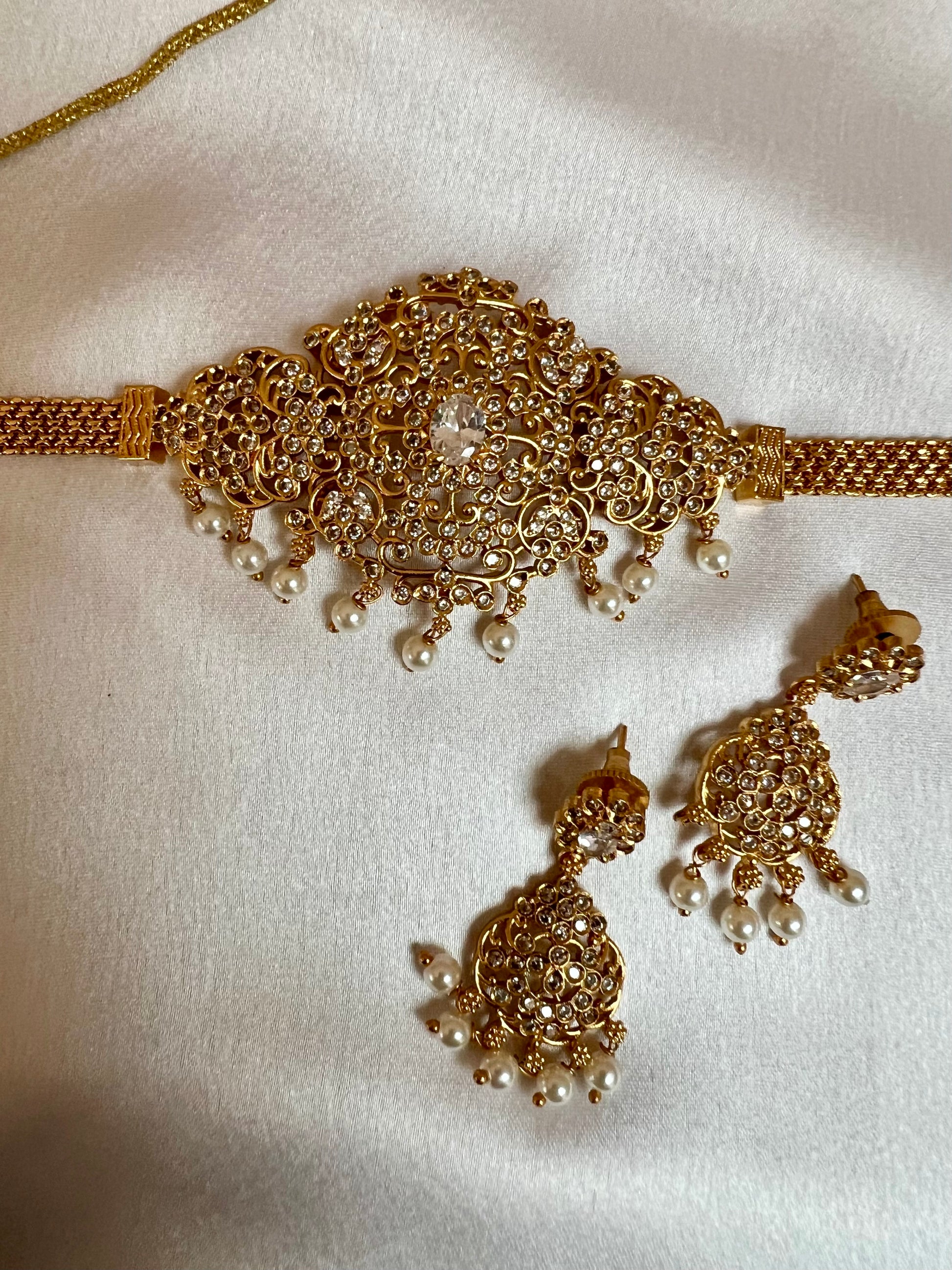 A sturdy non flexible white stones choker and dangling white pearls, comes with matching flat earrings.