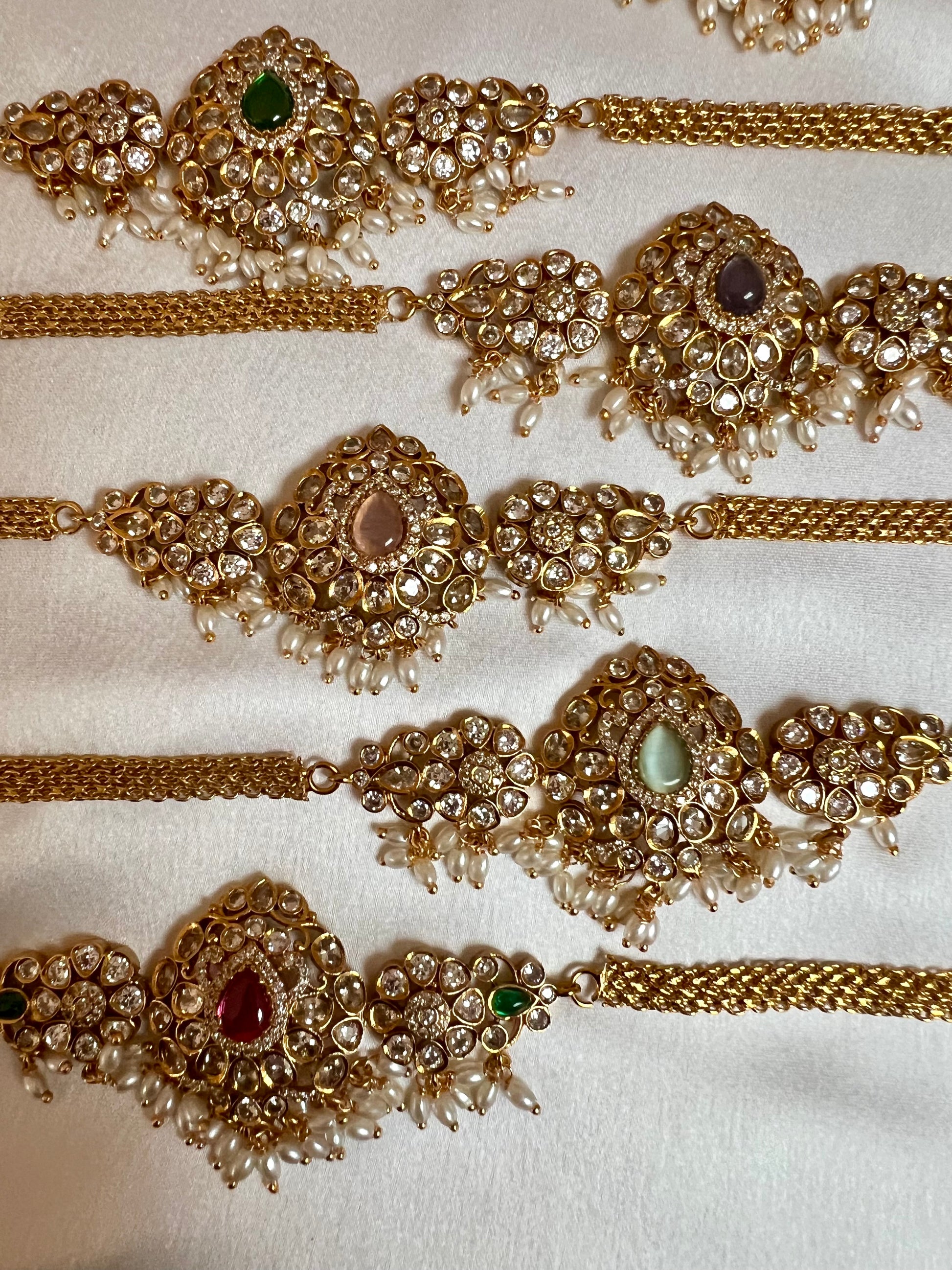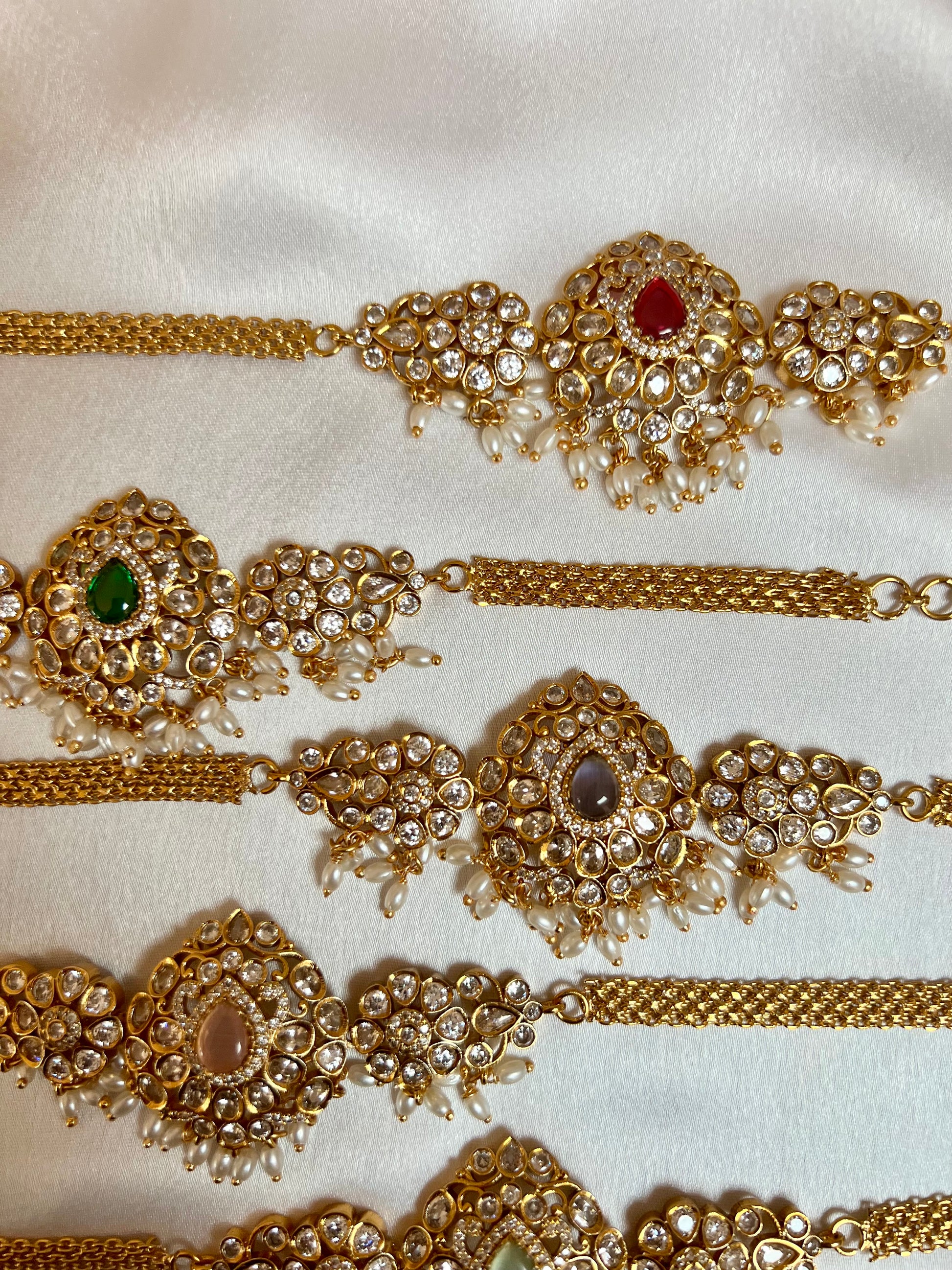 Beautiful small choker sets embellished with white stones and rice shaped pearls, comes with matching jhumkas. These choker sets come in six colours.