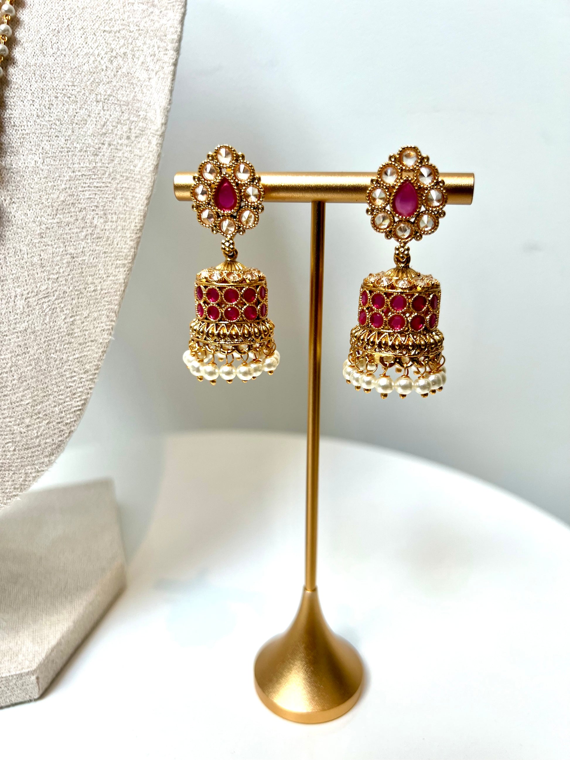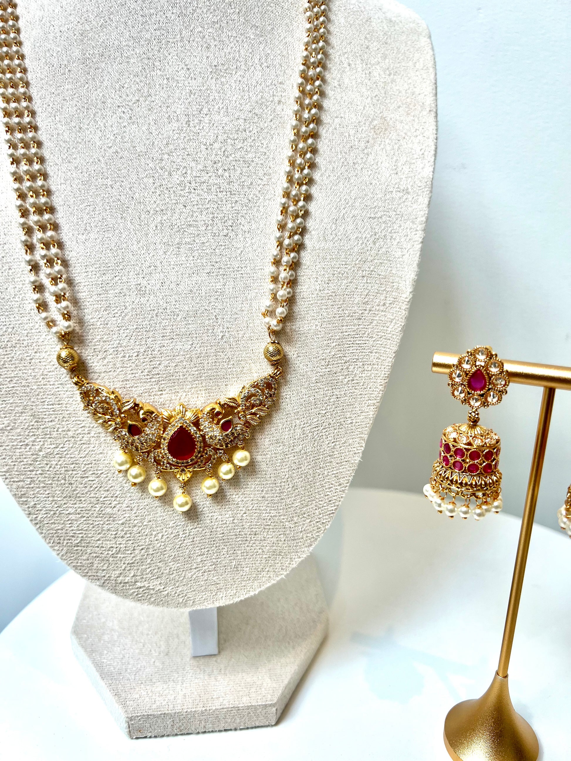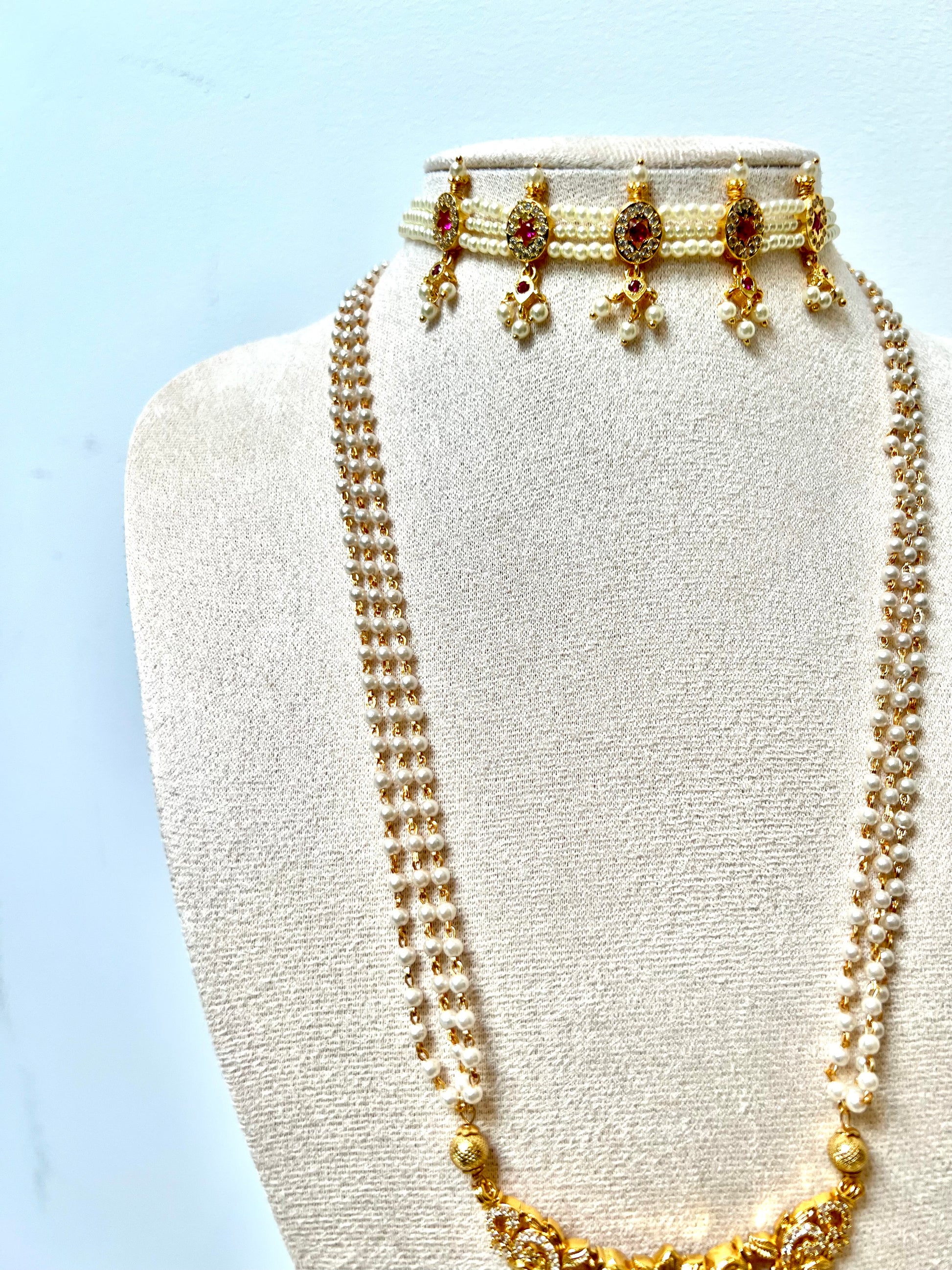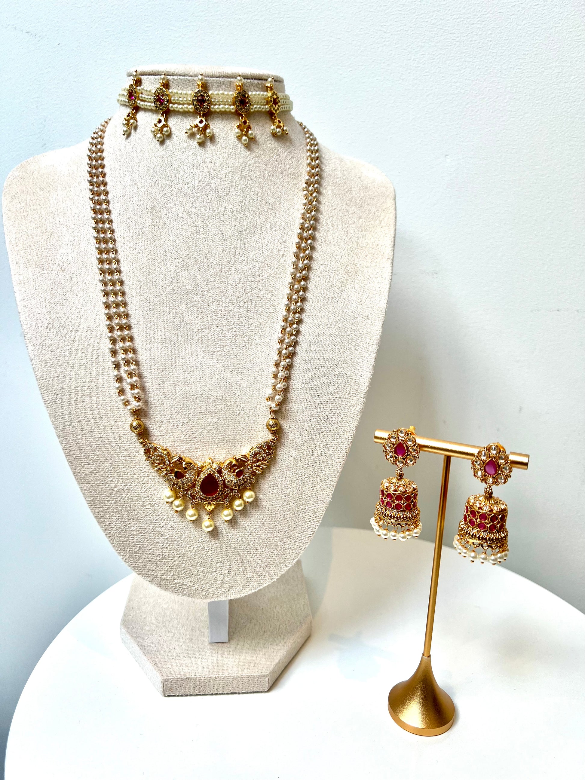 Beautiful impon choker with a long pearl necklaces, comes with matching ruby jhumkas