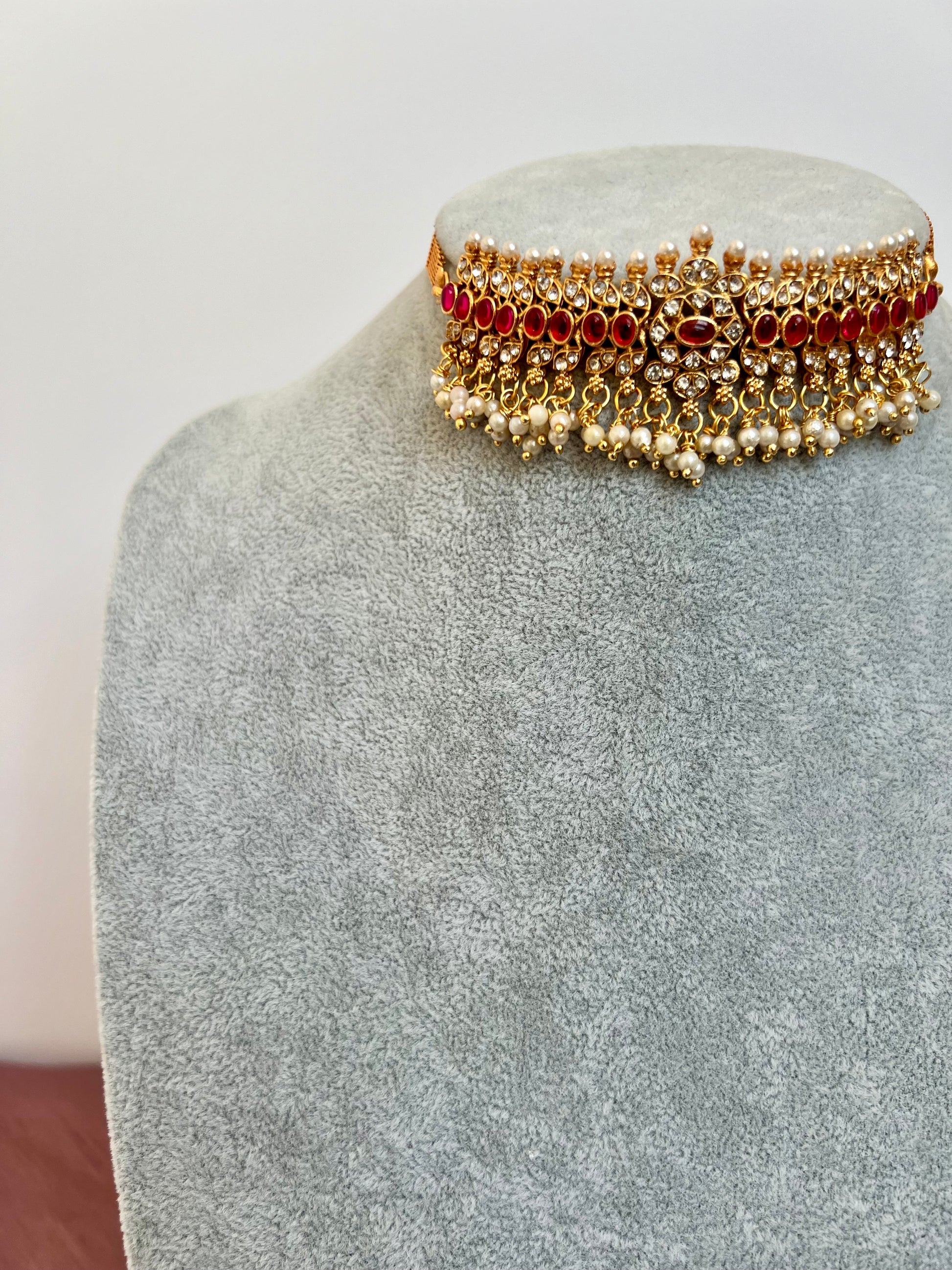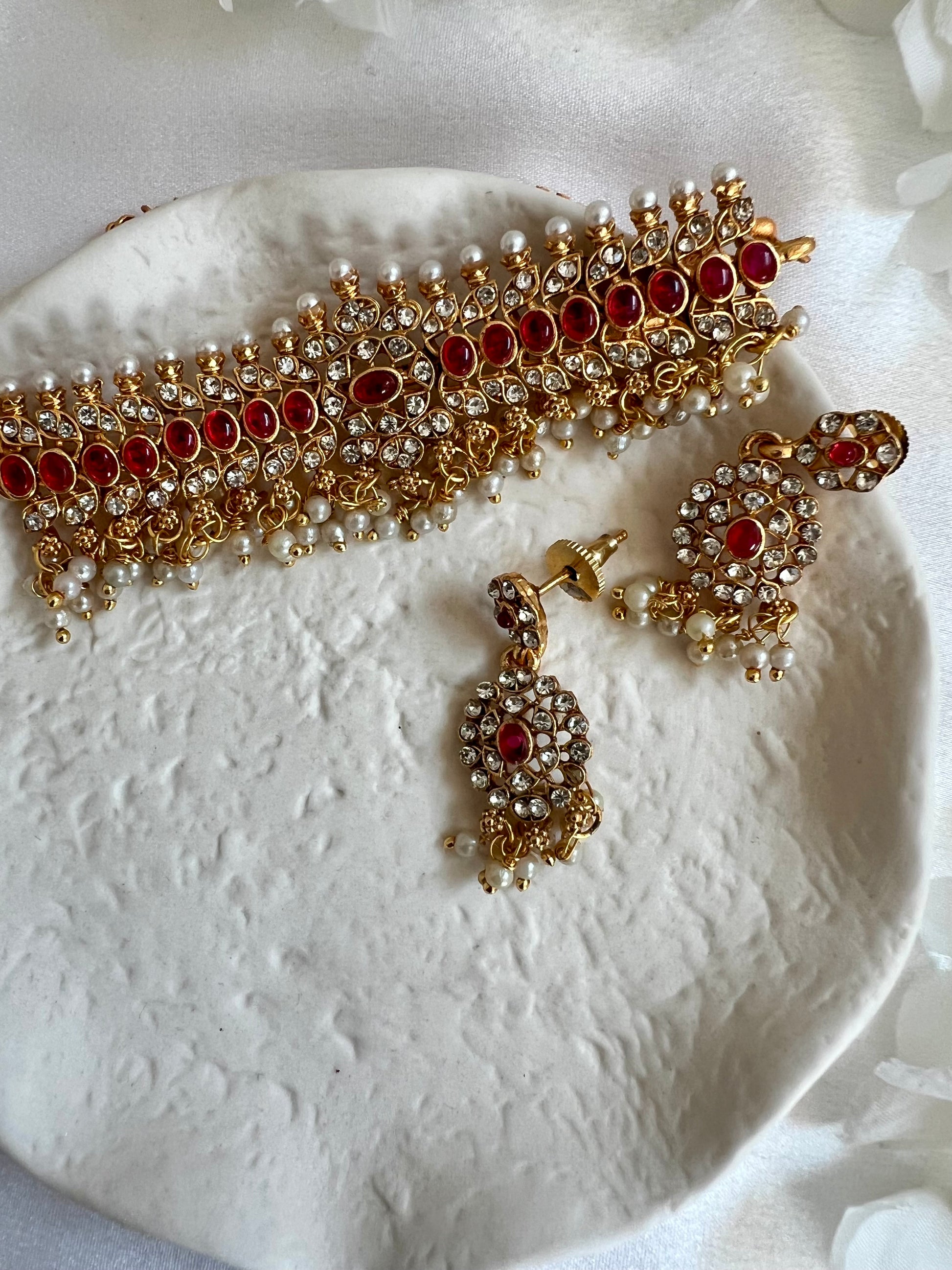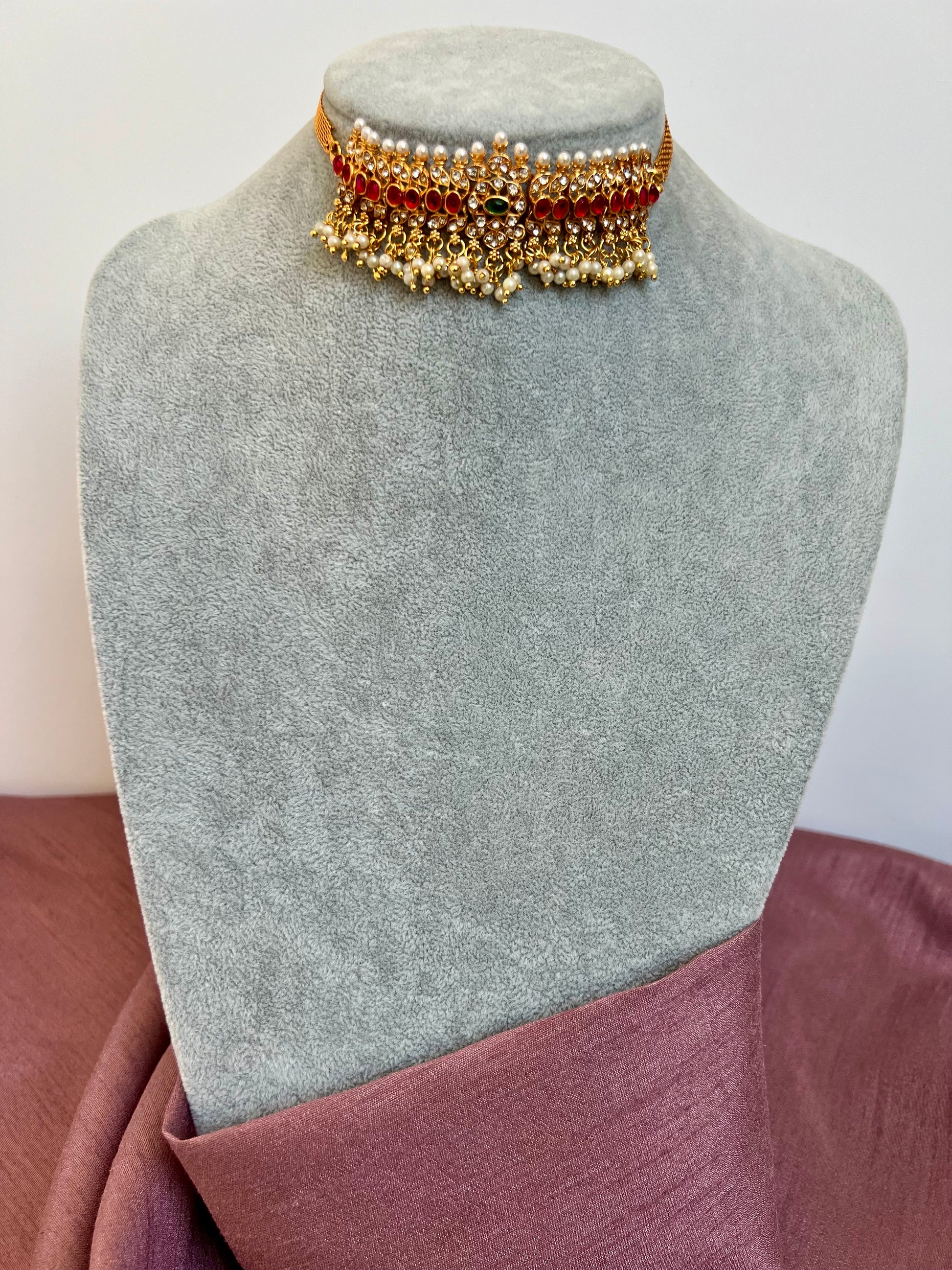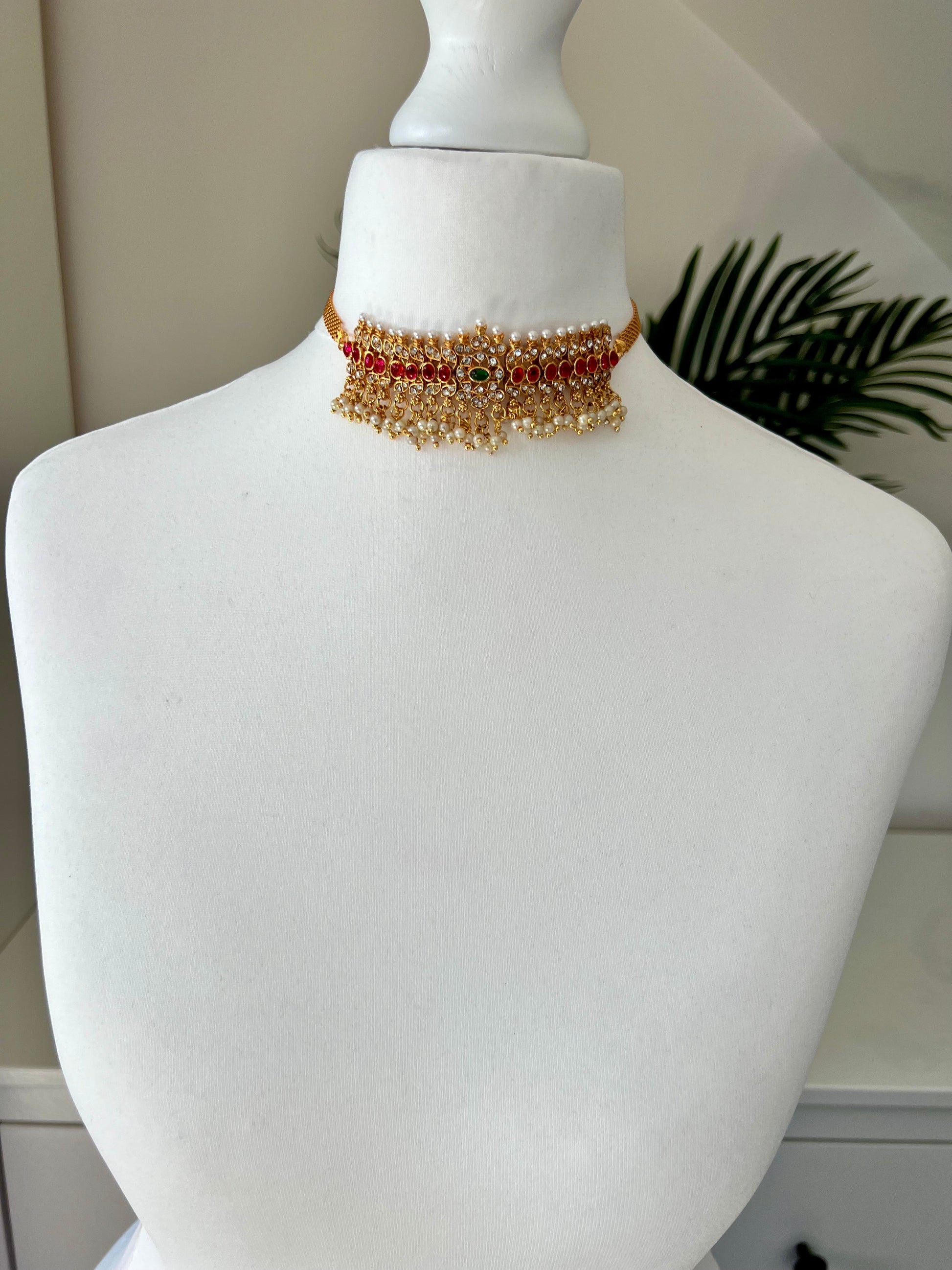 A beautiful small choker embellished with red/green stones or just red stones and dangling white pearls, comes with matching small flat earrings.