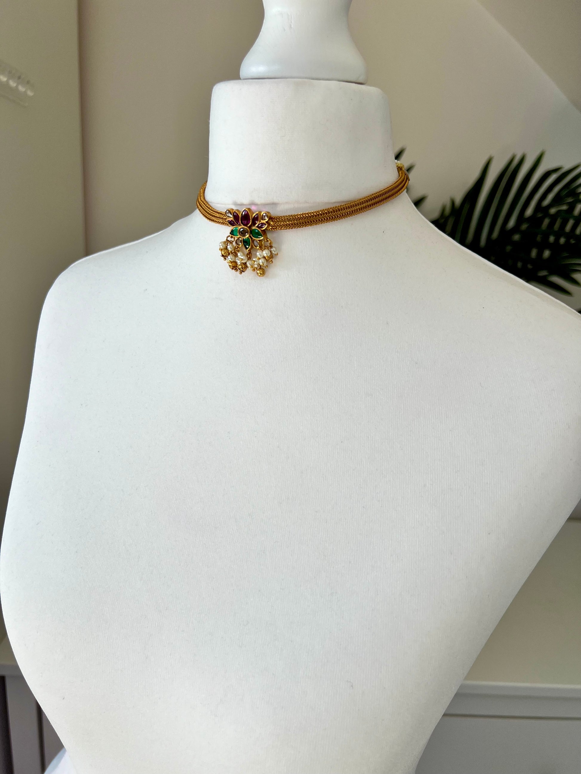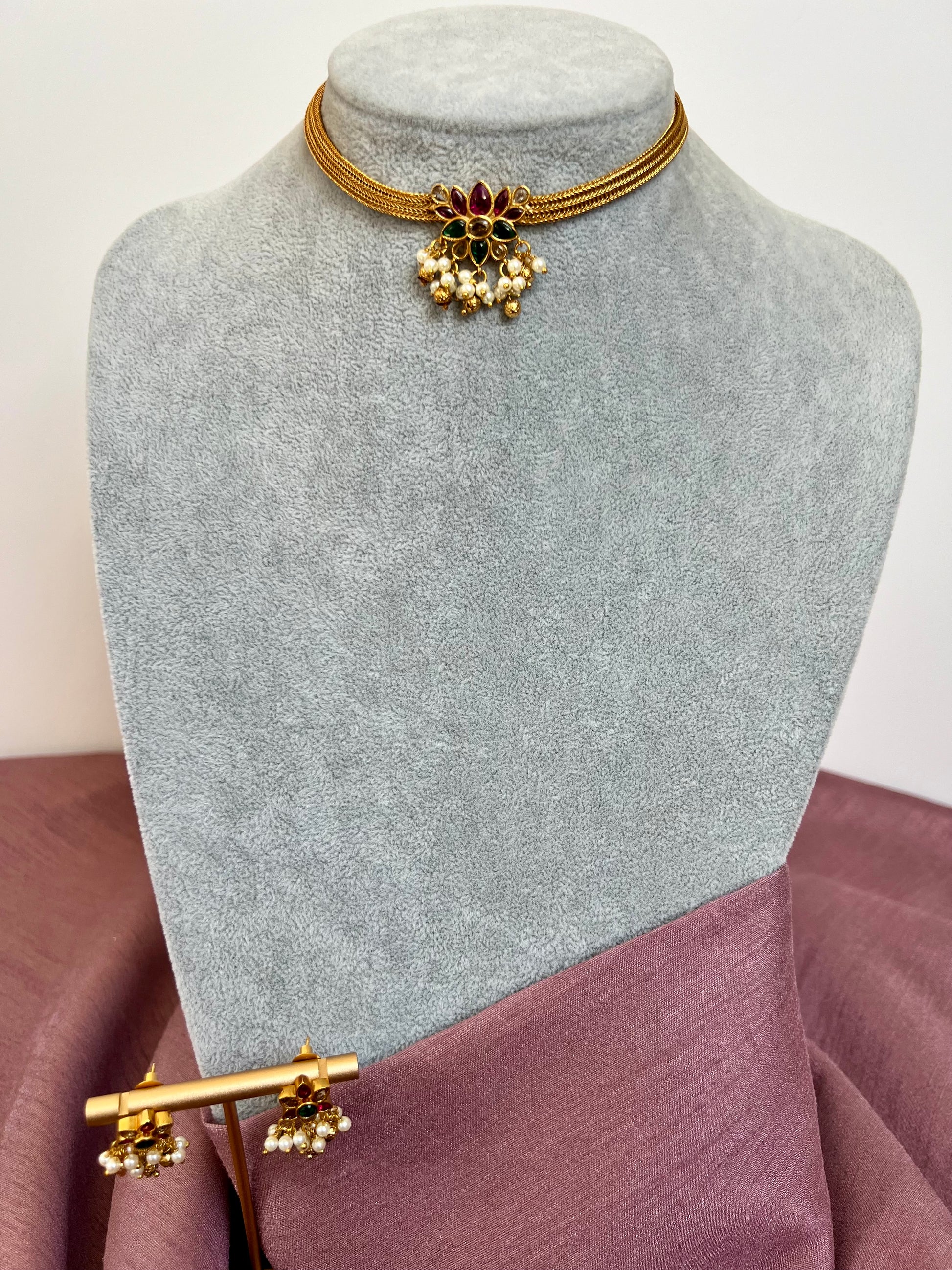 Small lotus choker embellished with ruby and green stones, and dangling pearls with small matching lotus earrings.