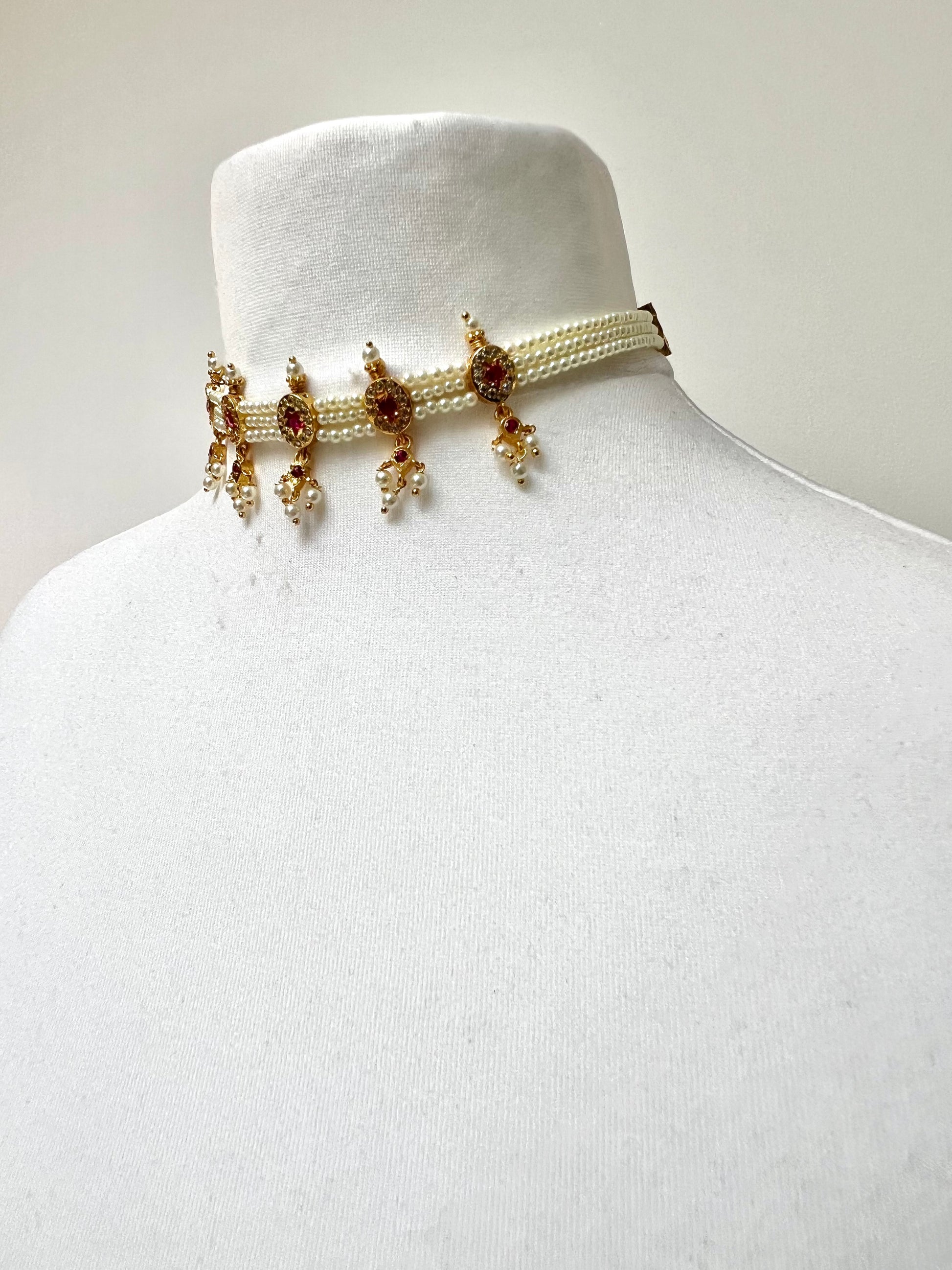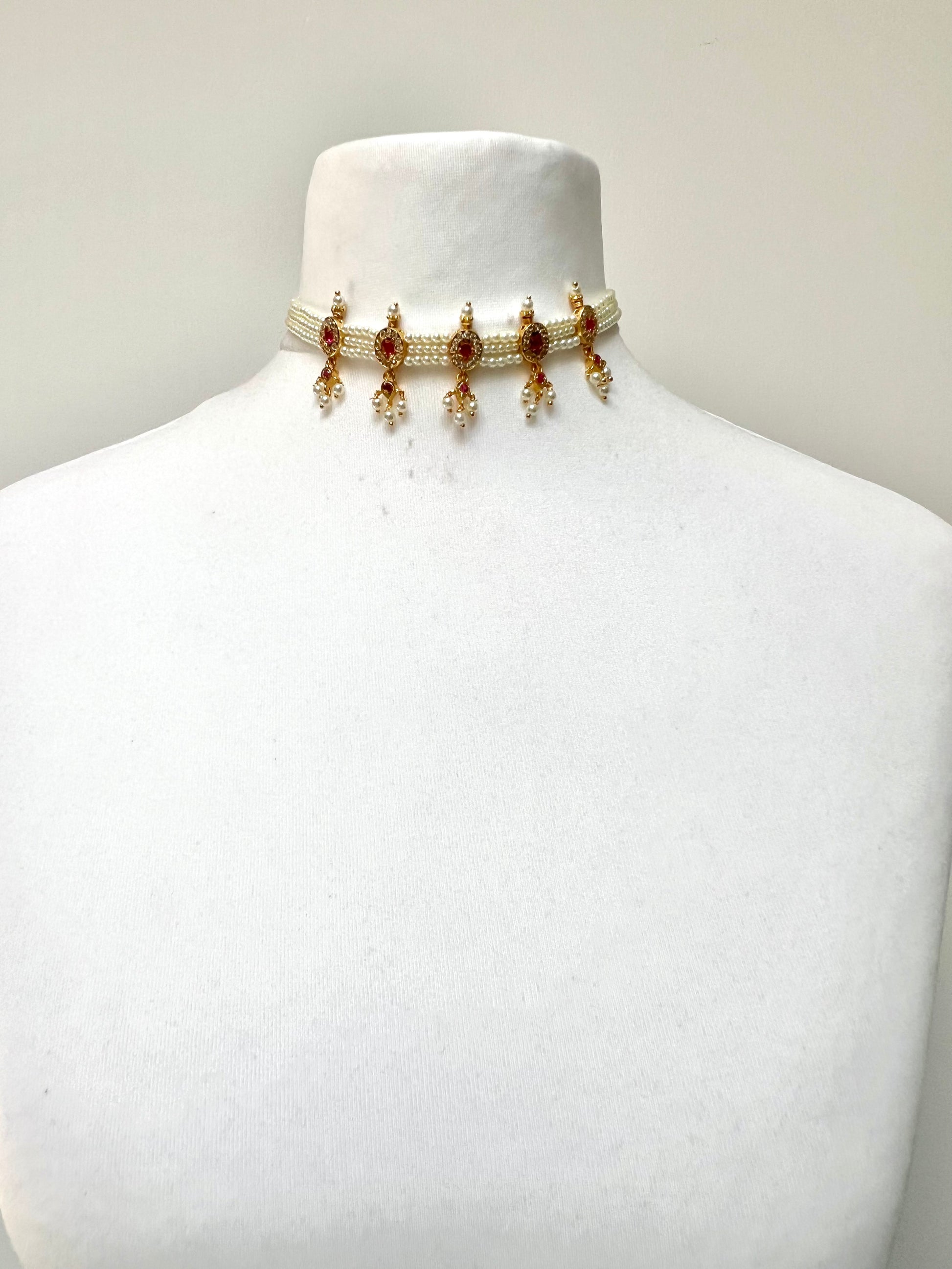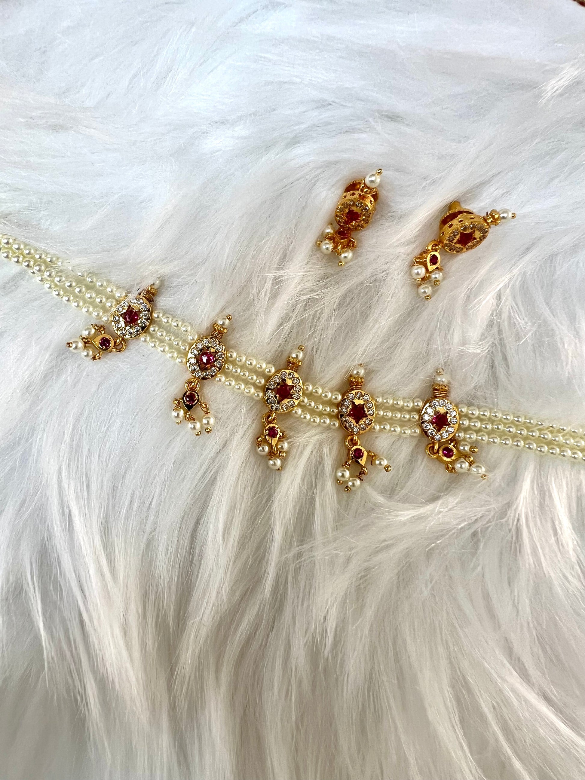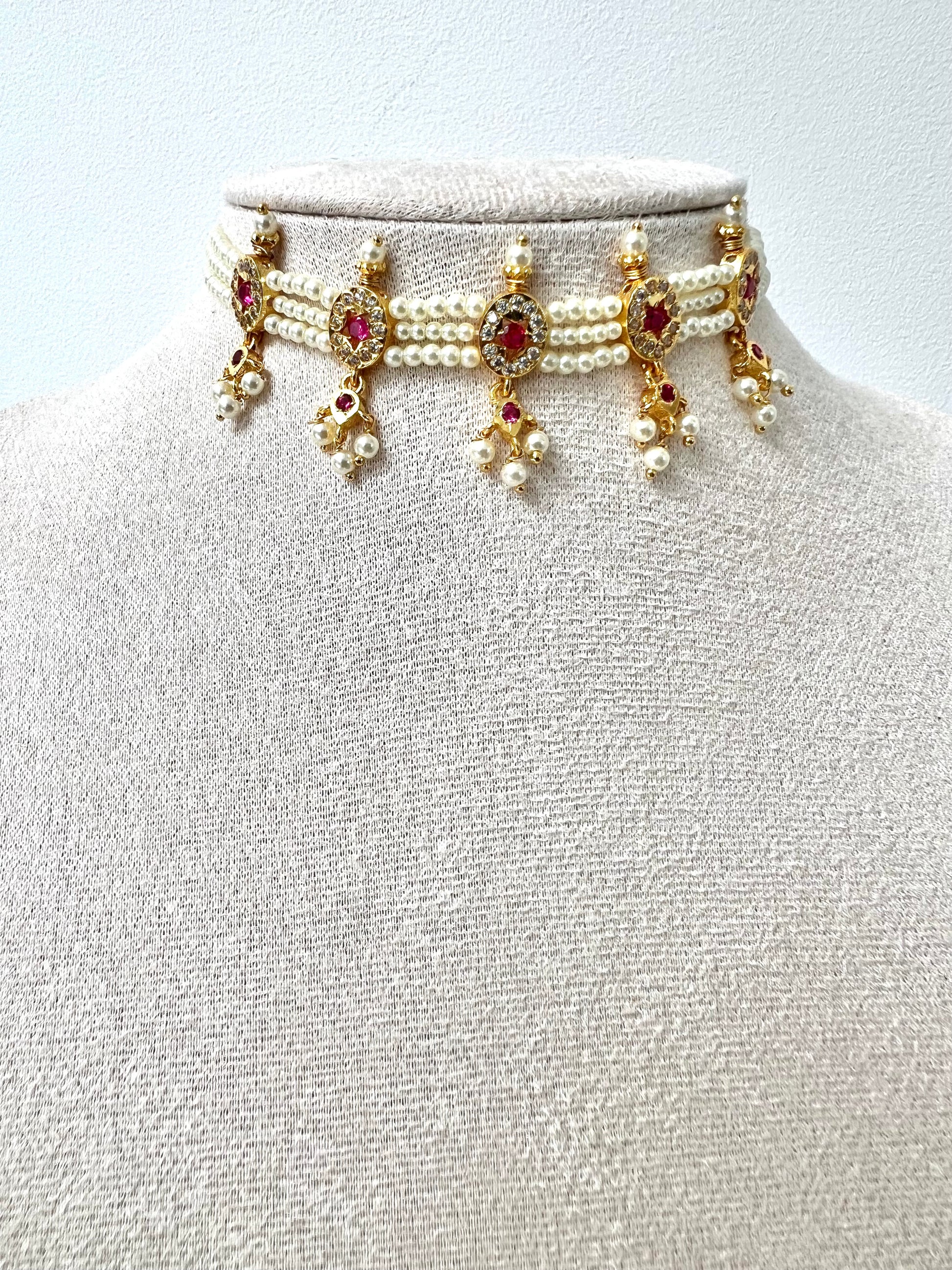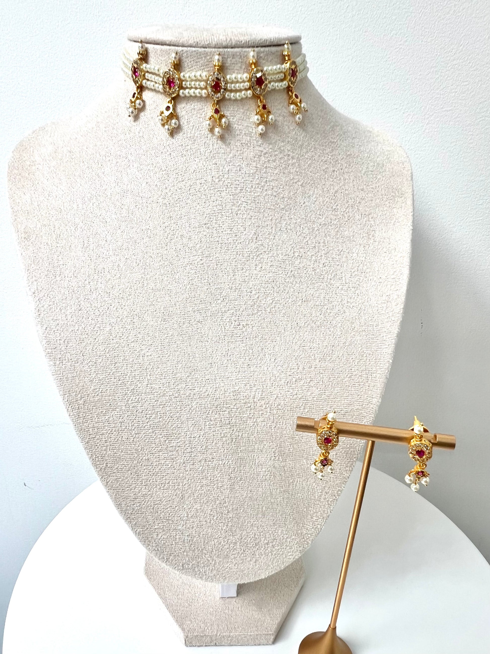 AADHIRA - Impon pearl choker in ruby and white stones with matching earrings N3266