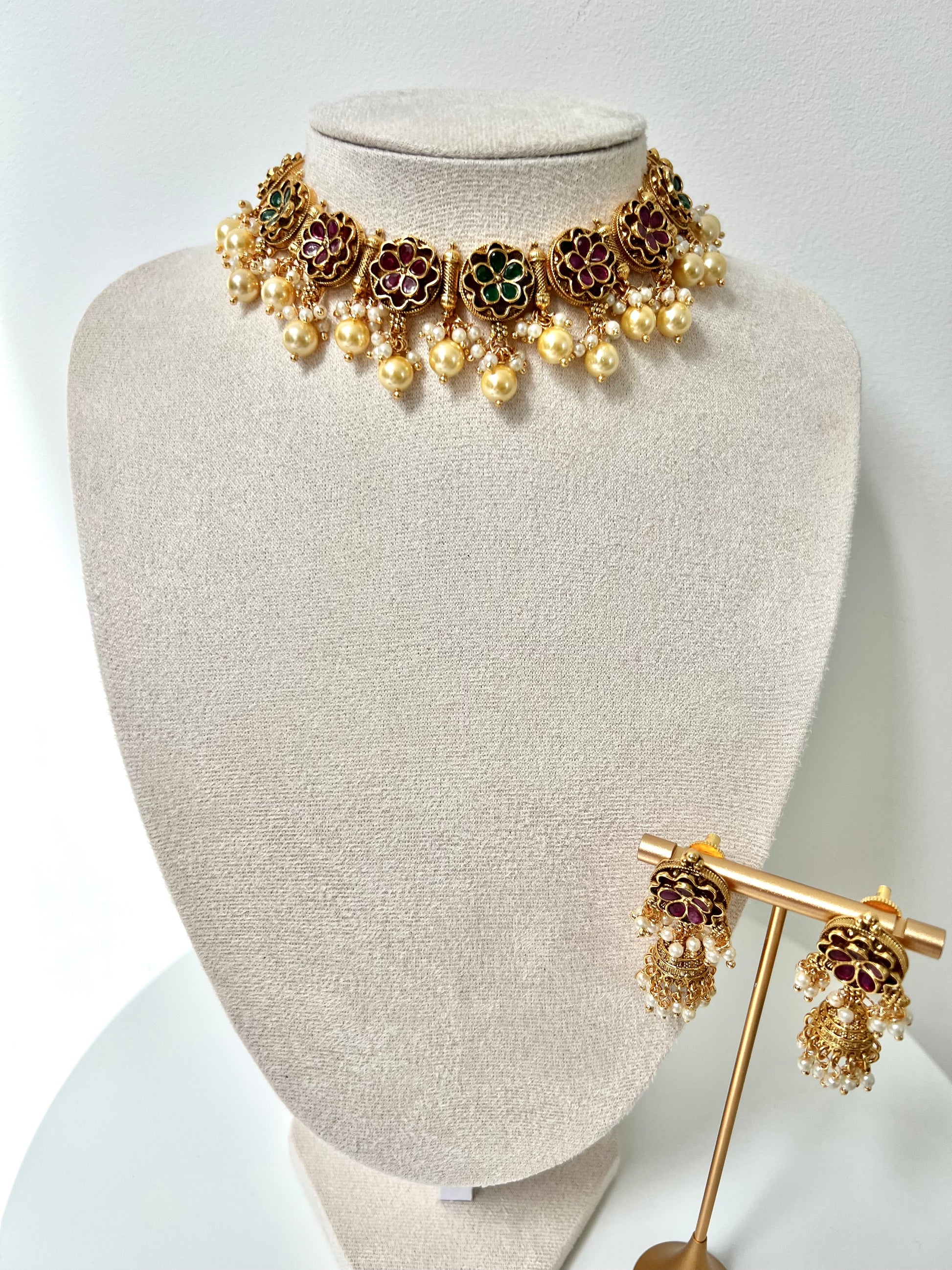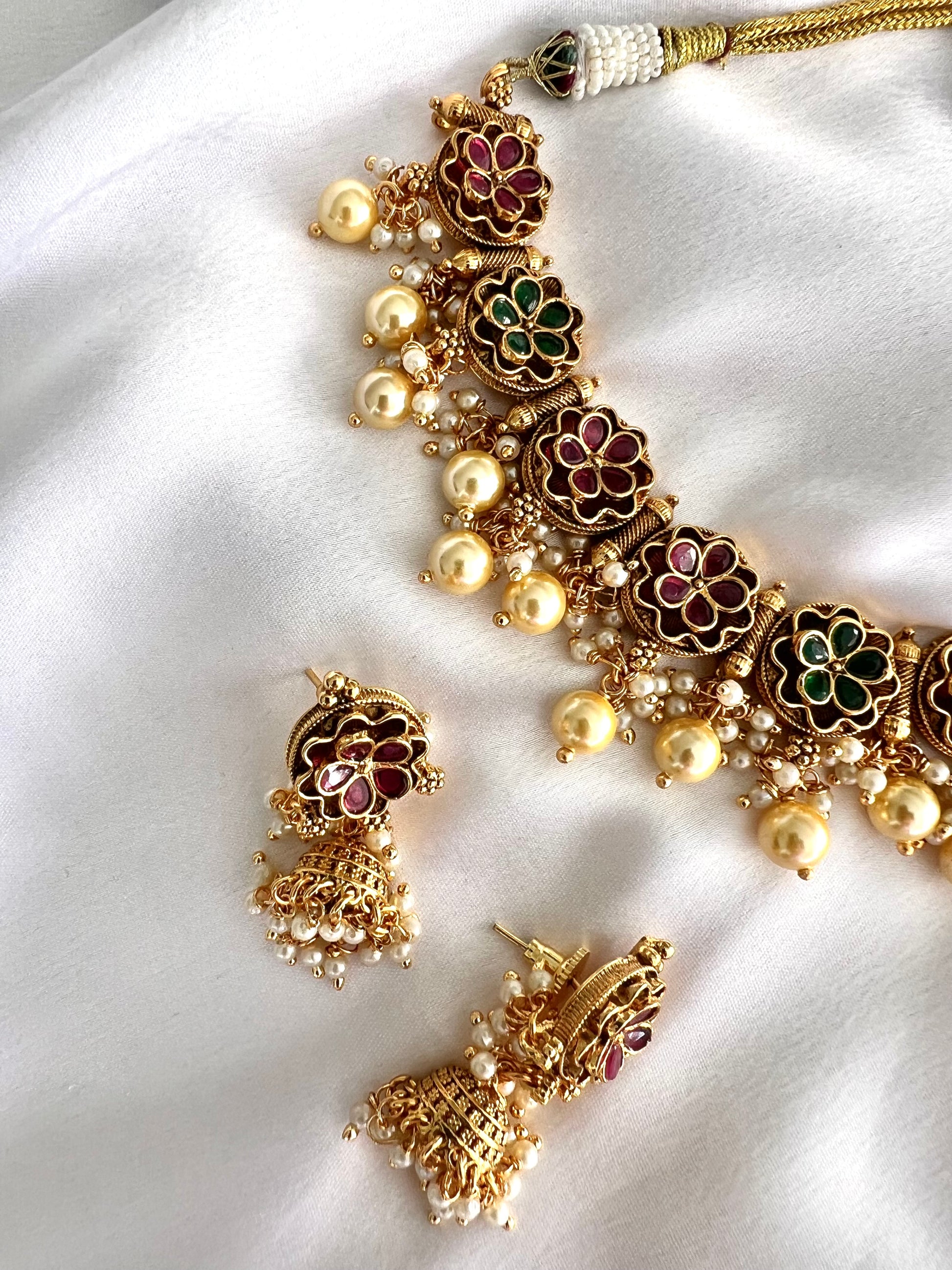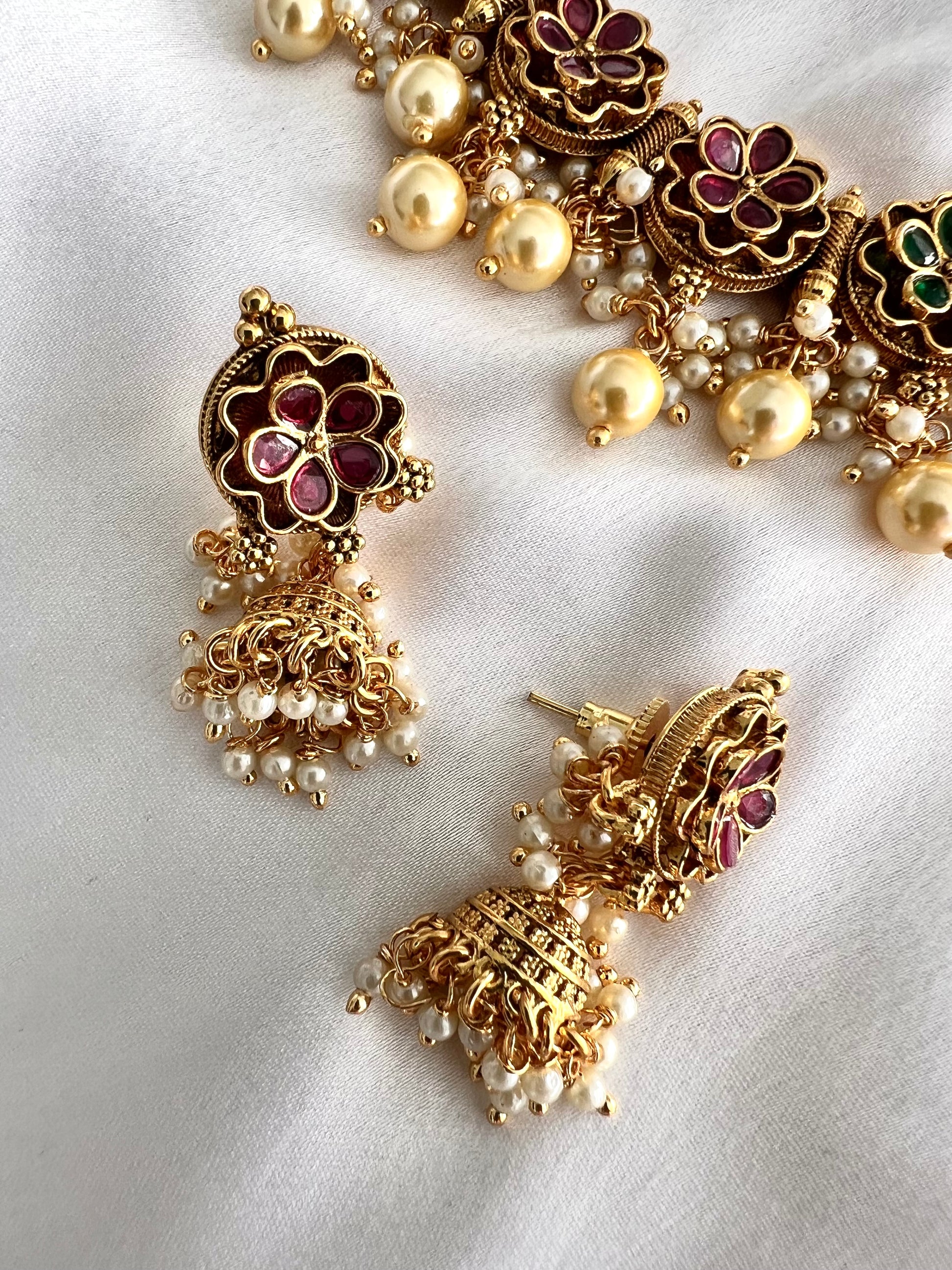 GEETA - Antique gold ruby and green pearl necklace with matching earrings N3253