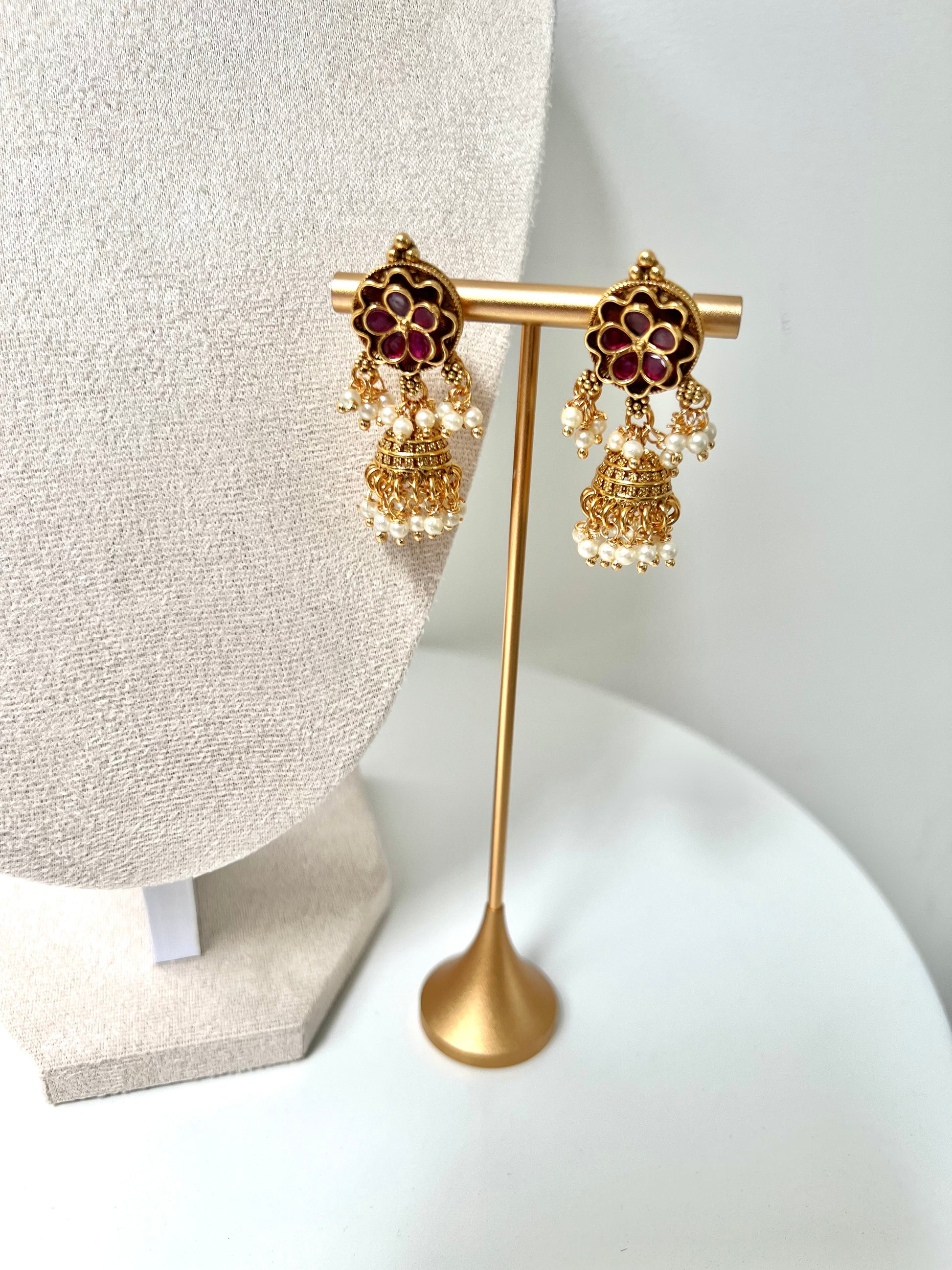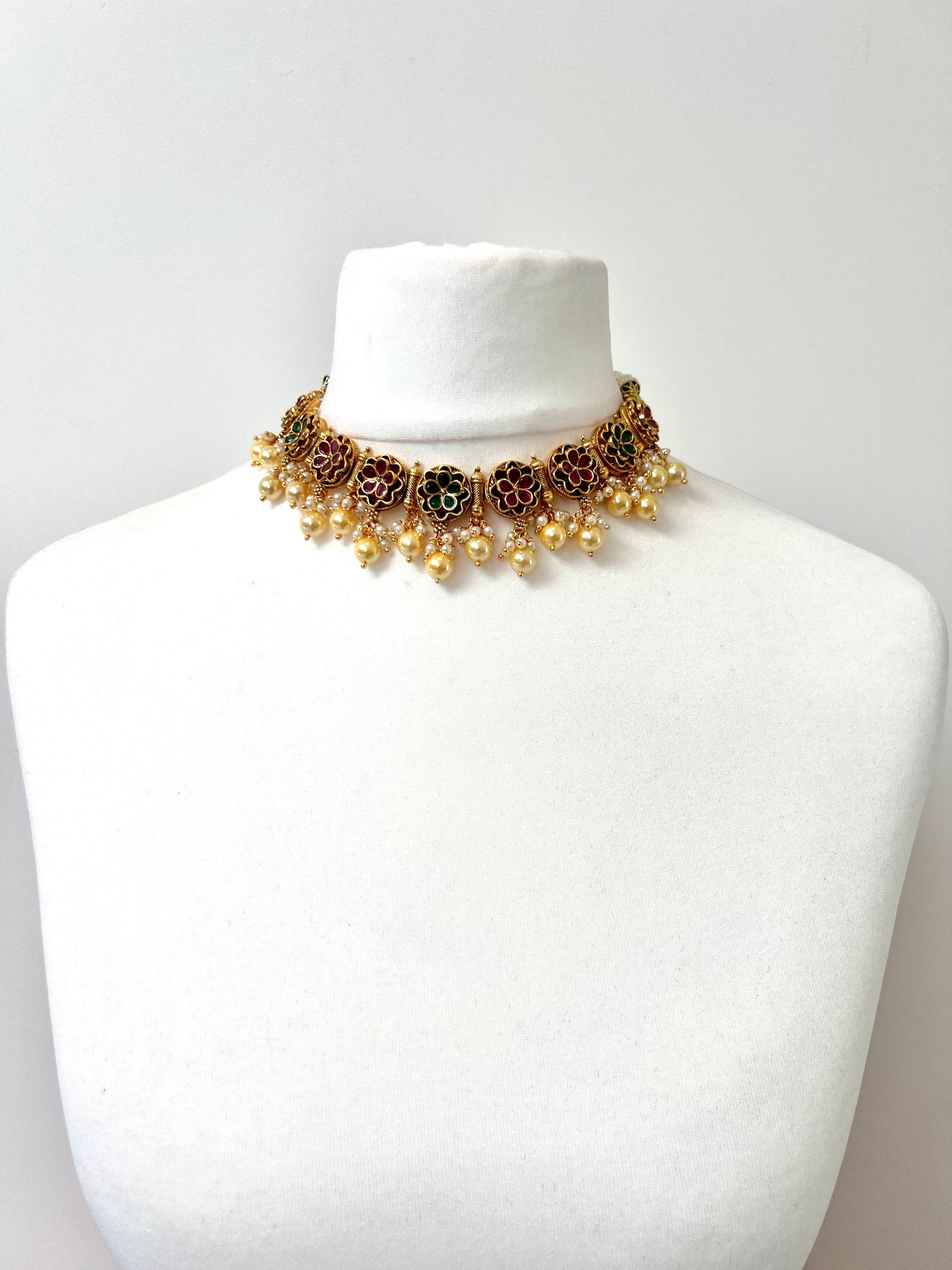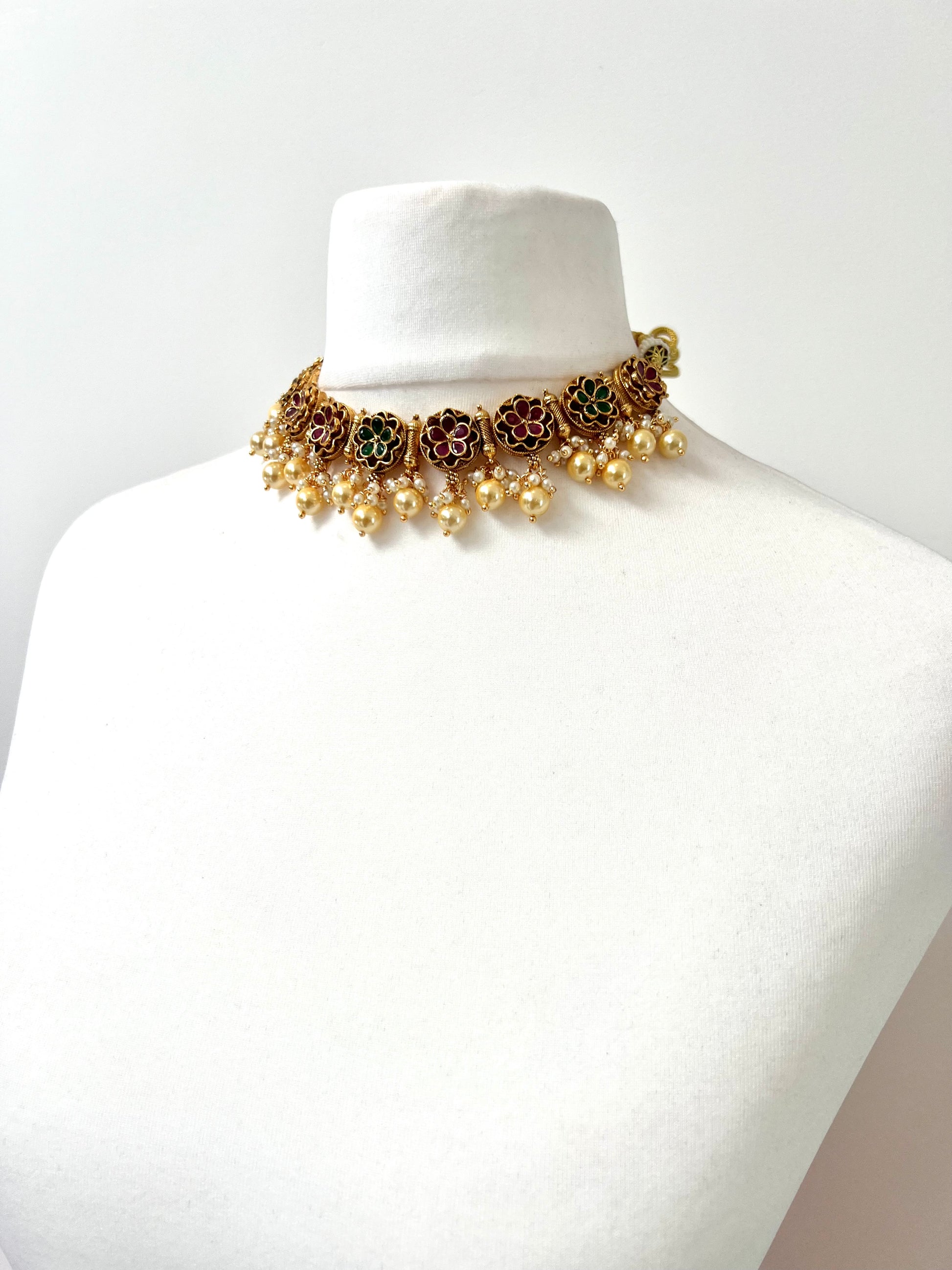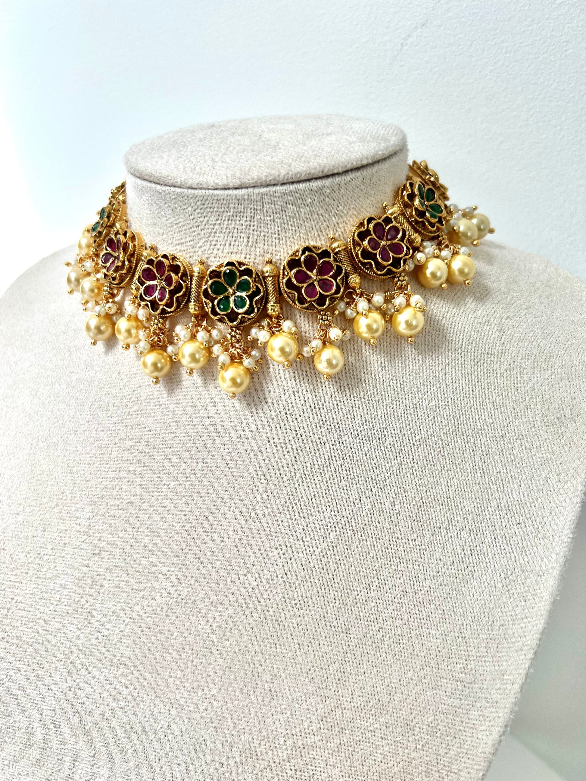 GEETA - Antique gold ruby and green pearl necklace with matching earrings N3253