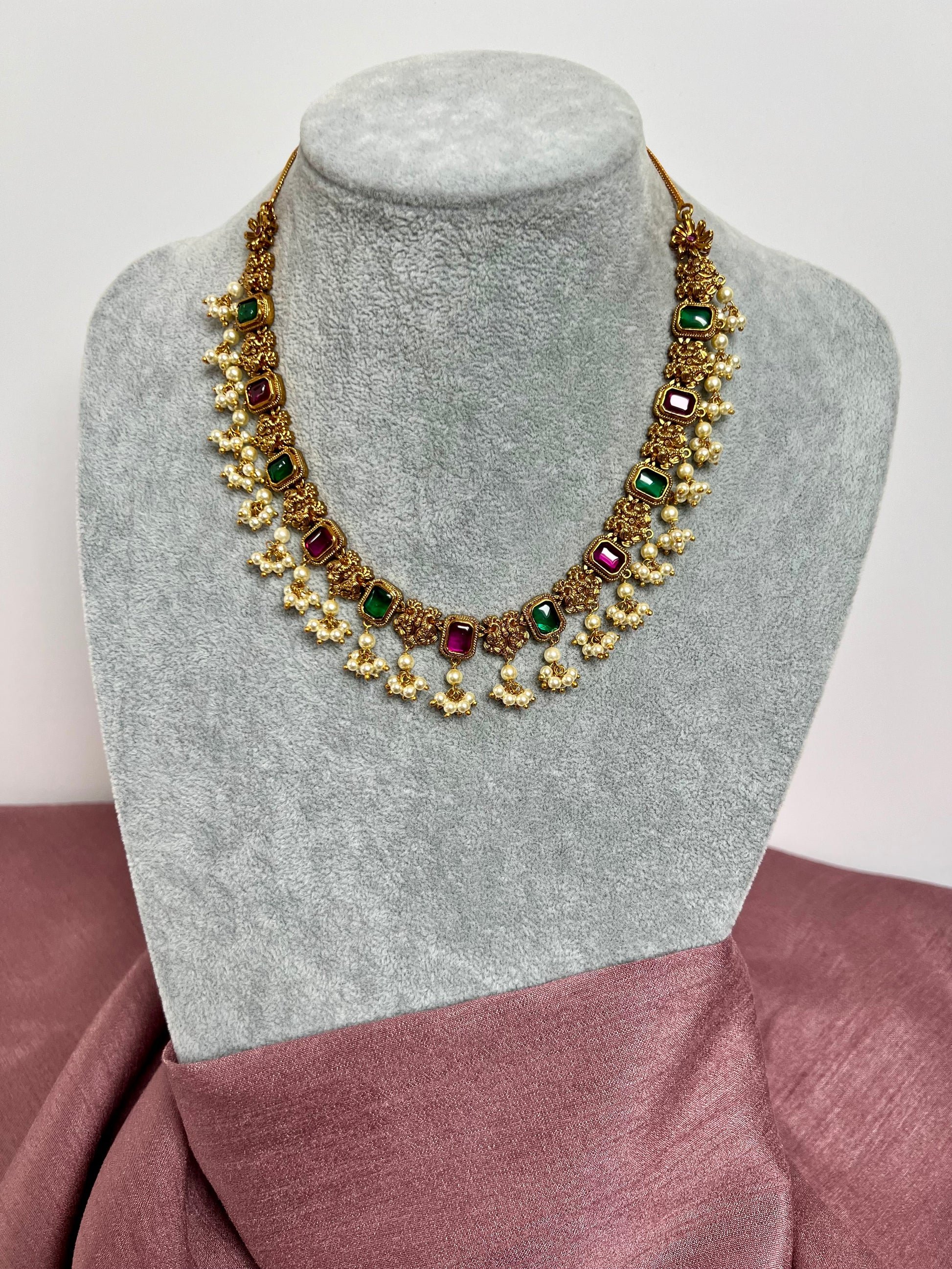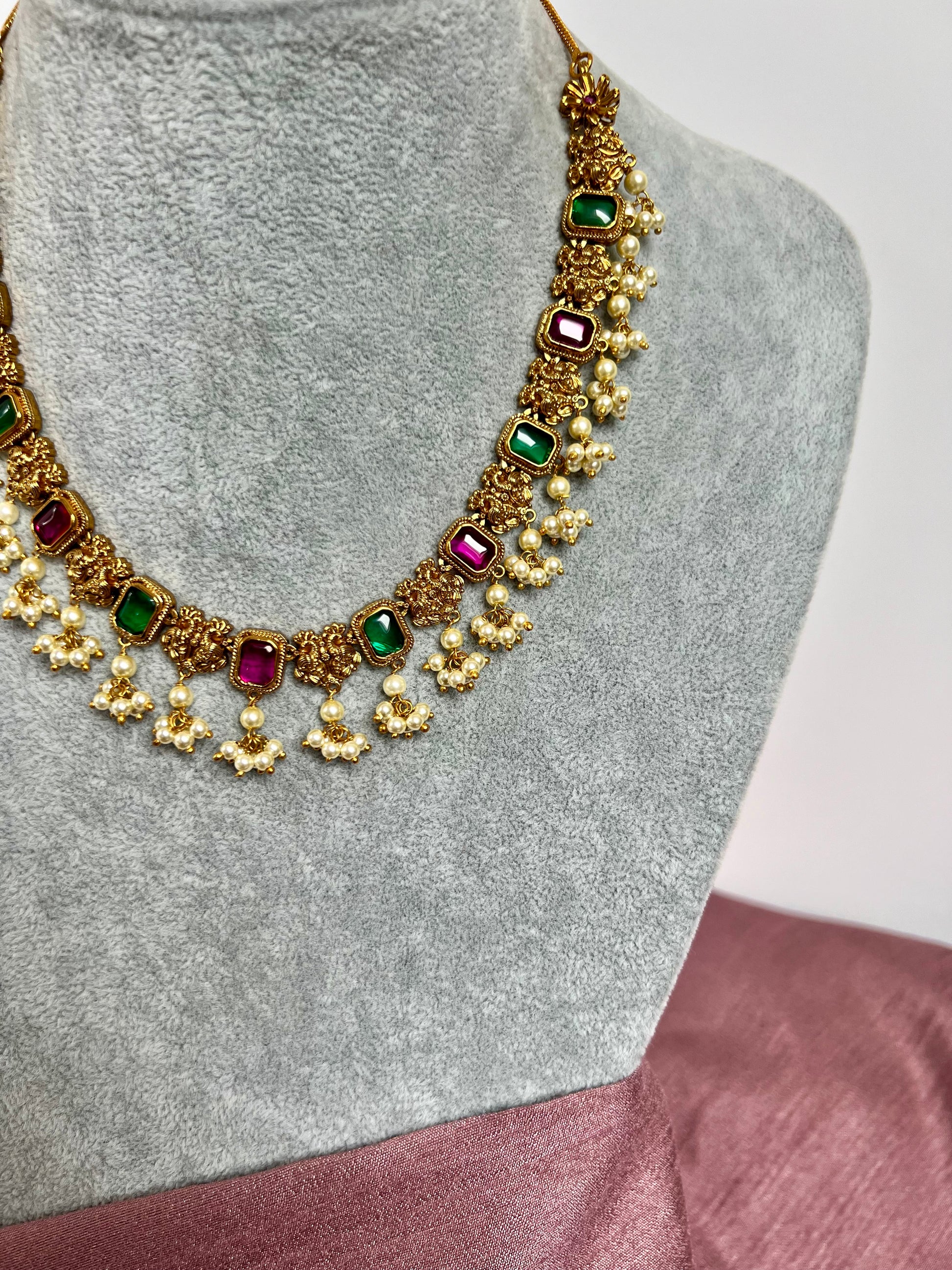 TASHA - Gold plated short necklace with rubygreen stones and dangling ivory pearls, matching jhumkas included N3046
