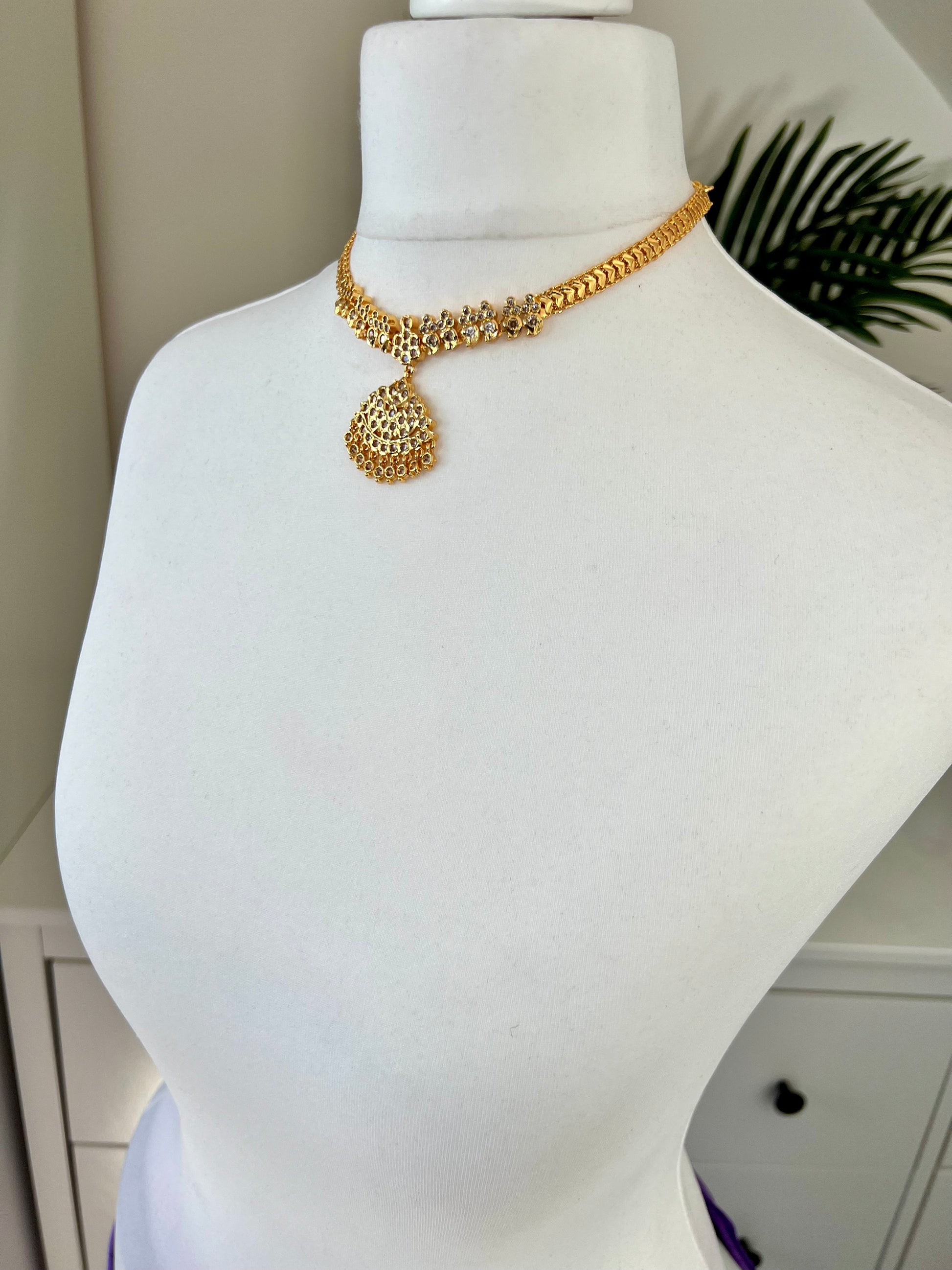 Traditional South Indian short attigai indian necklace embellished with white stones, perfect for any traditional wear.
