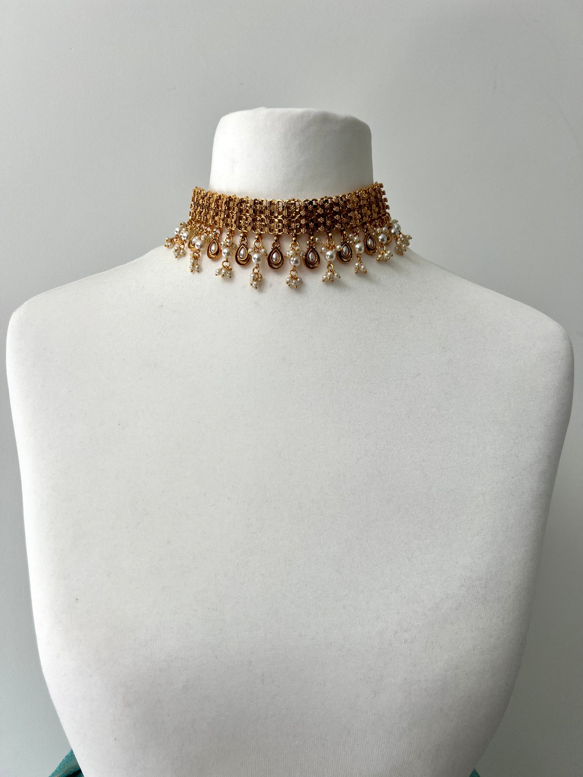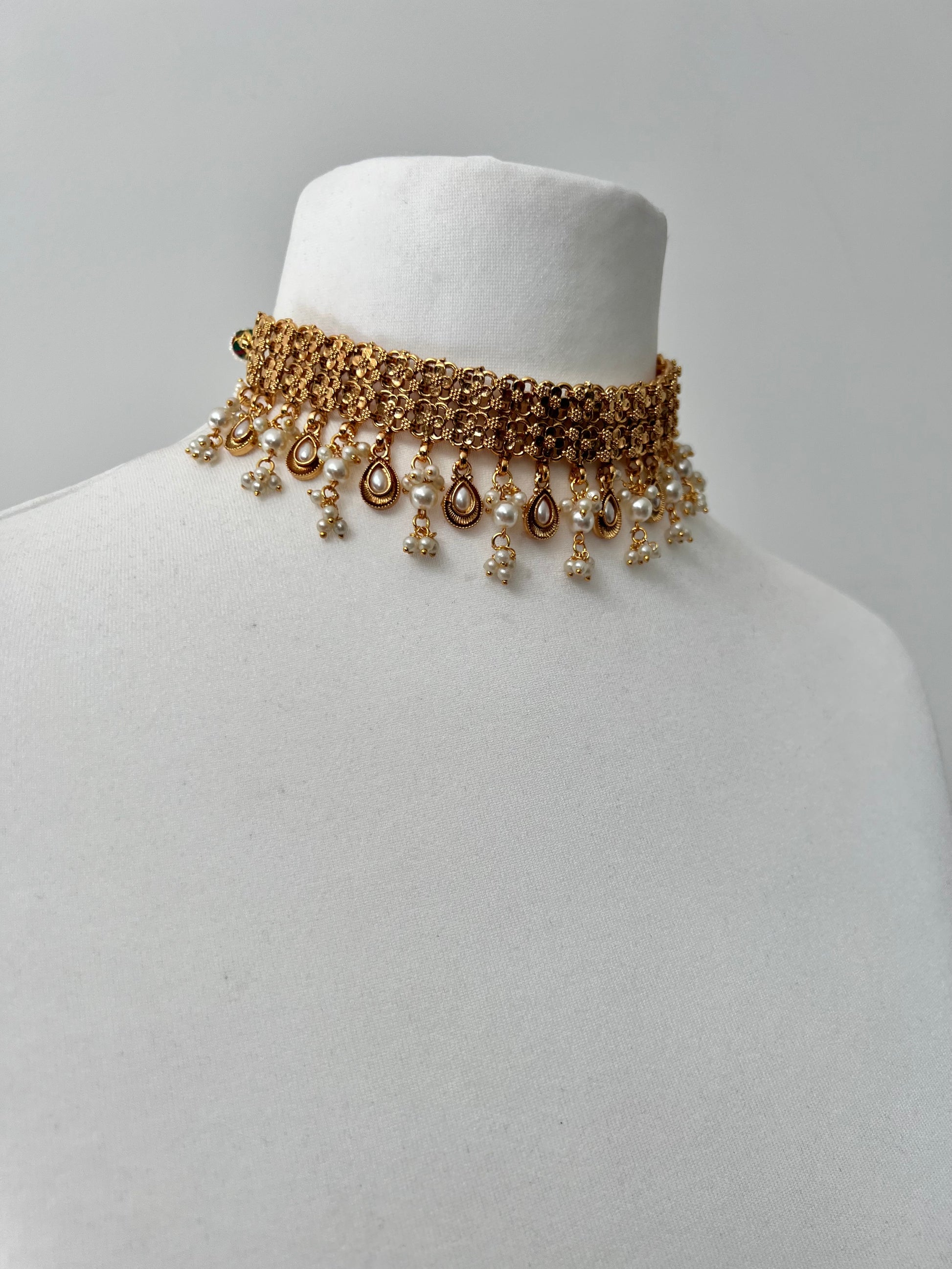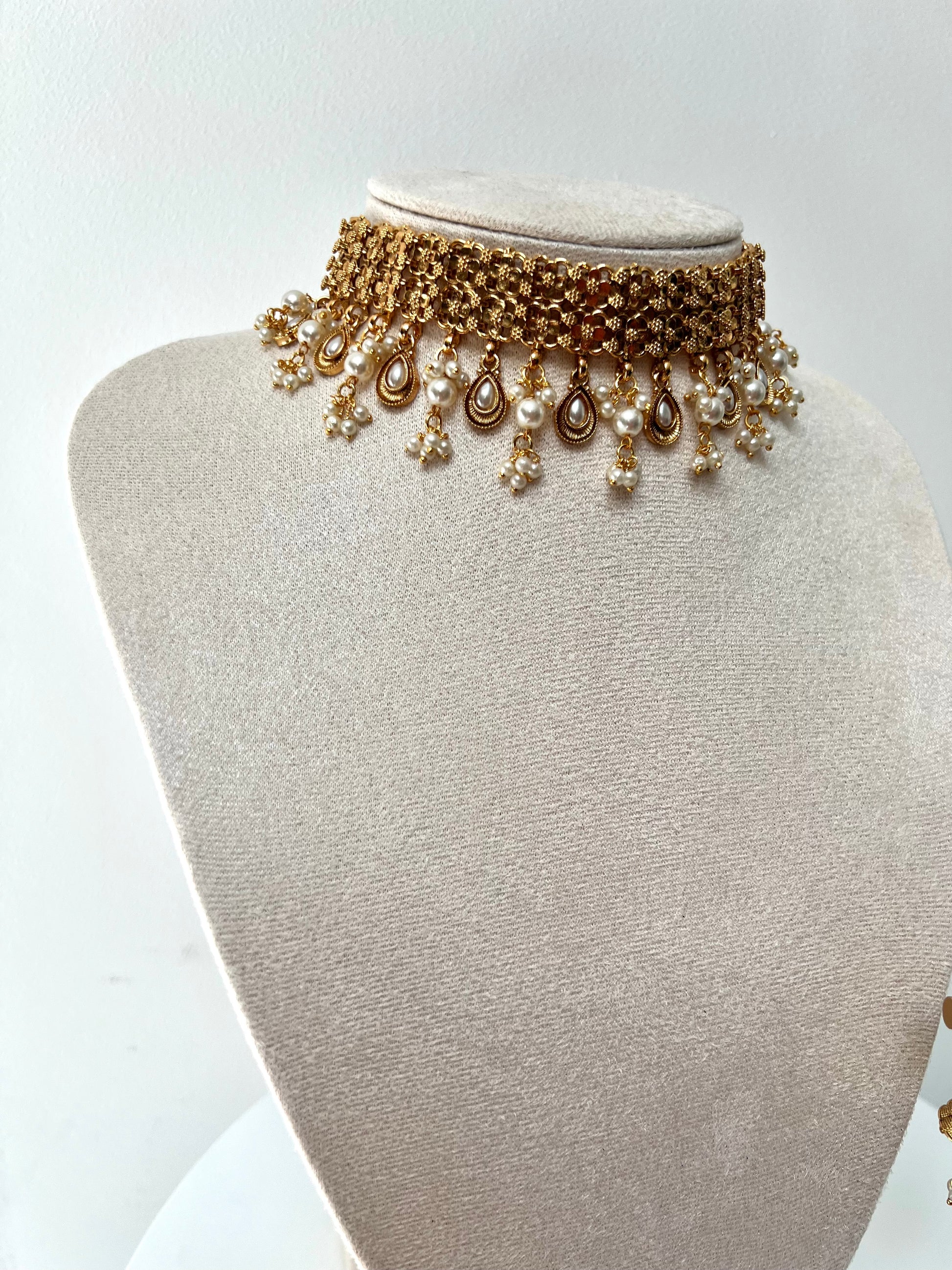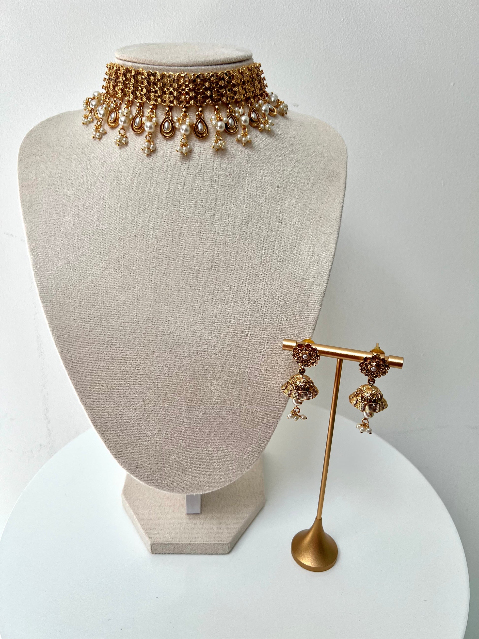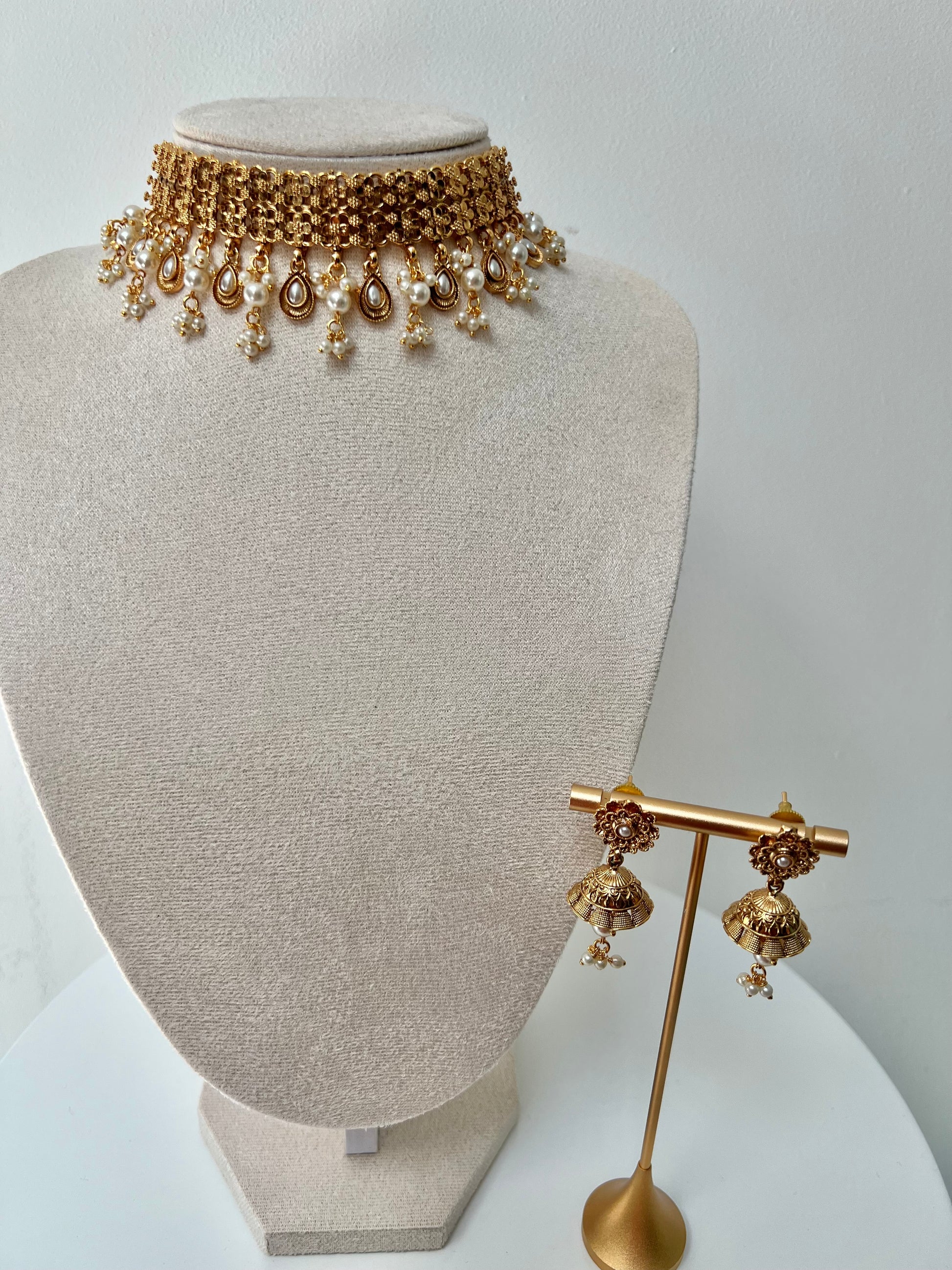 MALANI- Golden high neck band necklace embellished with dangling pearls, comes with matching small jhumkas N3296