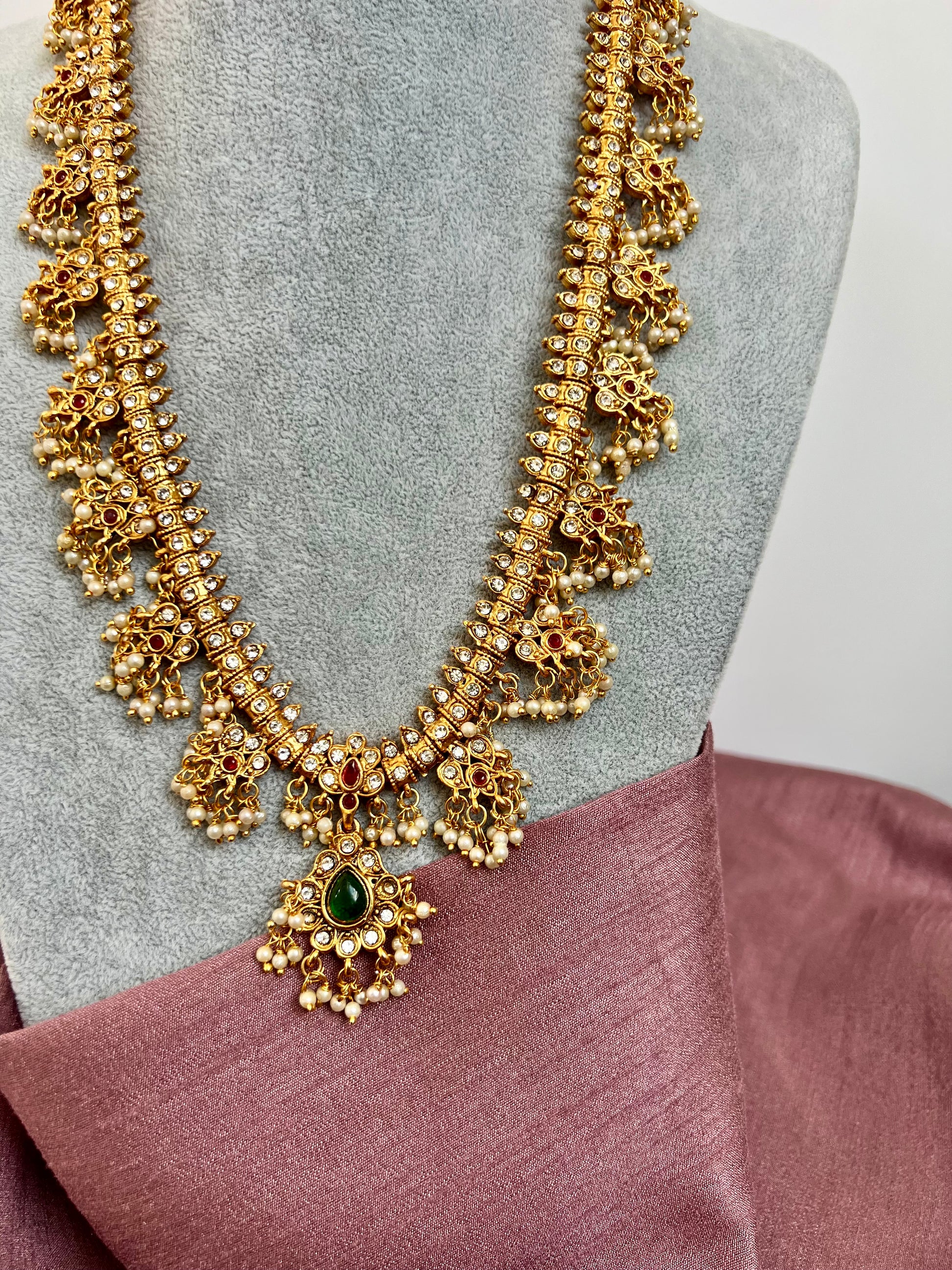 Long antique style malai embellished with ruby stones and a dazzling large green stone in the centre of the necklace and hanging pearls all over. A traditional antique south Indian necklace for a bride that wants to stand out. Comes with matching flat earrings.