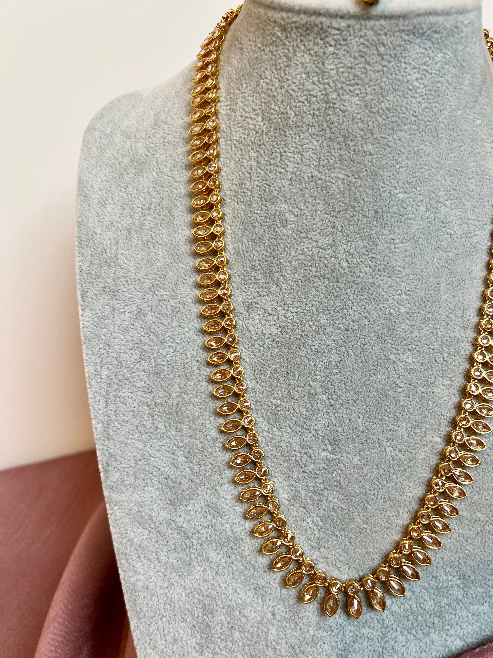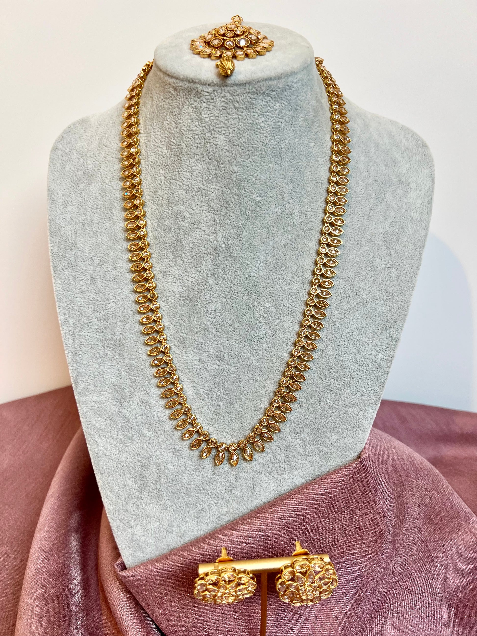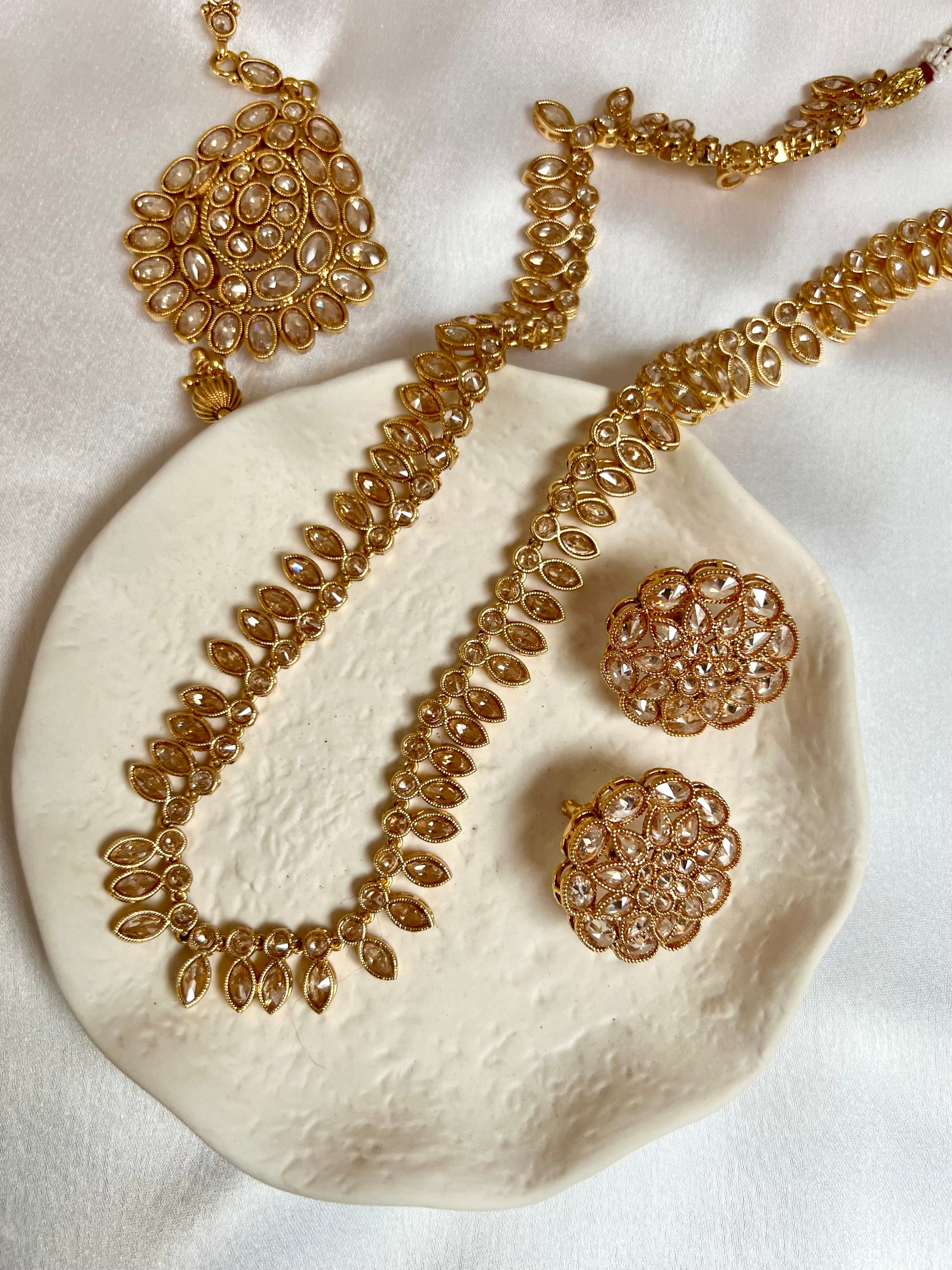 HASEENA - Long white stones golden necklace set with earrings and tikka N3202