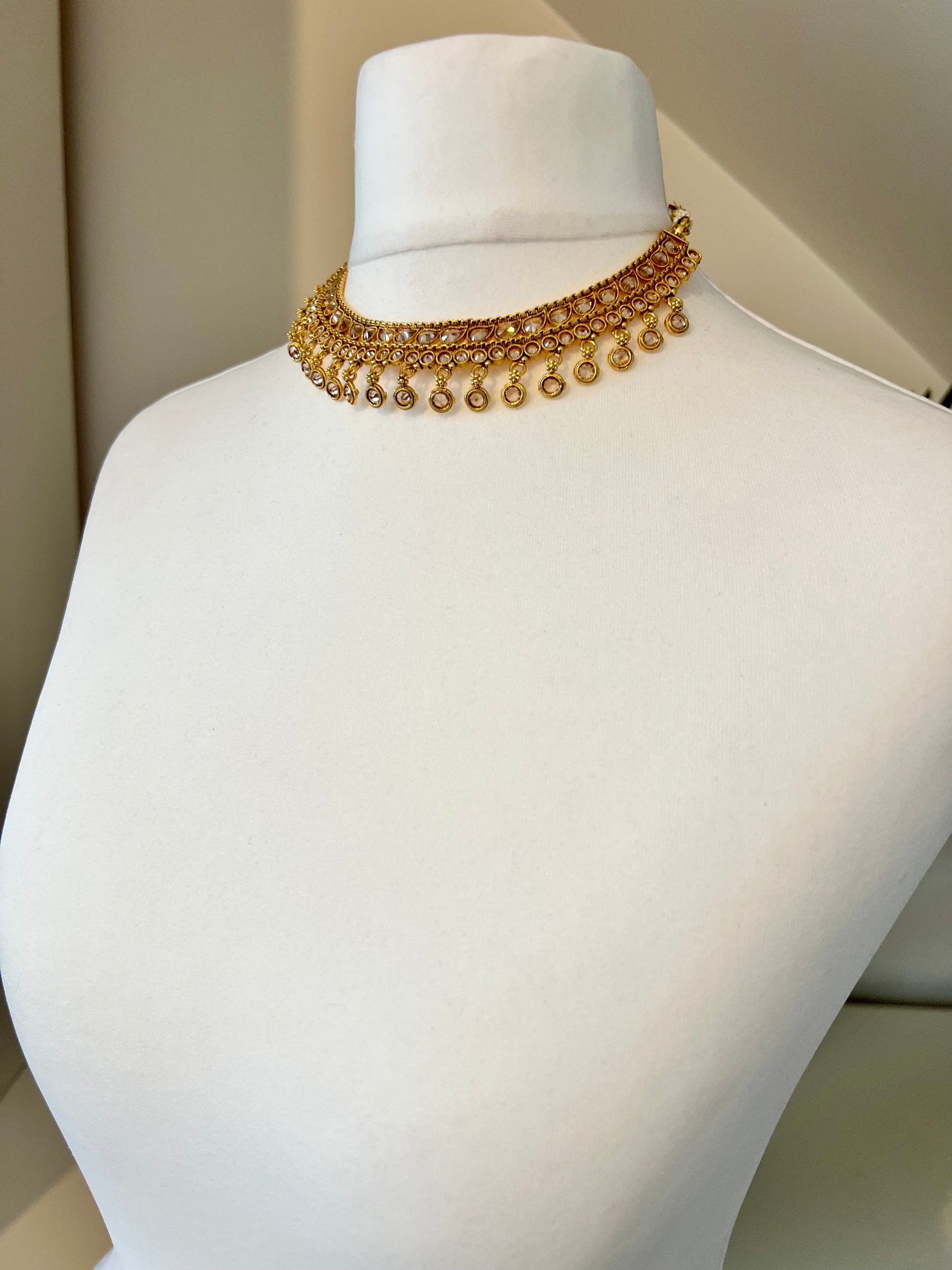 Short golden necklace embellished with champagne coloured kundan stones, comes with matching flat earrings.