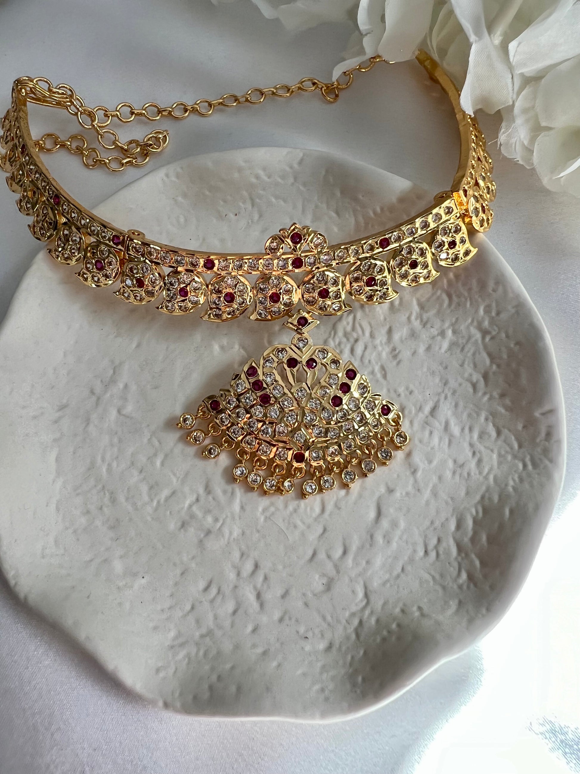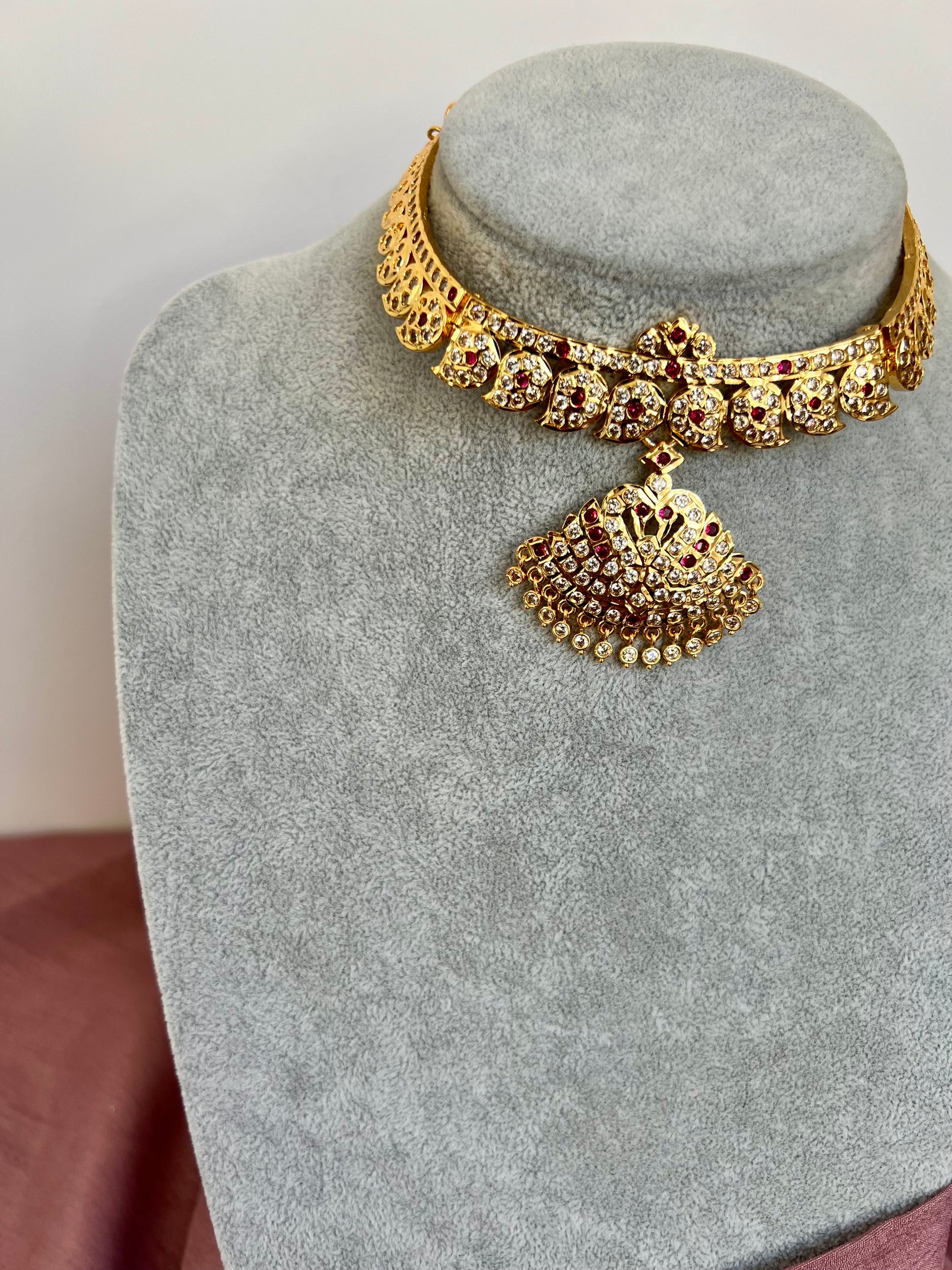 Traditional South Indian ruby mango choker necklace embellished with white and ruby stones.