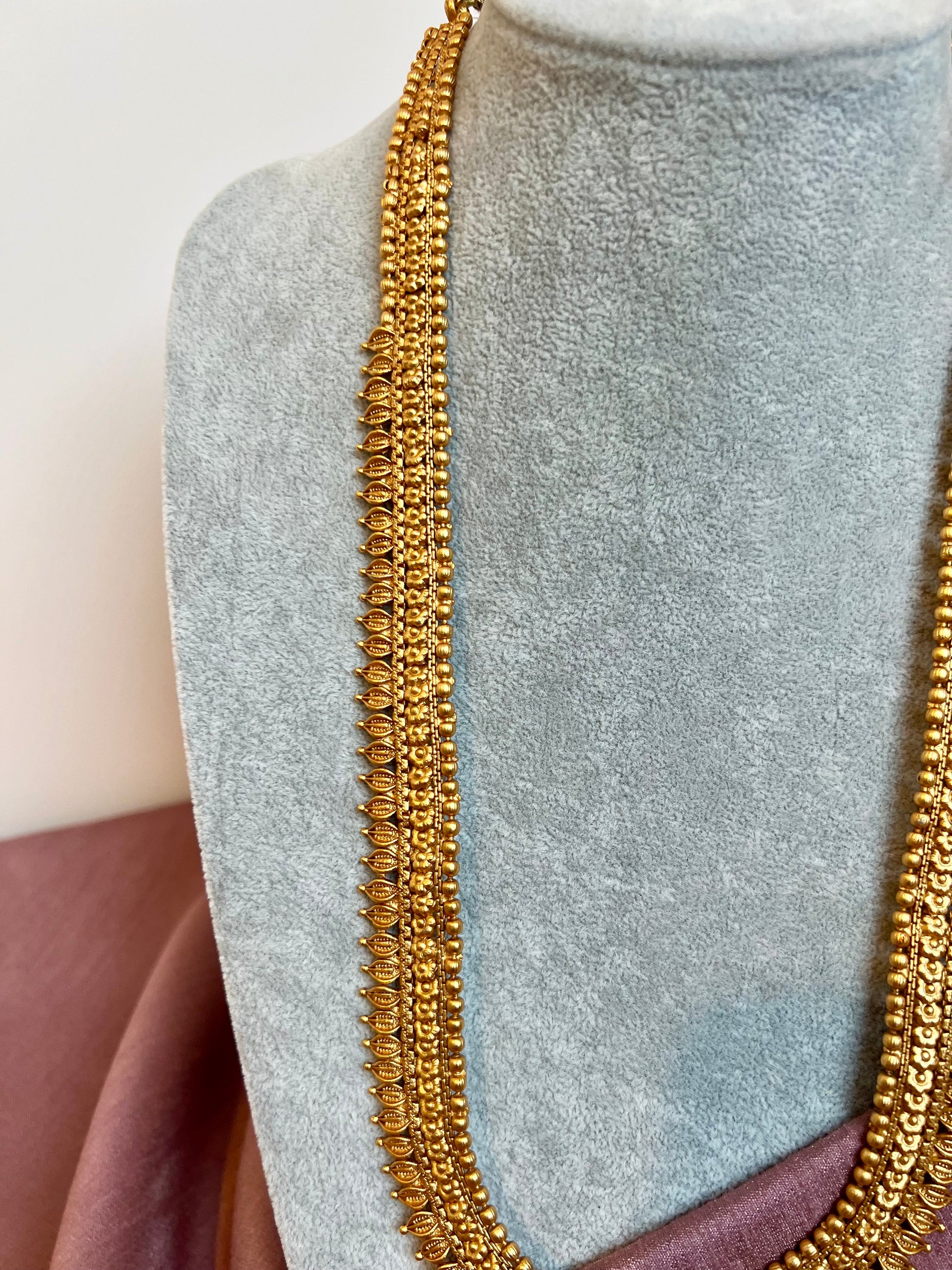 ISHA - Long bridal matte golden necklace set with long flat earrings N3195