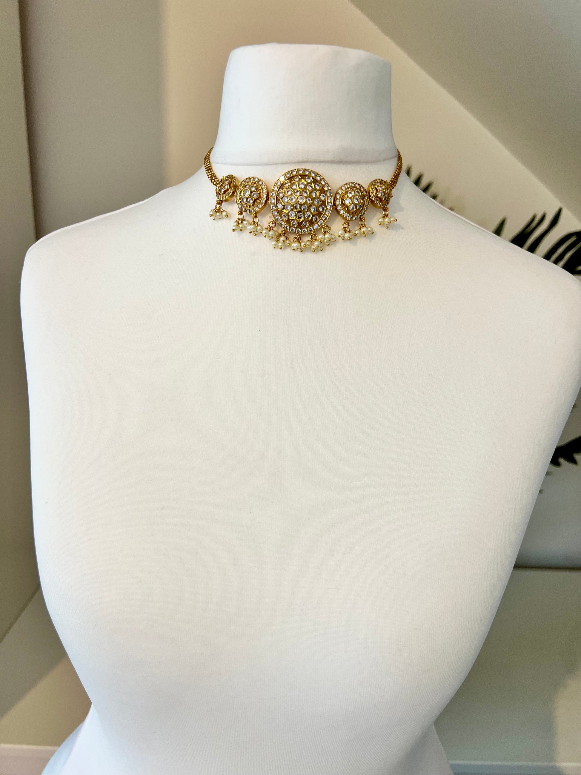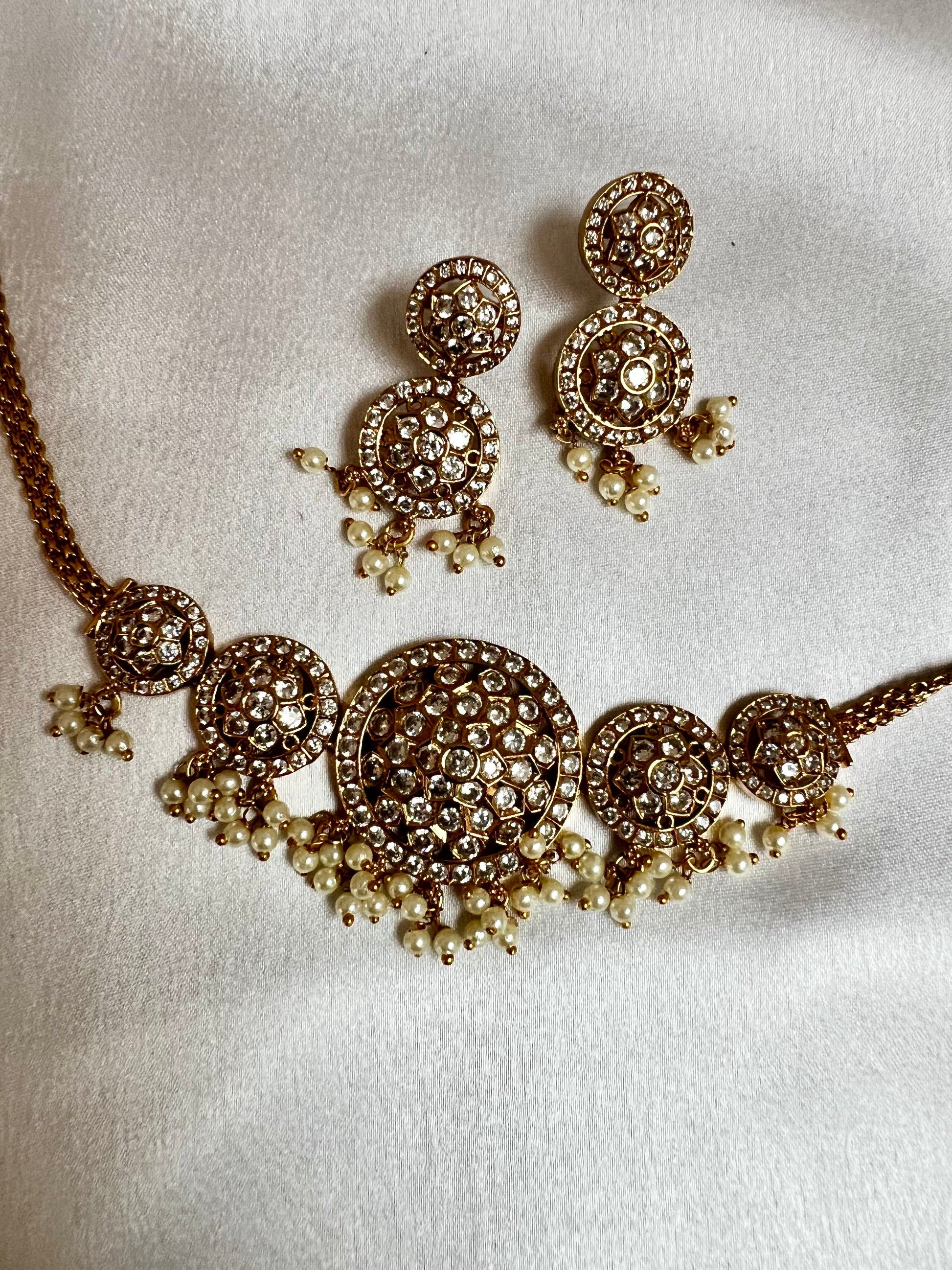 JENISHA - Golden choker white stone pearl necklace with earrings N3205
