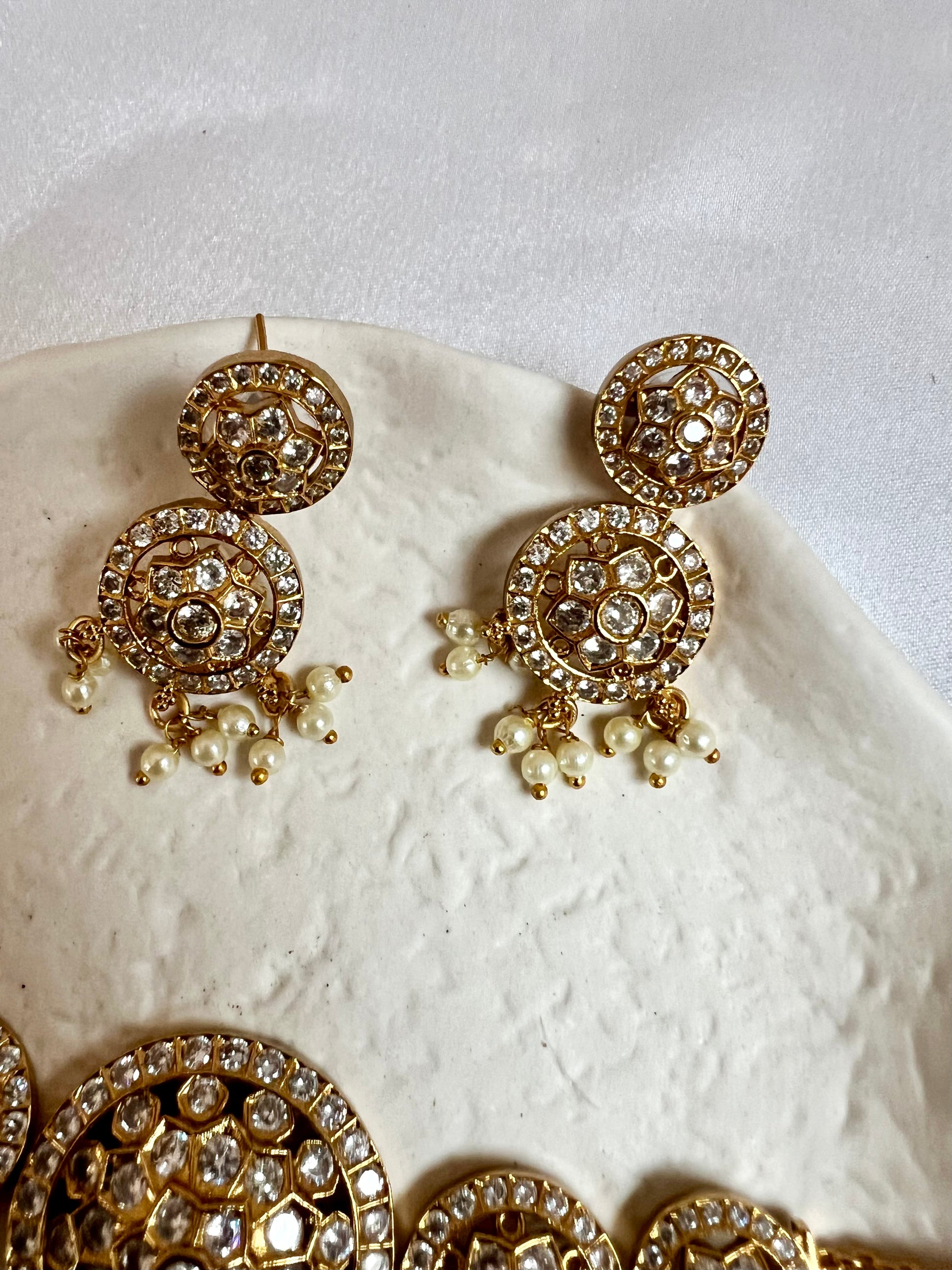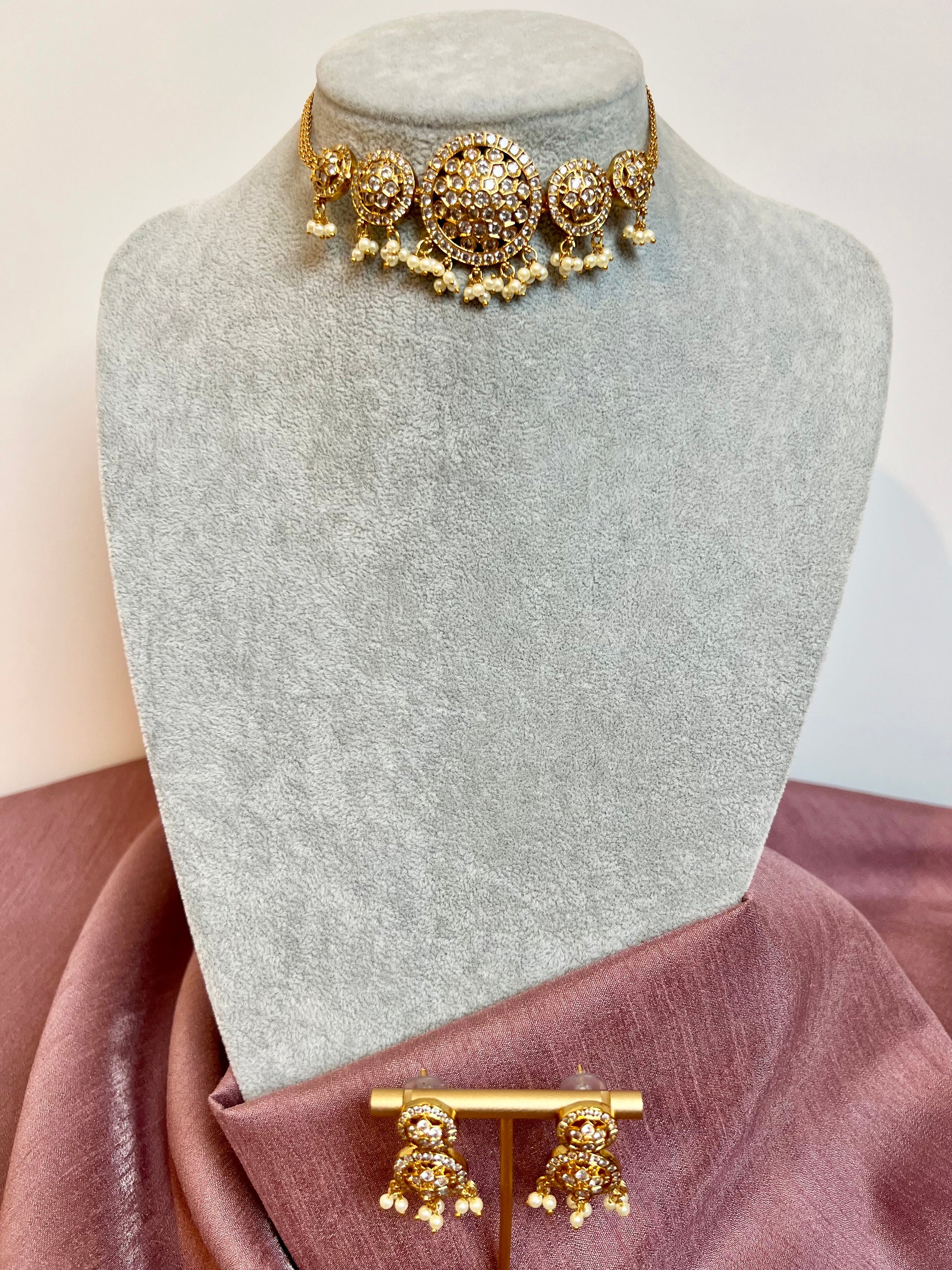 Beautiful versatile choker necklace embellished with white stones and dangling pearls, comes with matching small earrings.