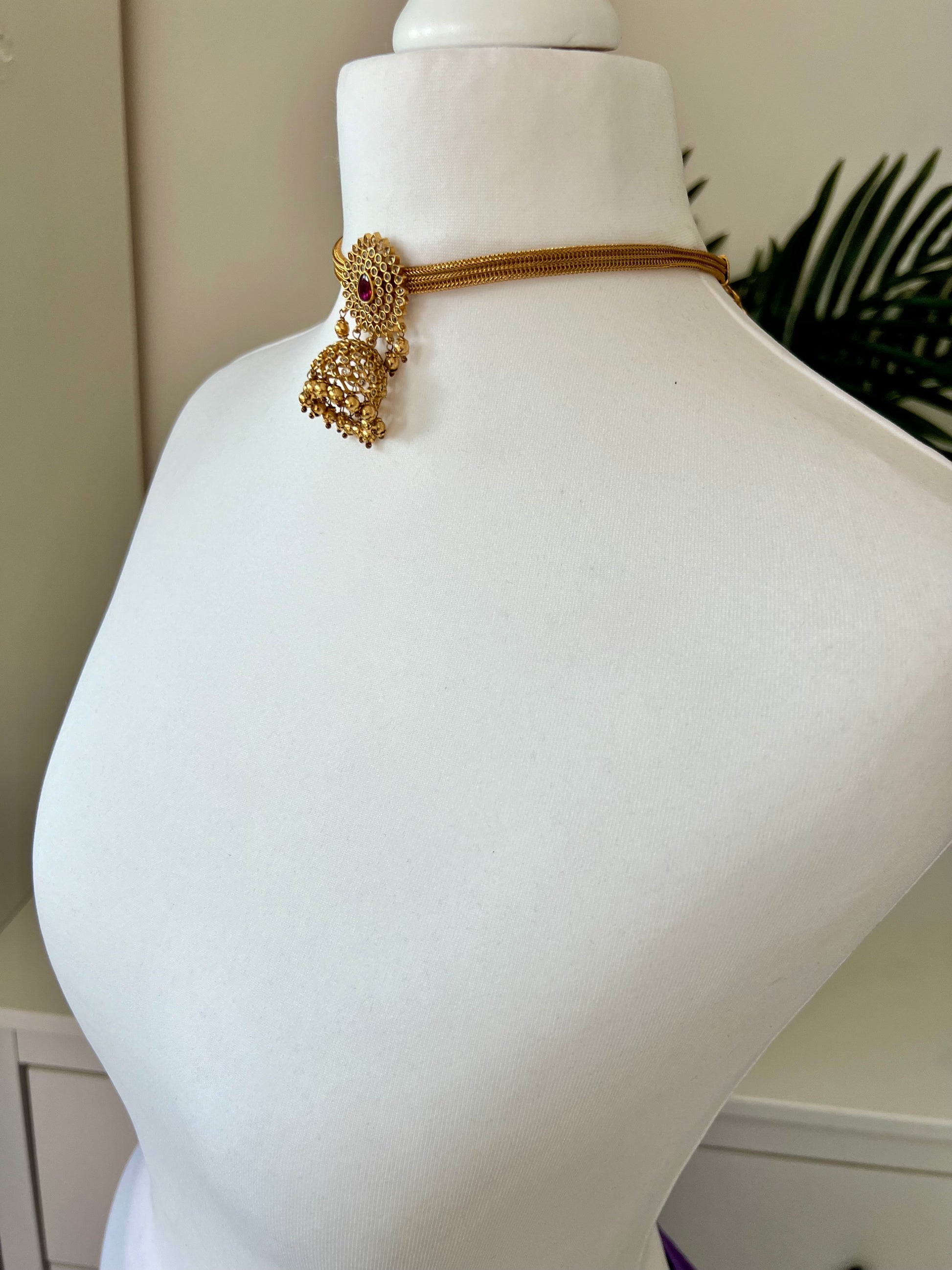 Beautiful choker with a large jhumka at the centre of the necklace, embellished with white and ruby stones and comes with matching large jhumkas.