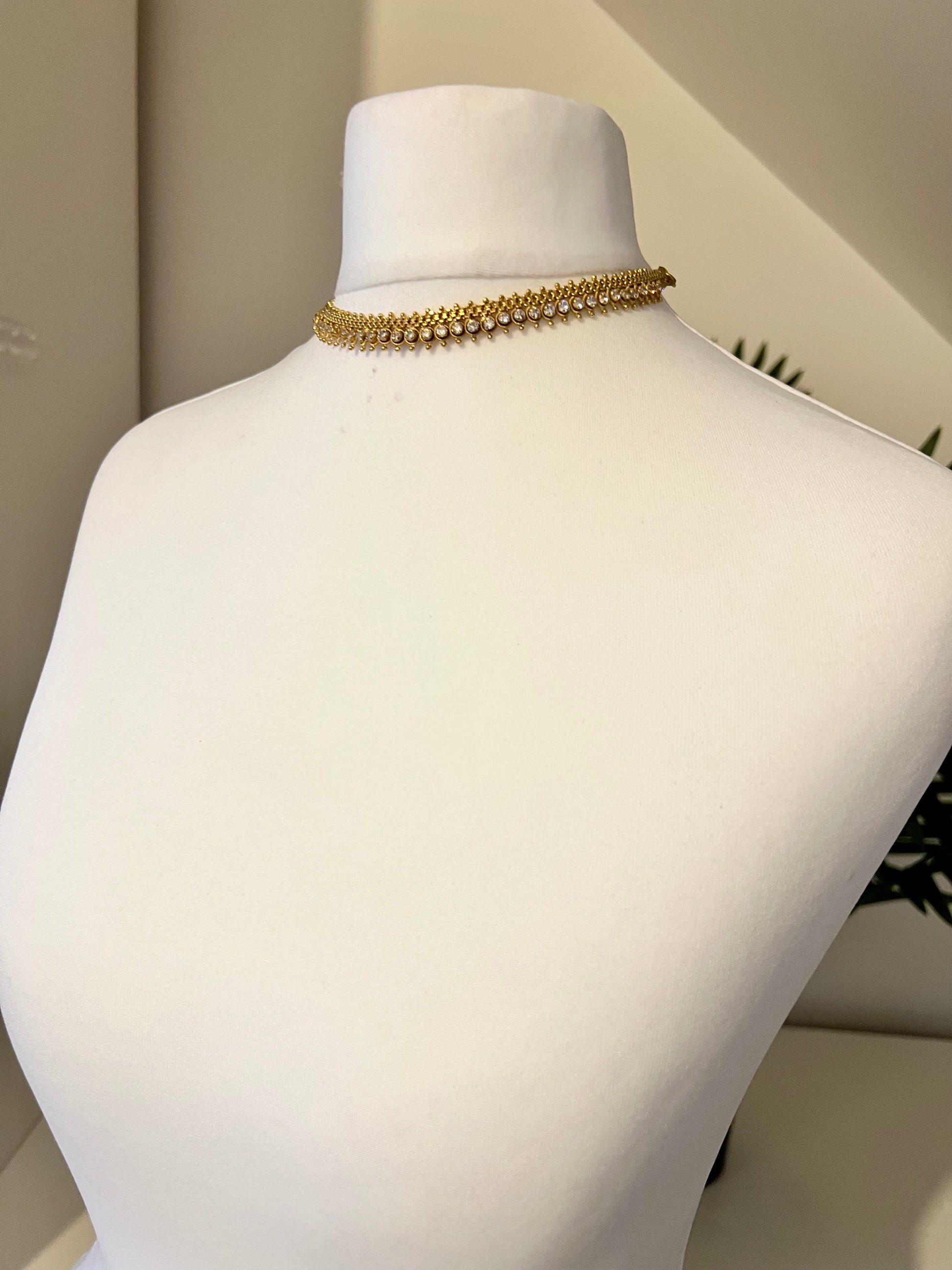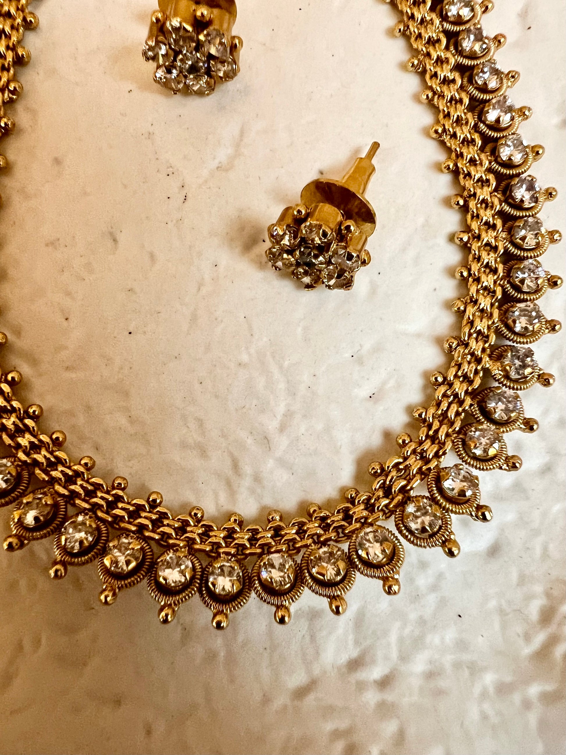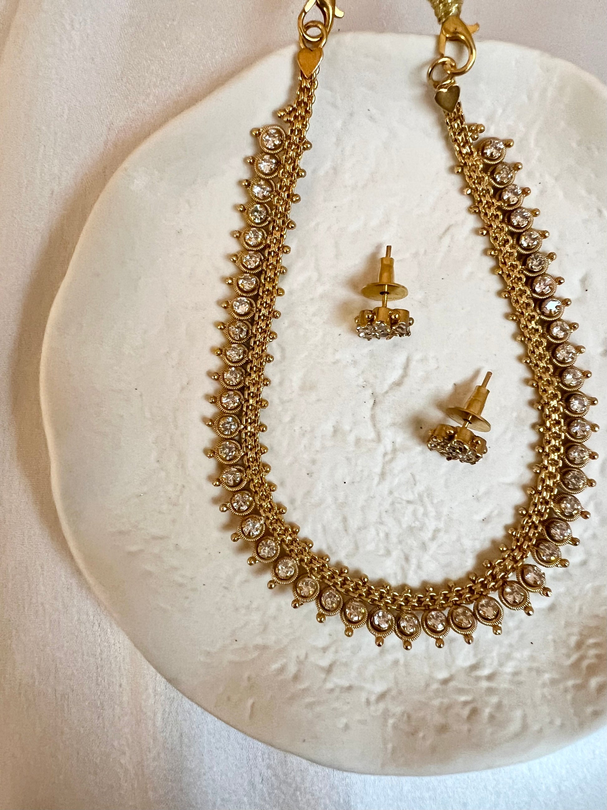 Simple golden chain thats embellished with sparkly white stones, comes with small flower shaped stud earrings.