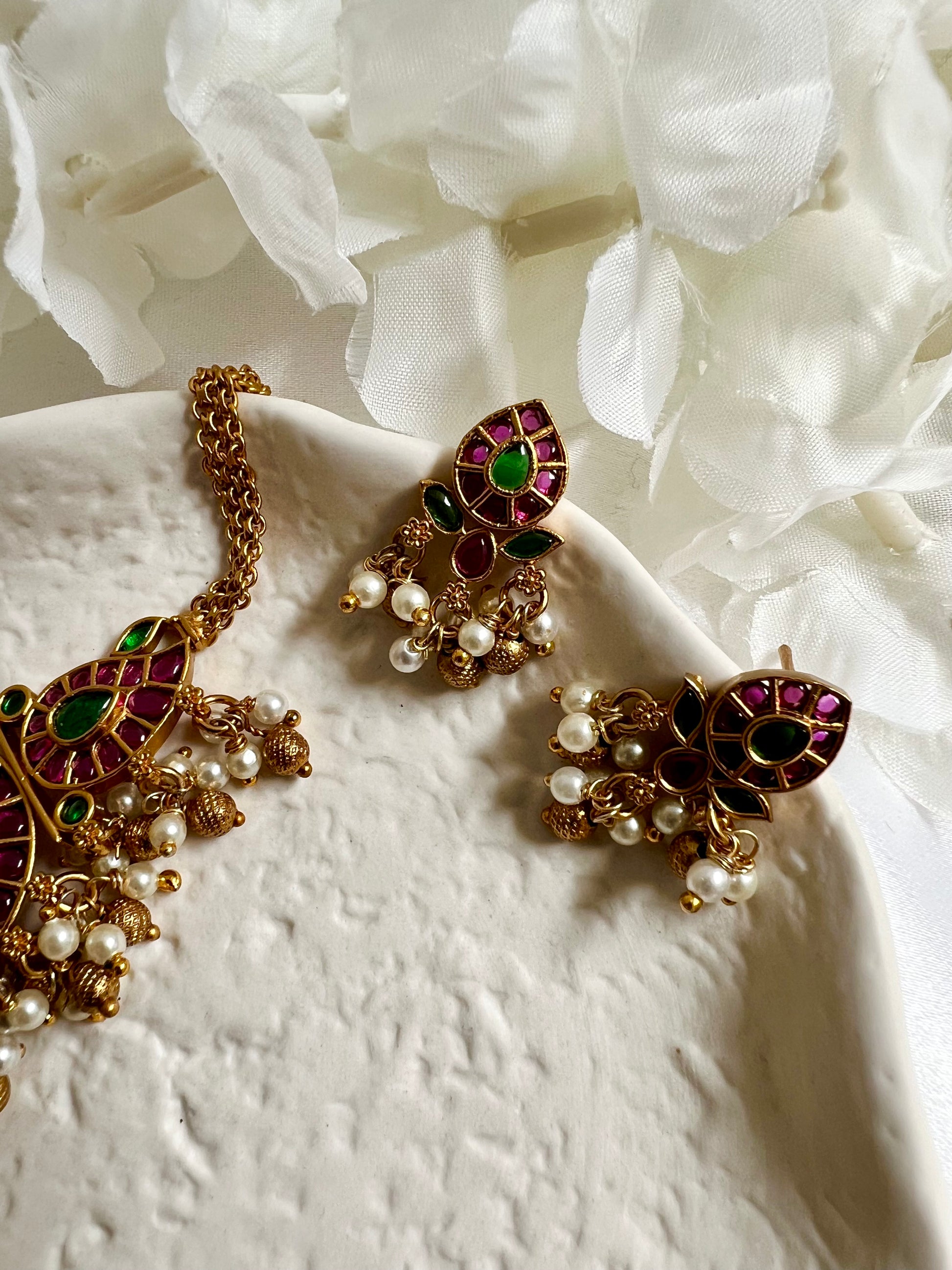 A beautiful small choker necklace in rubygreen kemp stones and small dangling pearls, comes with two small earrings. This set is perfect for small girls, will fit smaller necklines only.