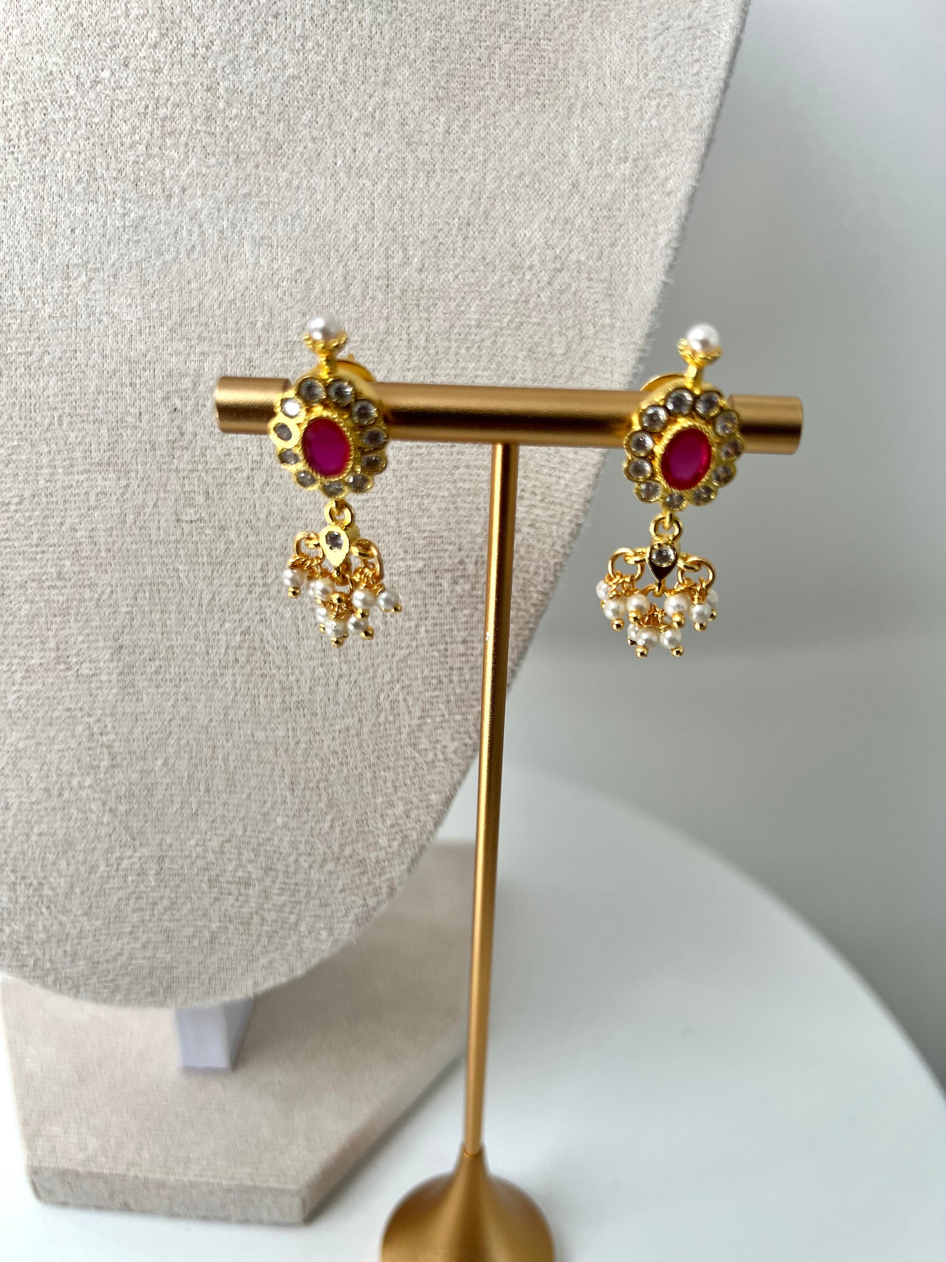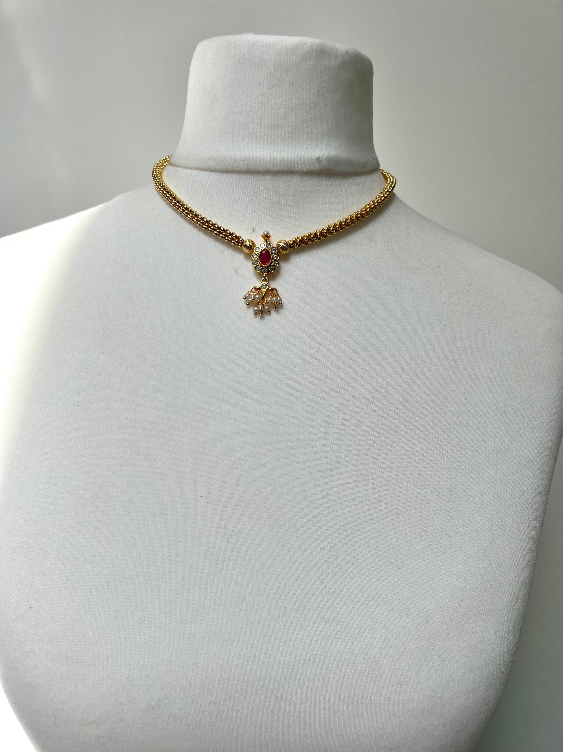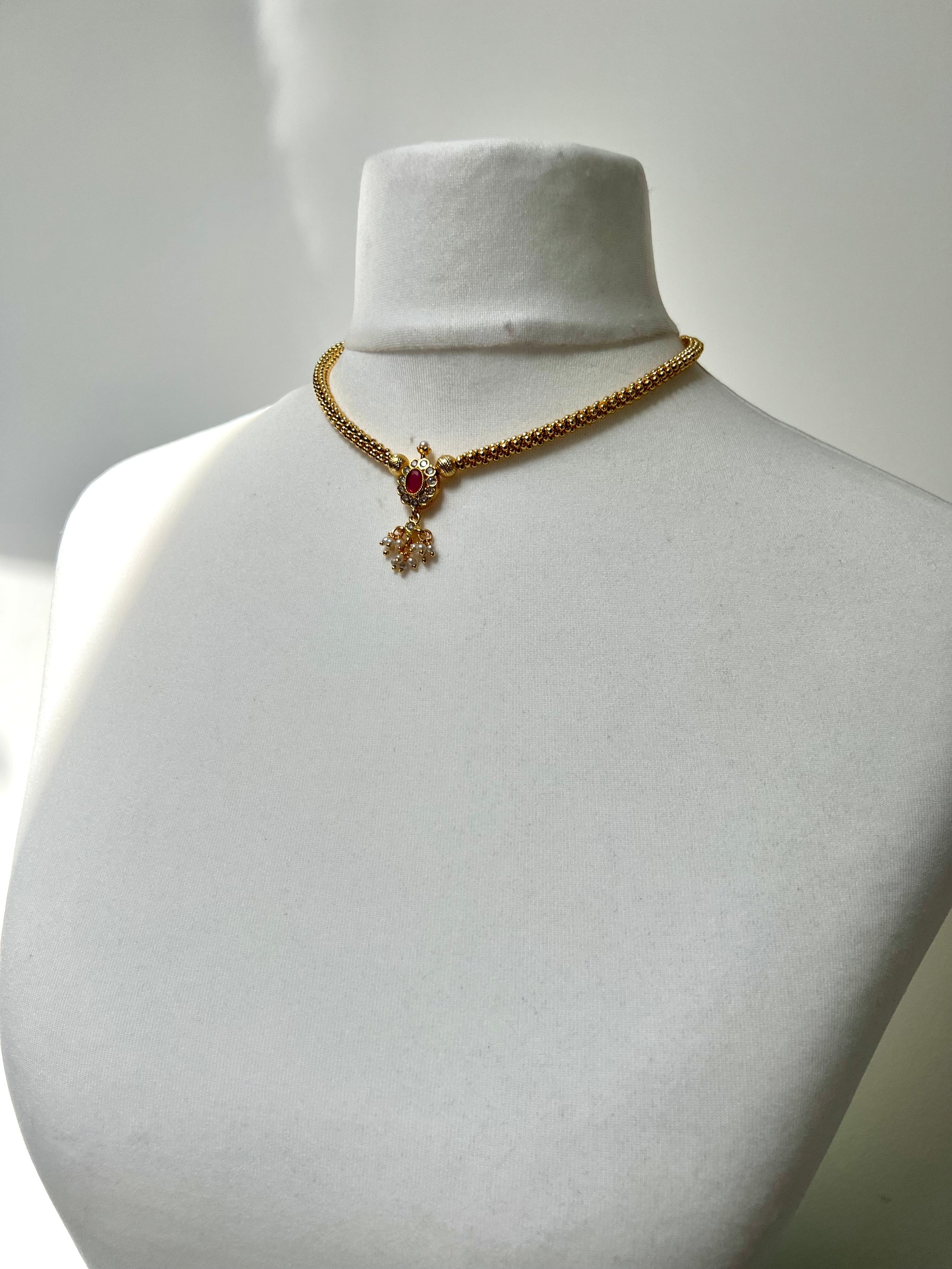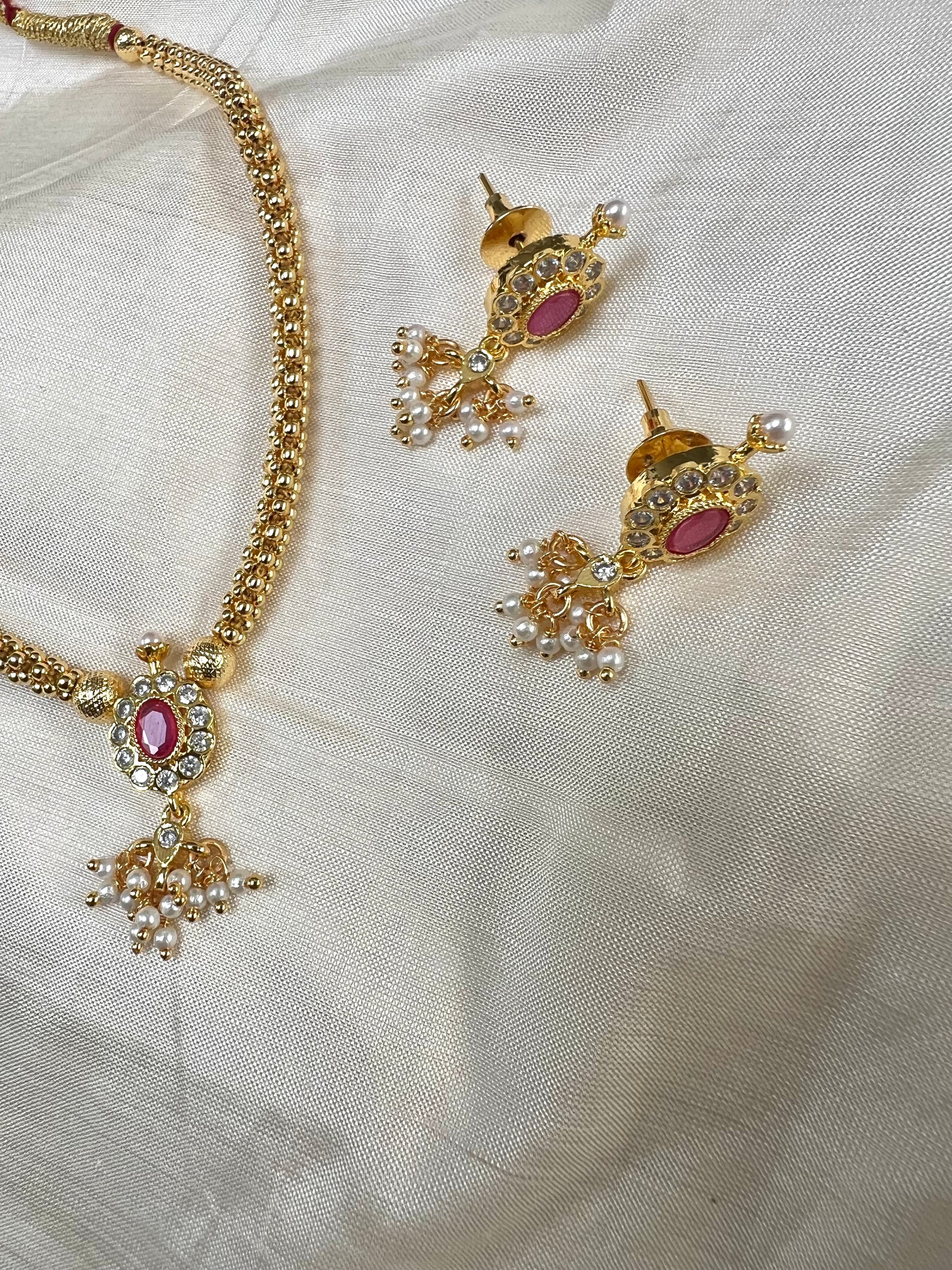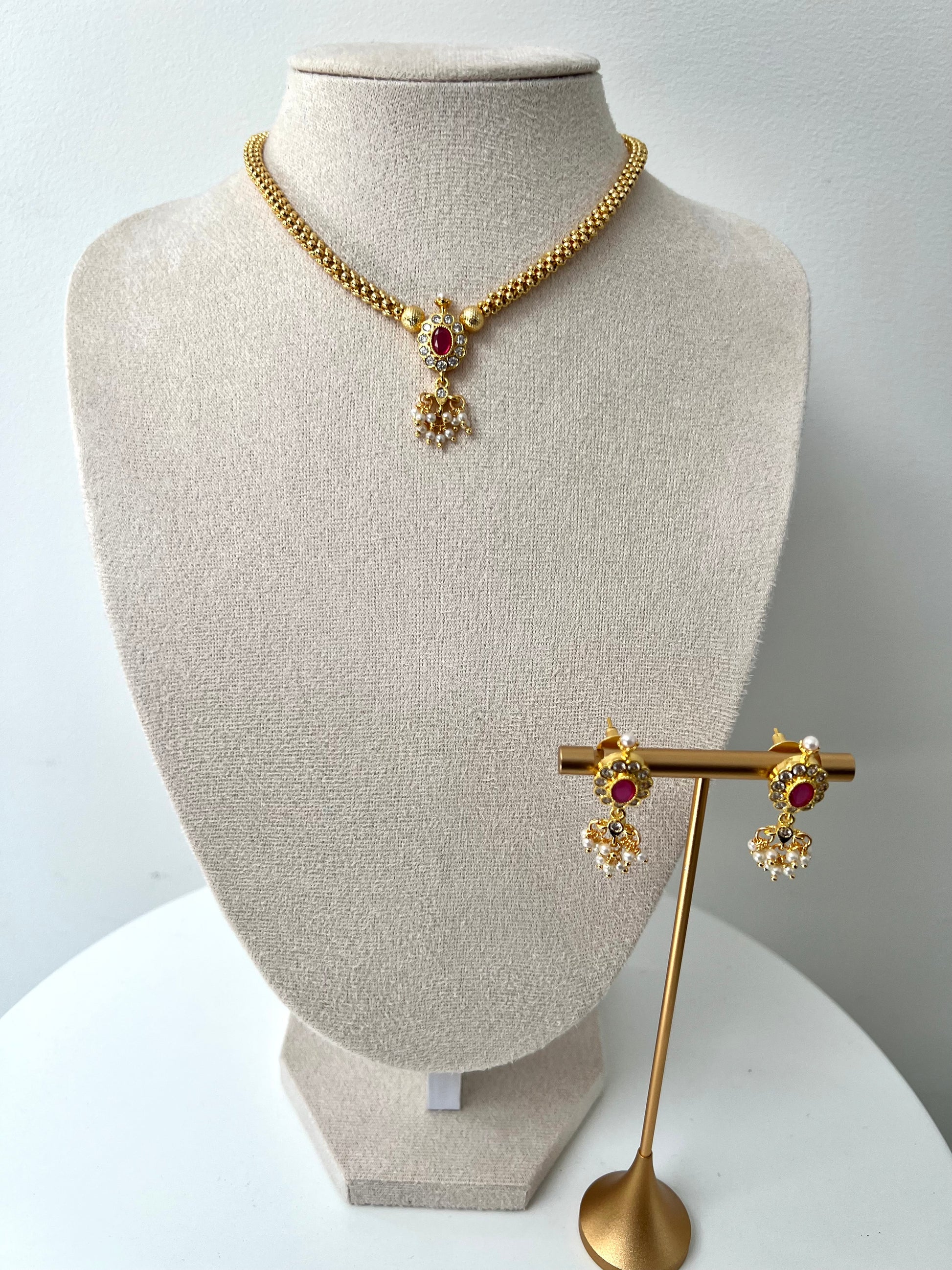 KESHANA - Simple gold chain with a white and ruby stoned centre piece with matching small earrings N3369