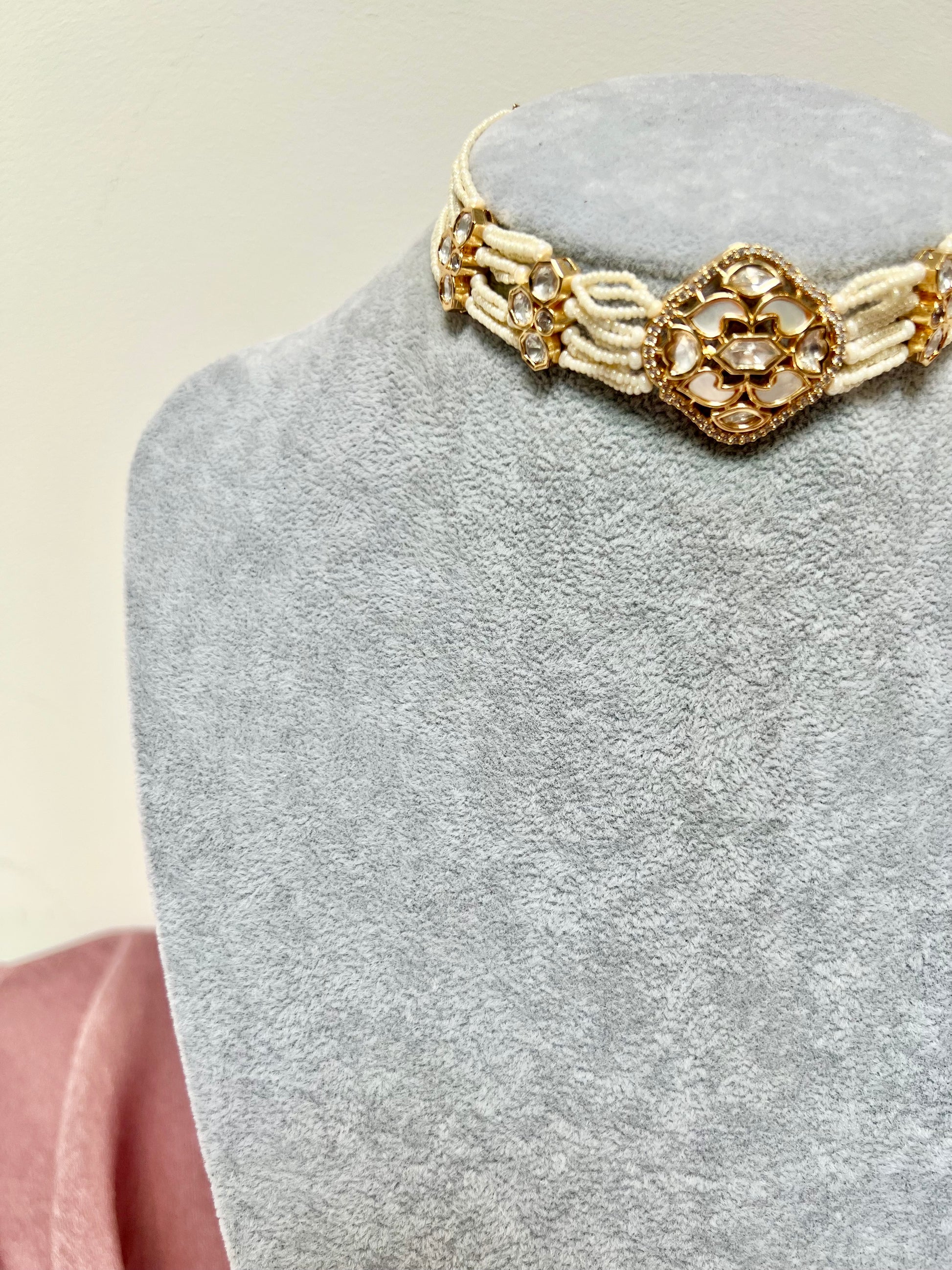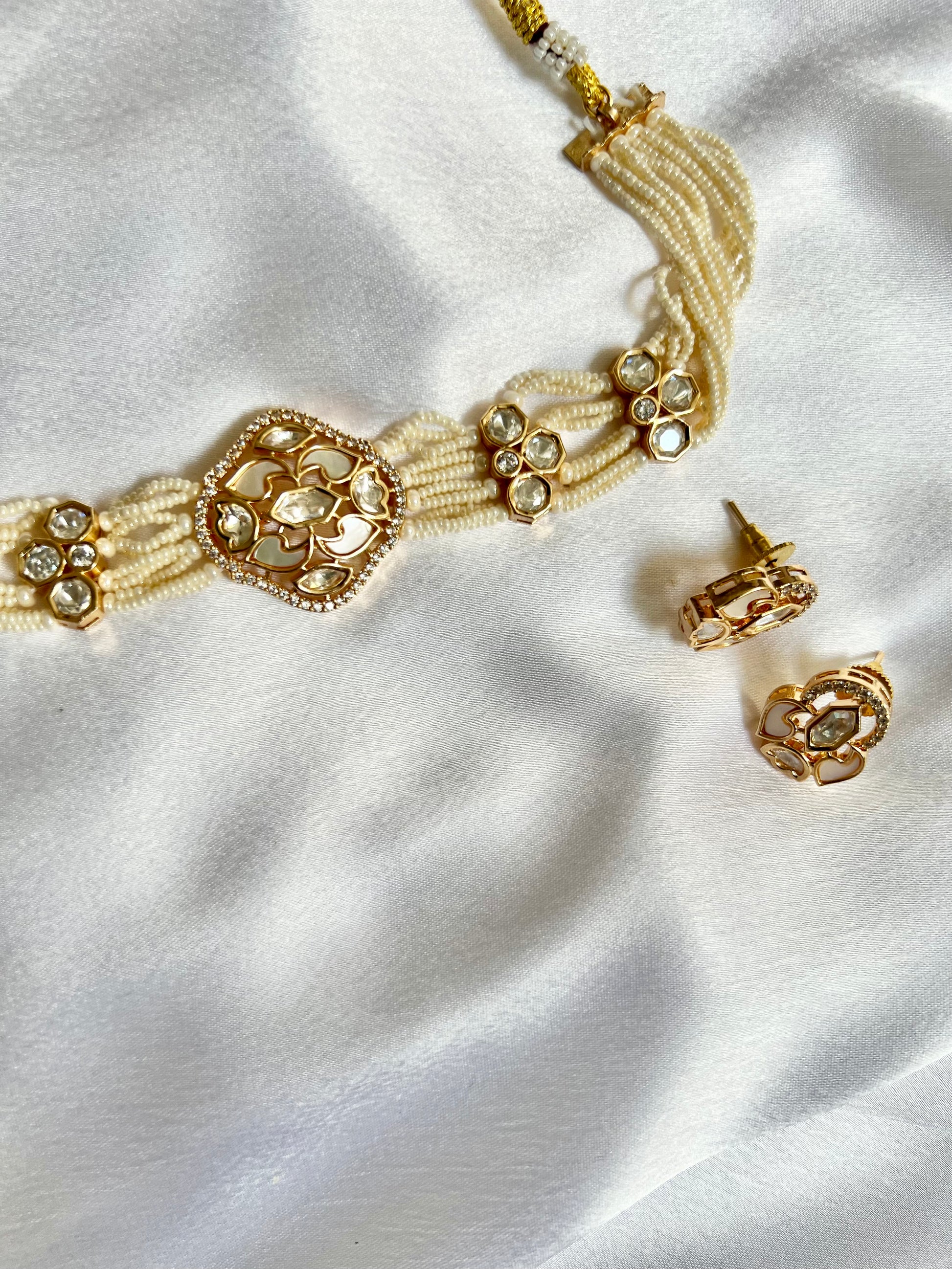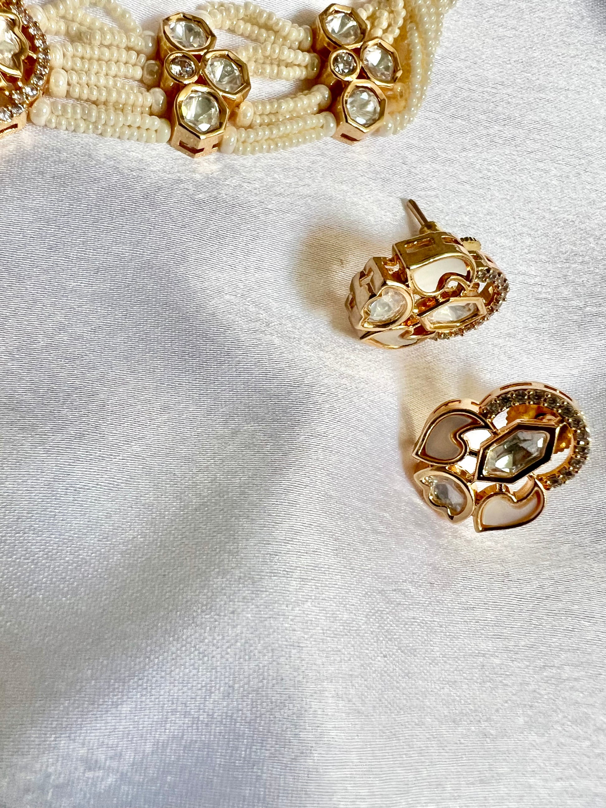 Mother of pearl kundan stone choker in rose gold plating, with matching stud earrings N3280