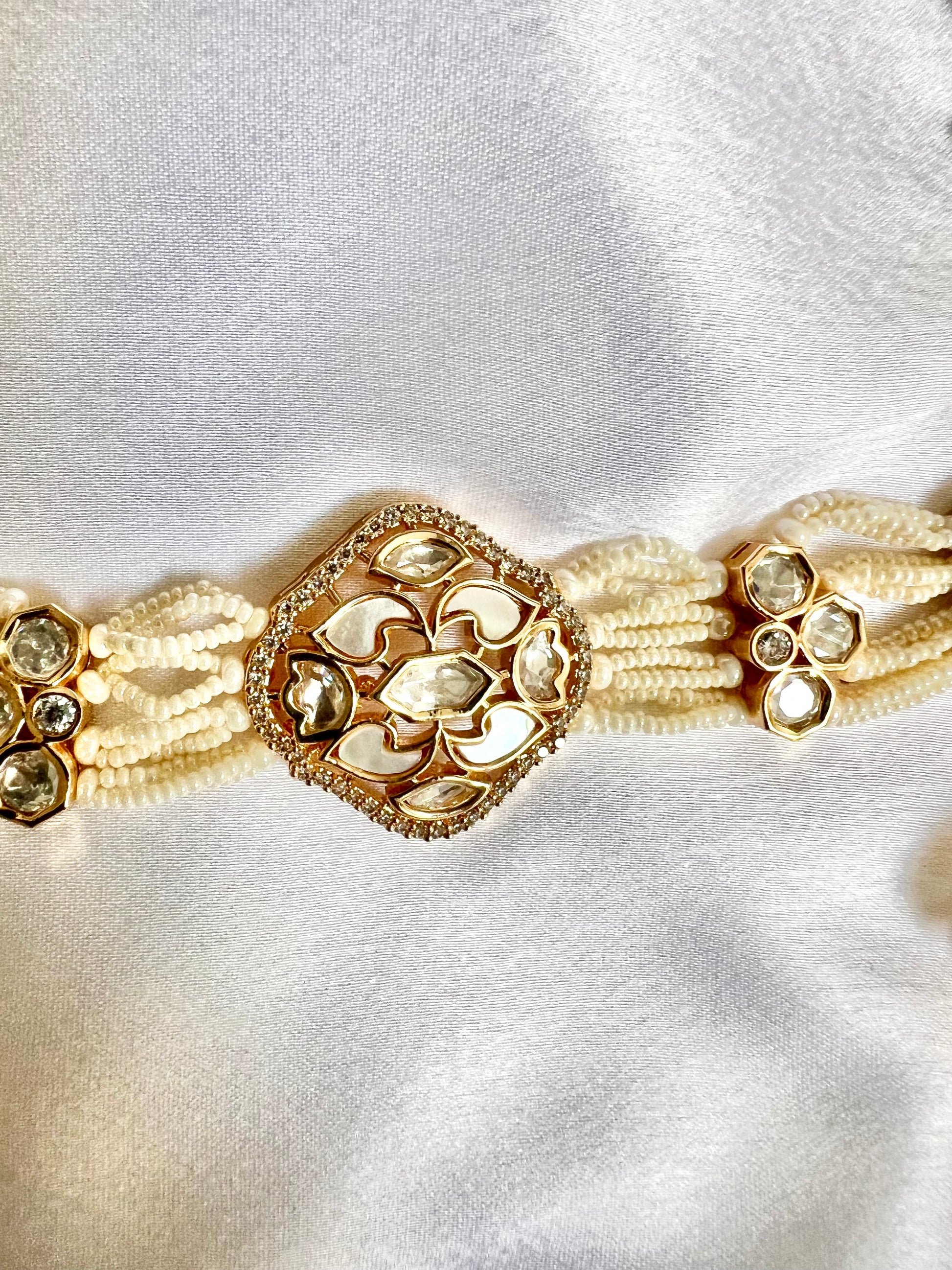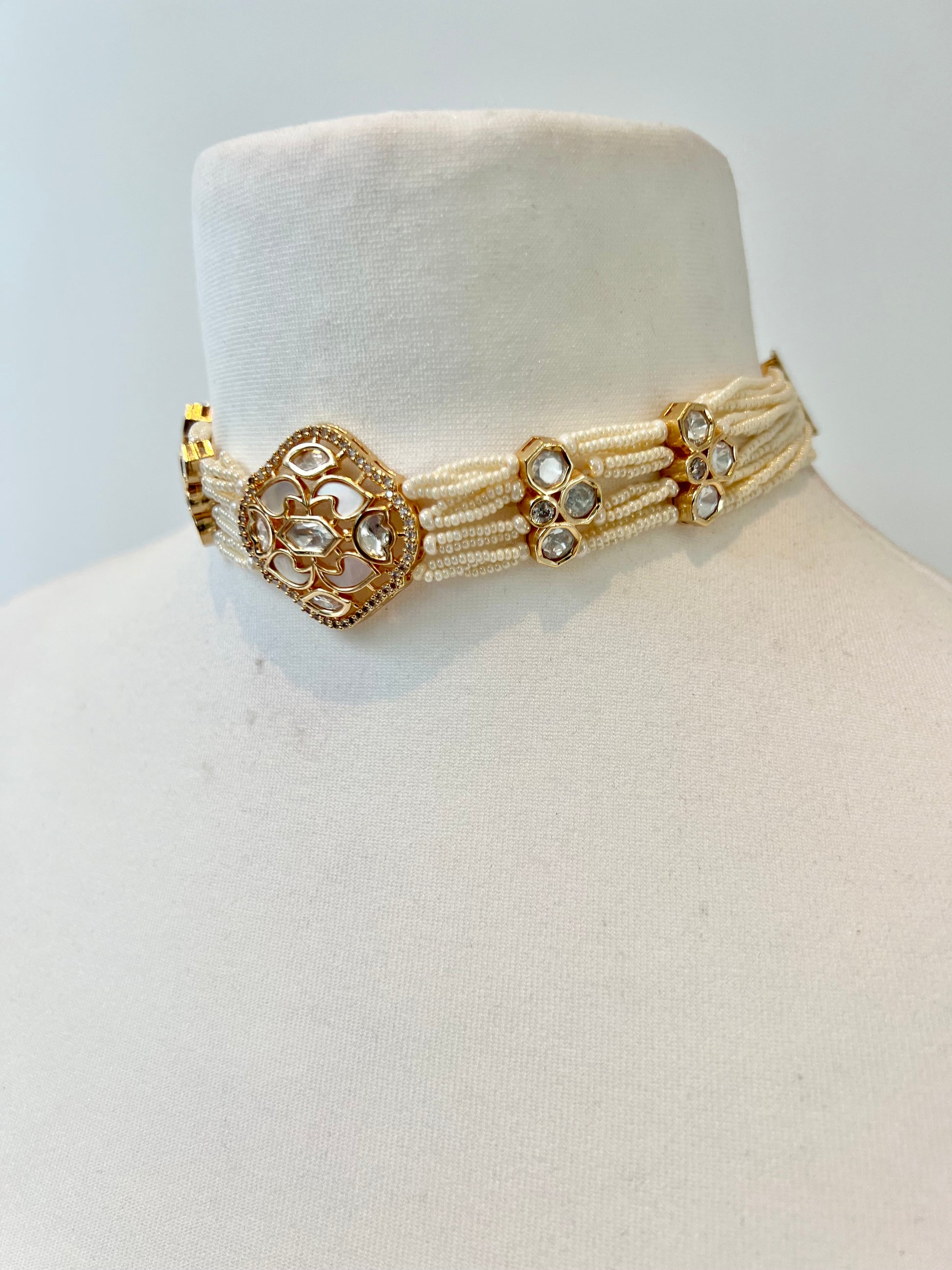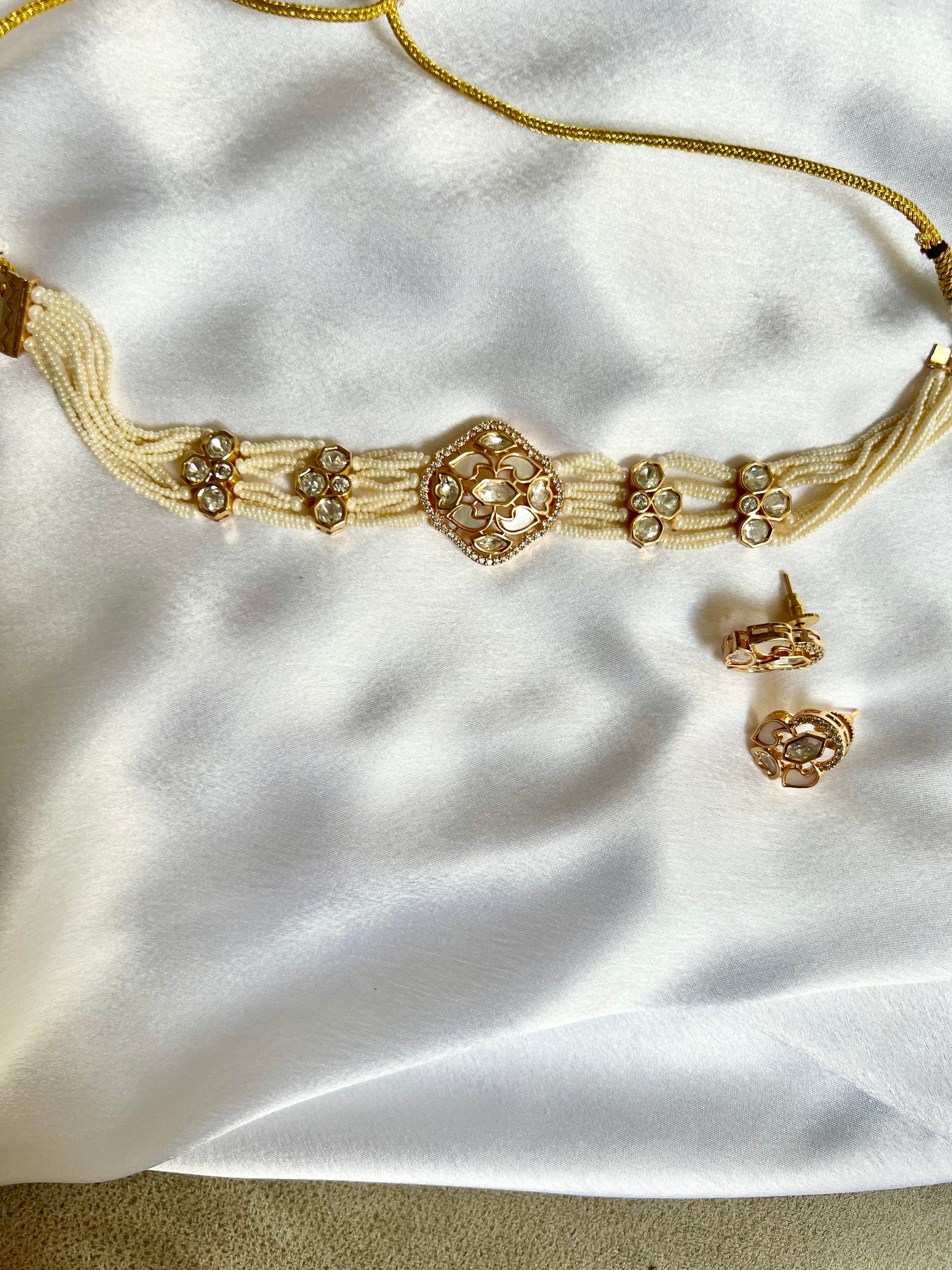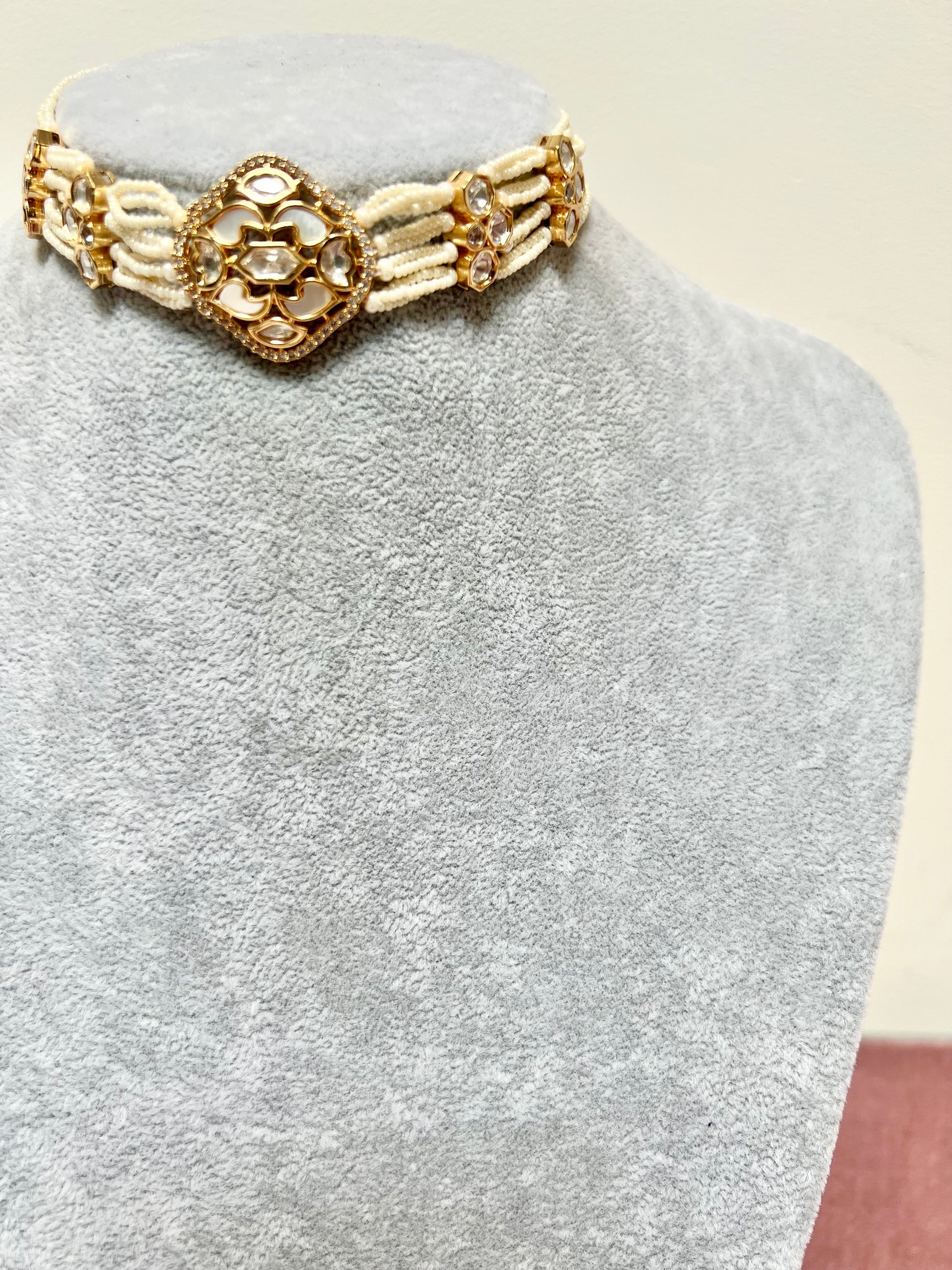 Mother of pearl kundan stone choker in rose gold plating, with matching stud earrings N3280