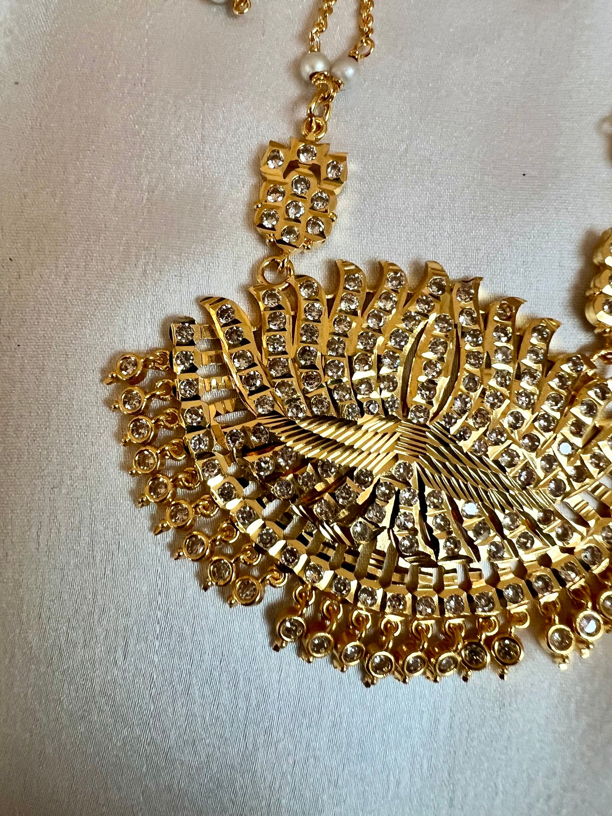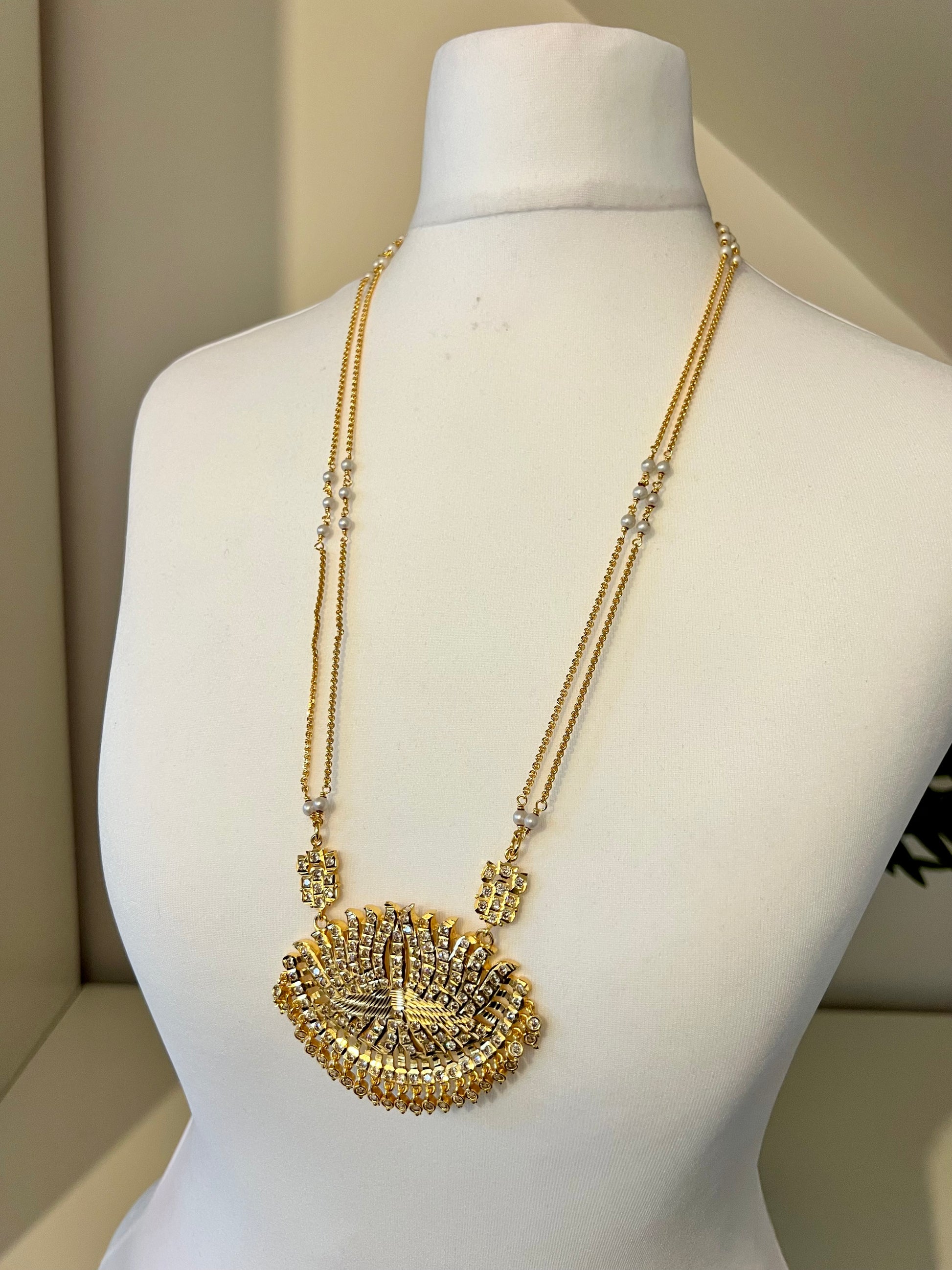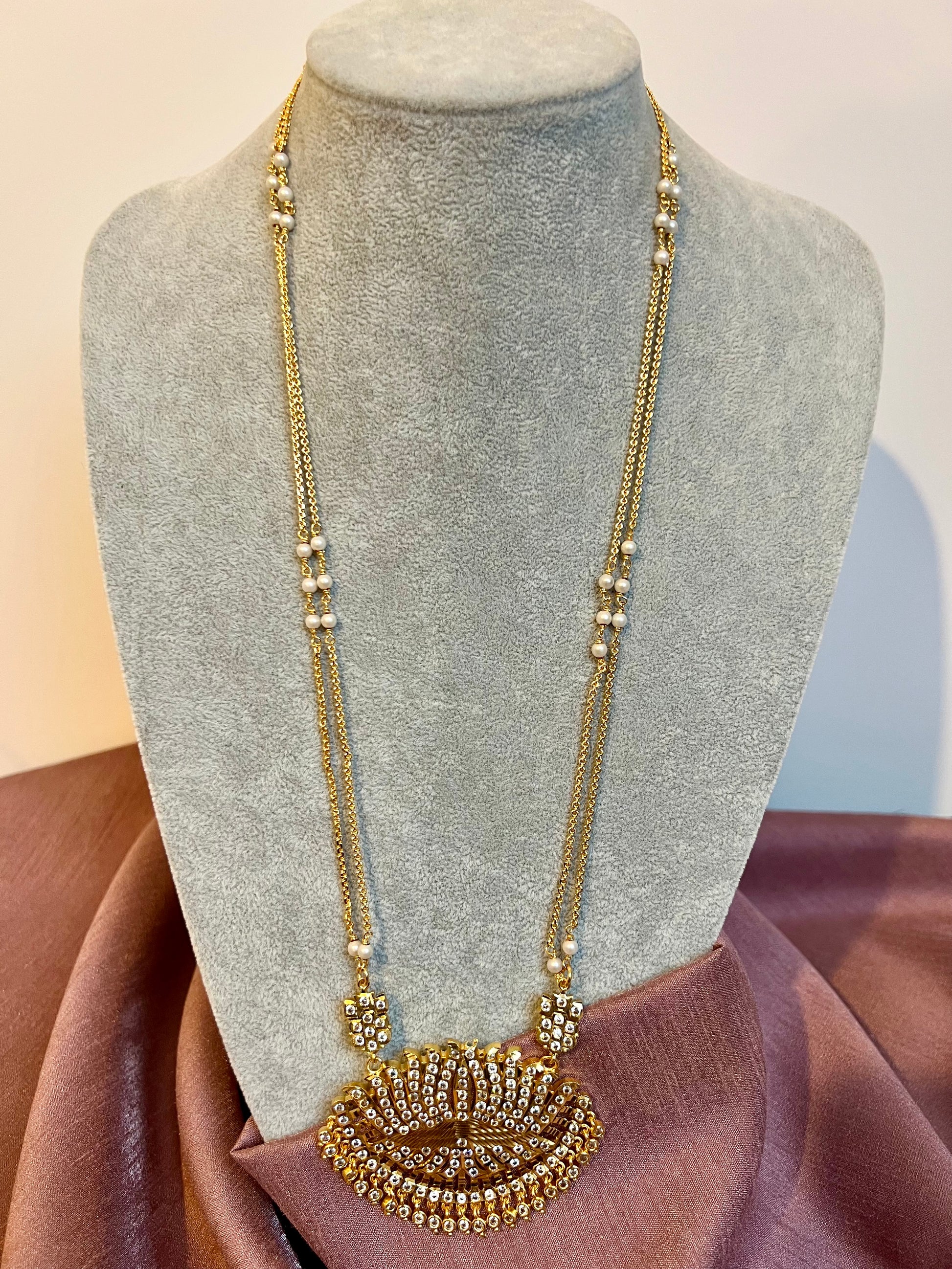 Classic traditional long pathakam lotus necklace with white stones and a pearl chain.