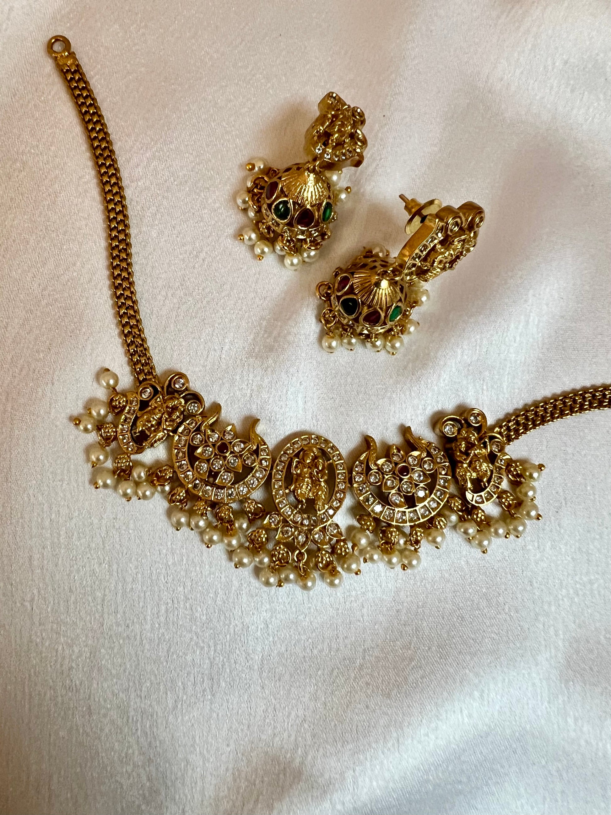 LAVOTHINI - golden temple small choker necklace with small jhumkas N3188
