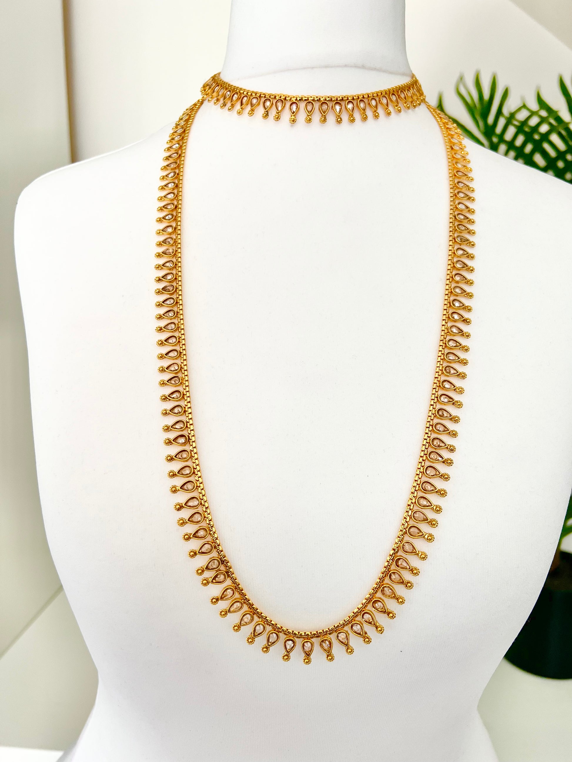 SAHANA - Antique gold plated long and short necklace set with matching earrings and uchi pattam/tikka N3001