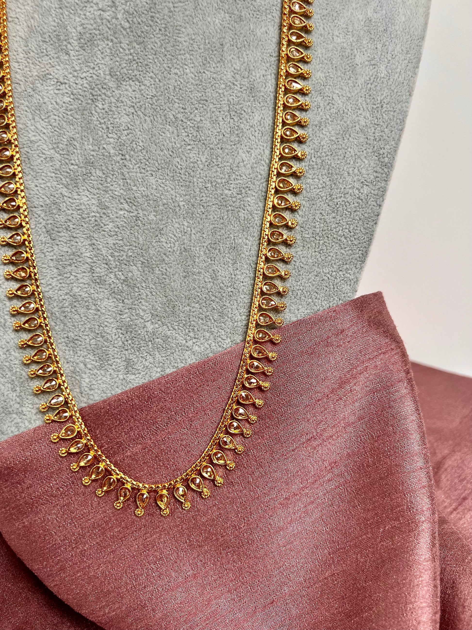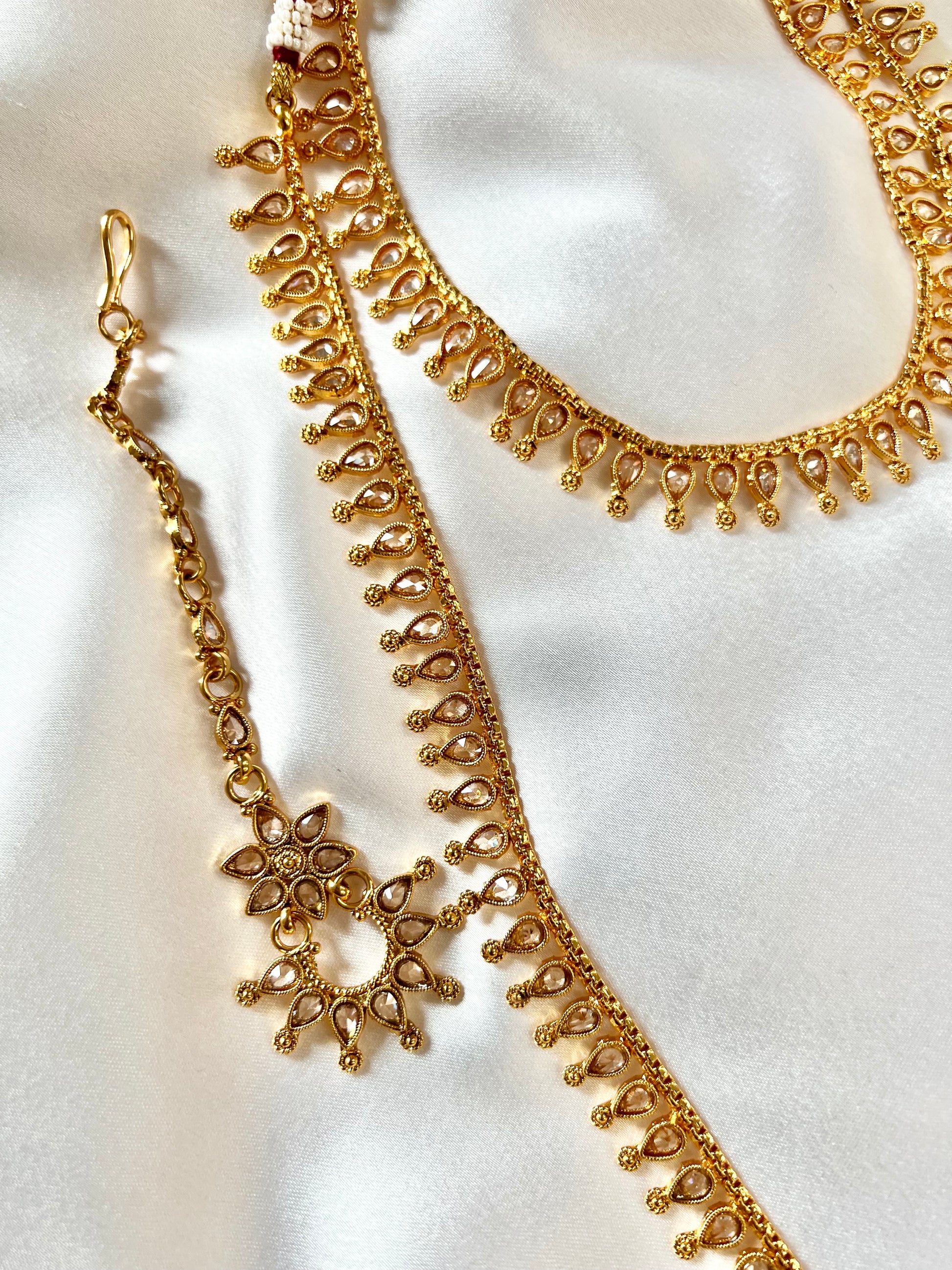This is a classic antique style south indian gold plated necklace set with a complement pair of earrings and a tikka. The entire necklace is made up of a golden base with small tear drop shaped clear stones and encased in a golden frame.