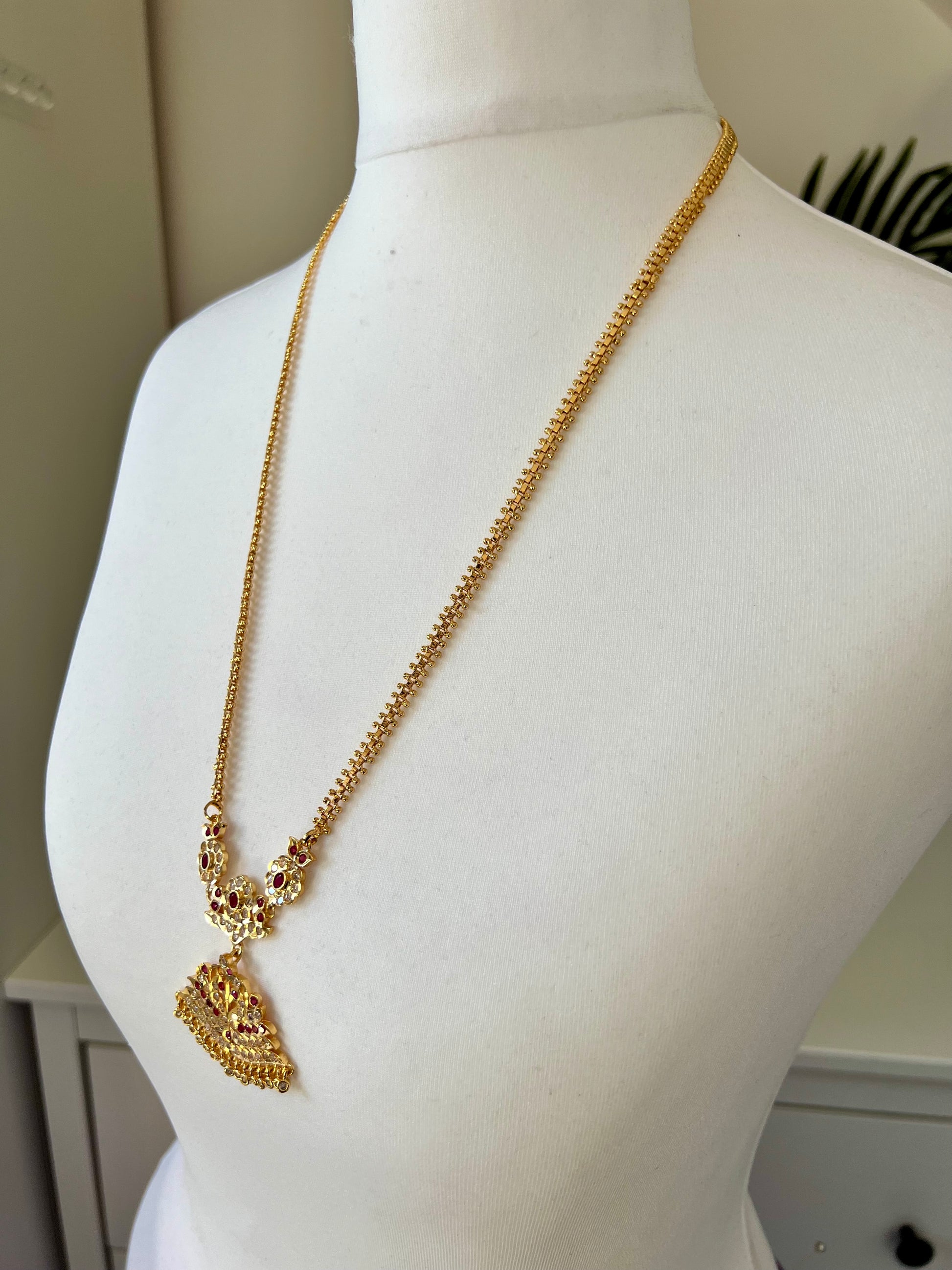 Traditional south Indian impon long haram necklace embellished with white and ruby stones, a perfect simple jewellery piece for a traditional look.