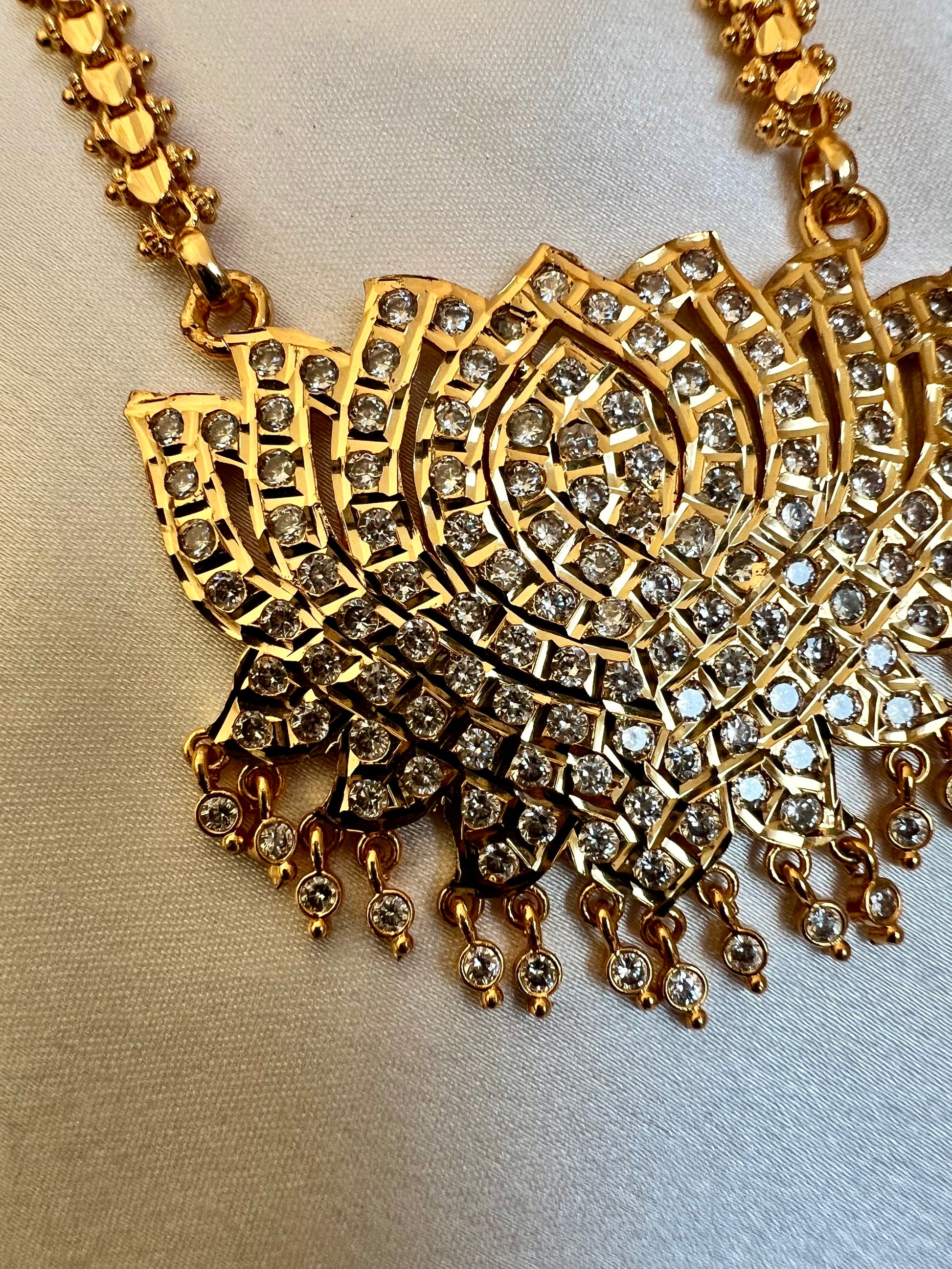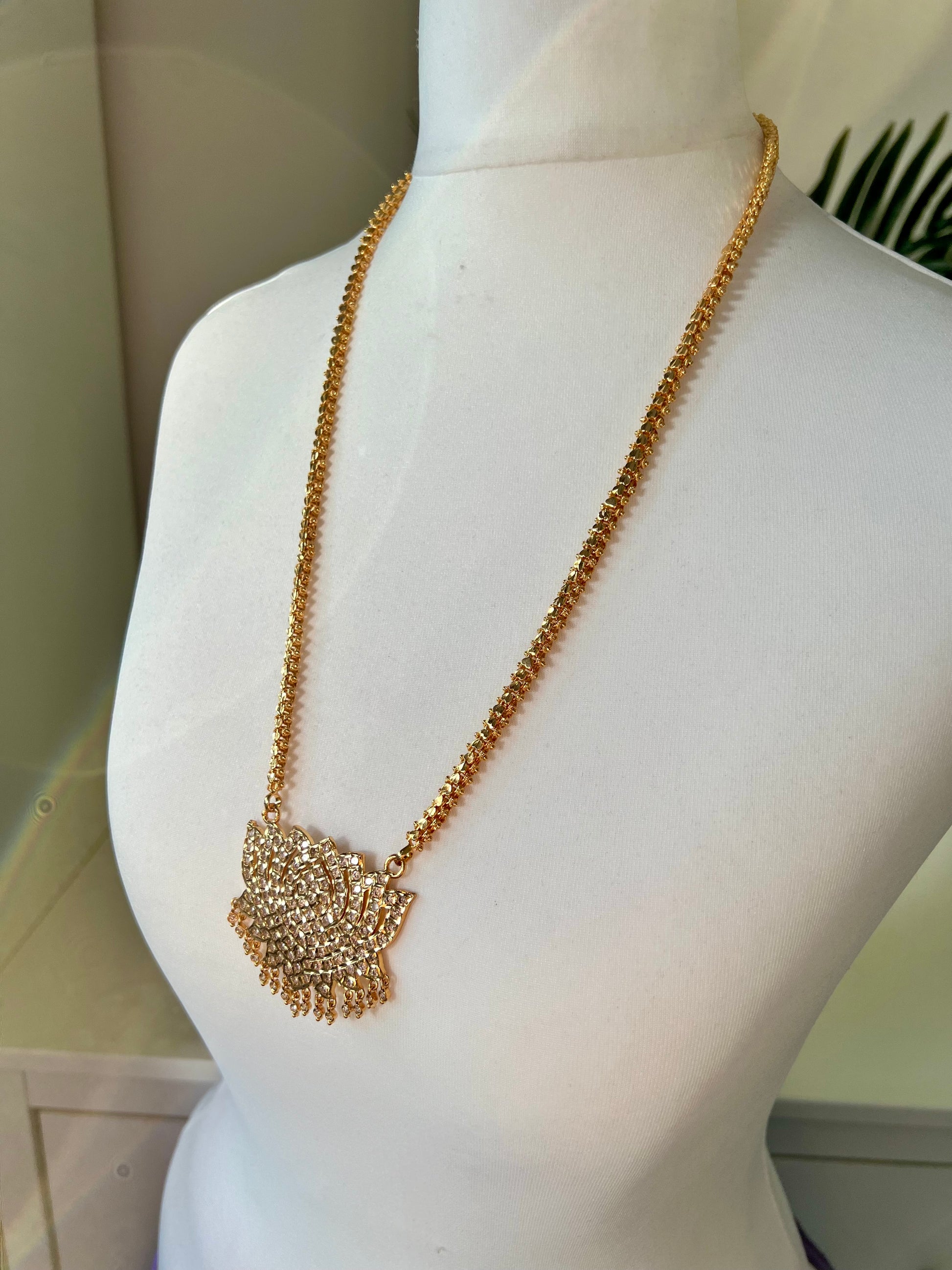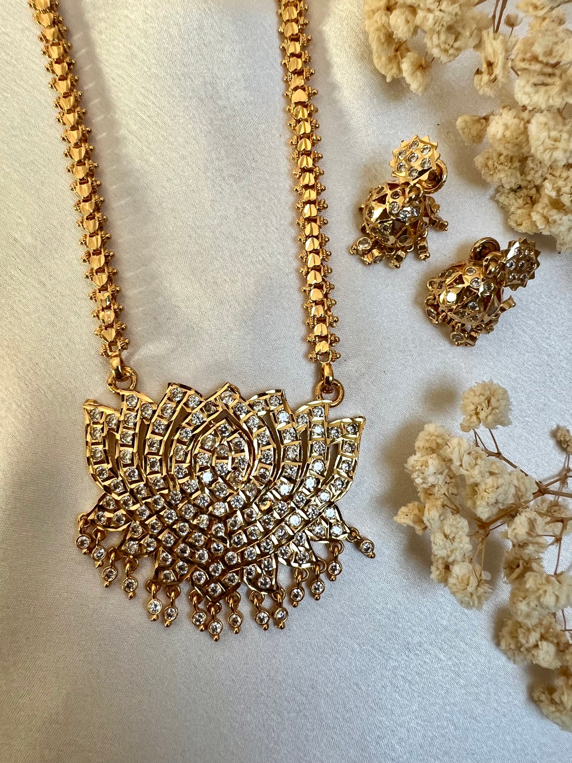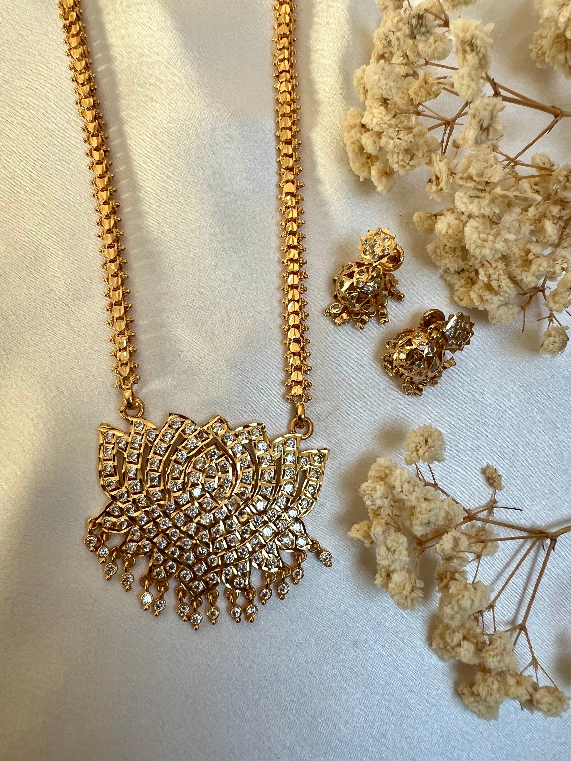 MANGAI - Long lotus impon white stones necklace with jhumkas N3148