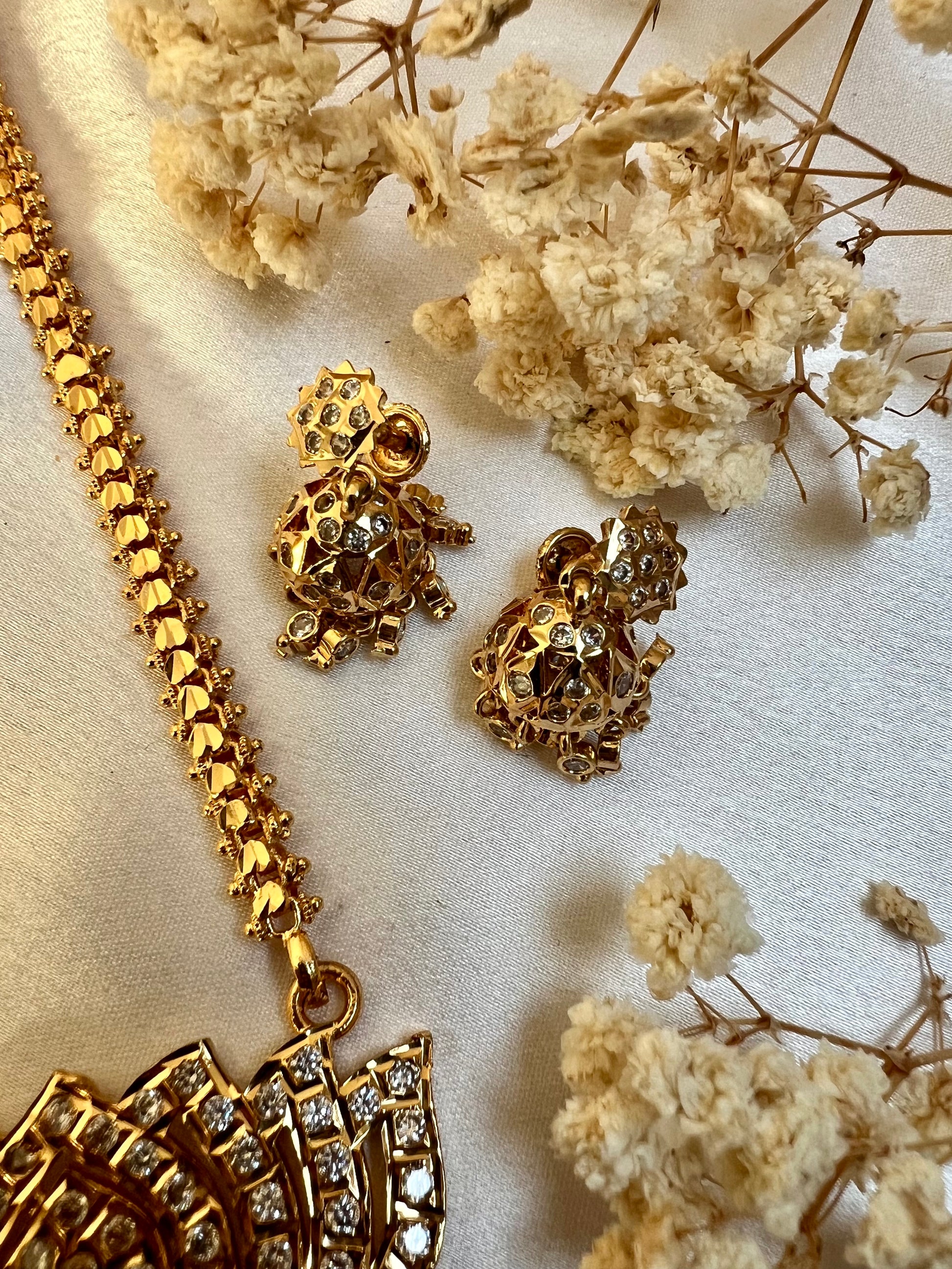 A beautiful impon white stones lotus necklace with matching small jhumkas.