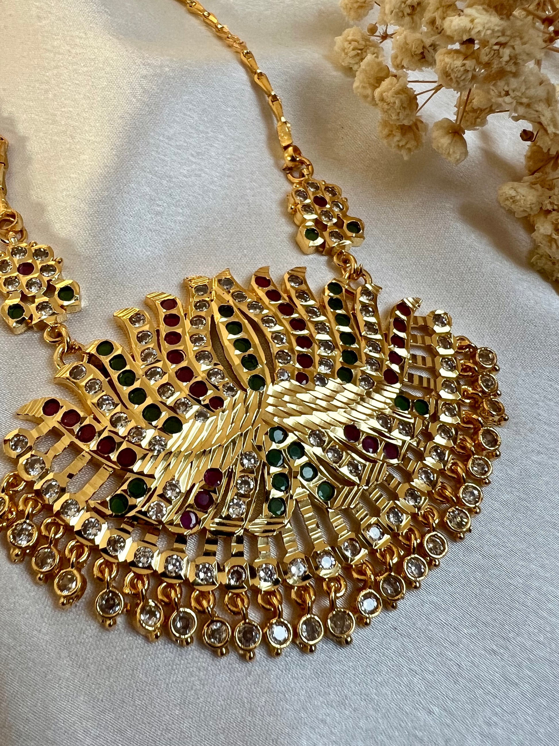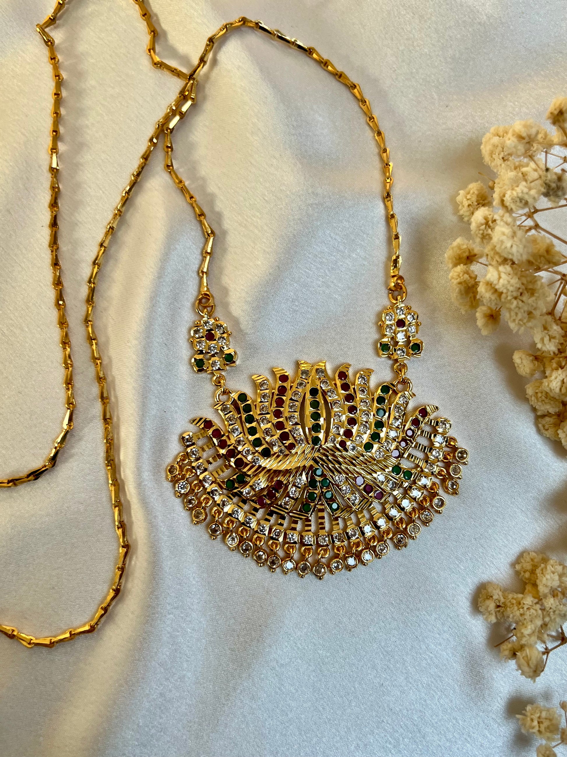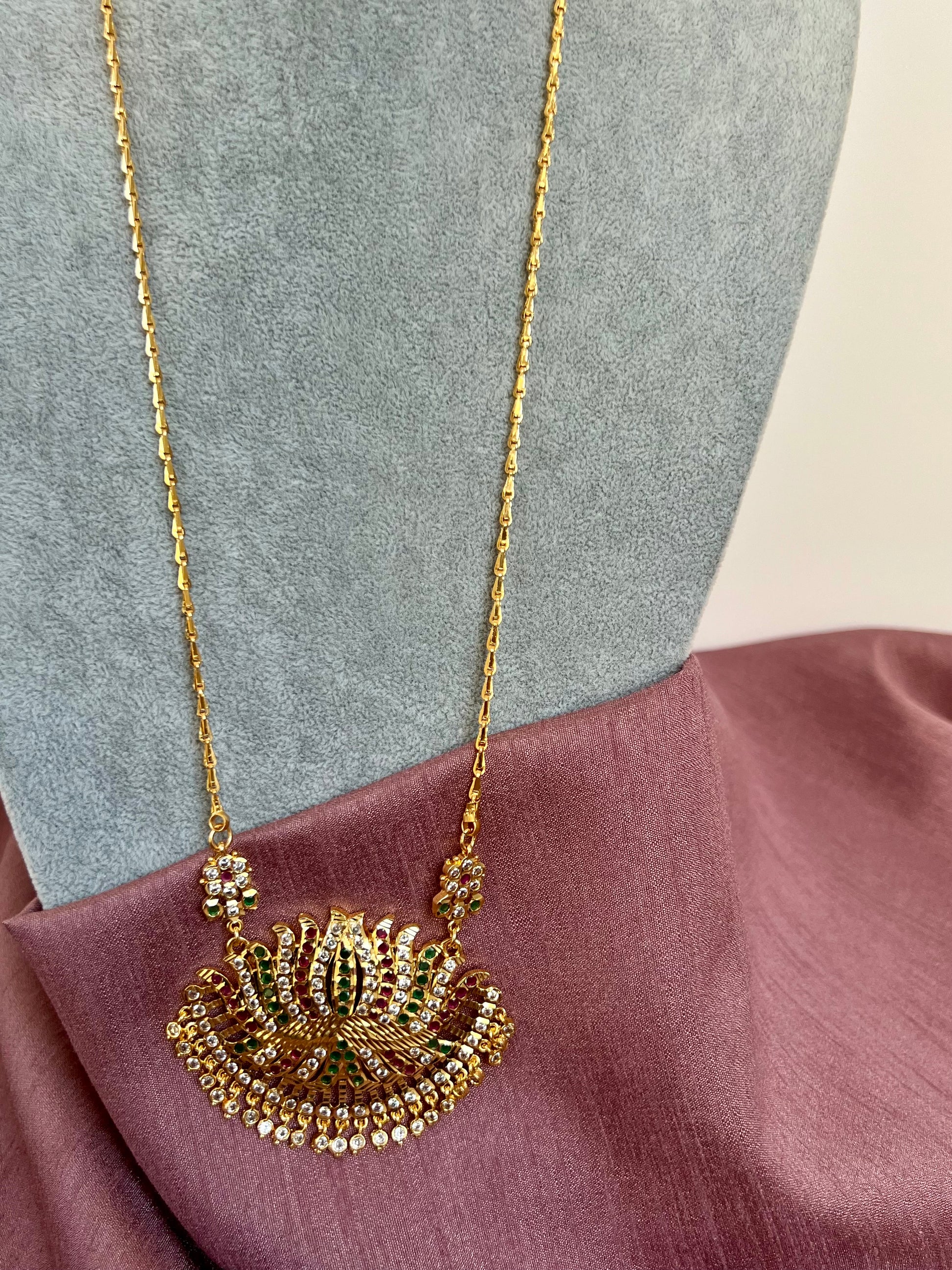 Traditional south Indian long pathakkam necklace embellished with rub, green and white stones.