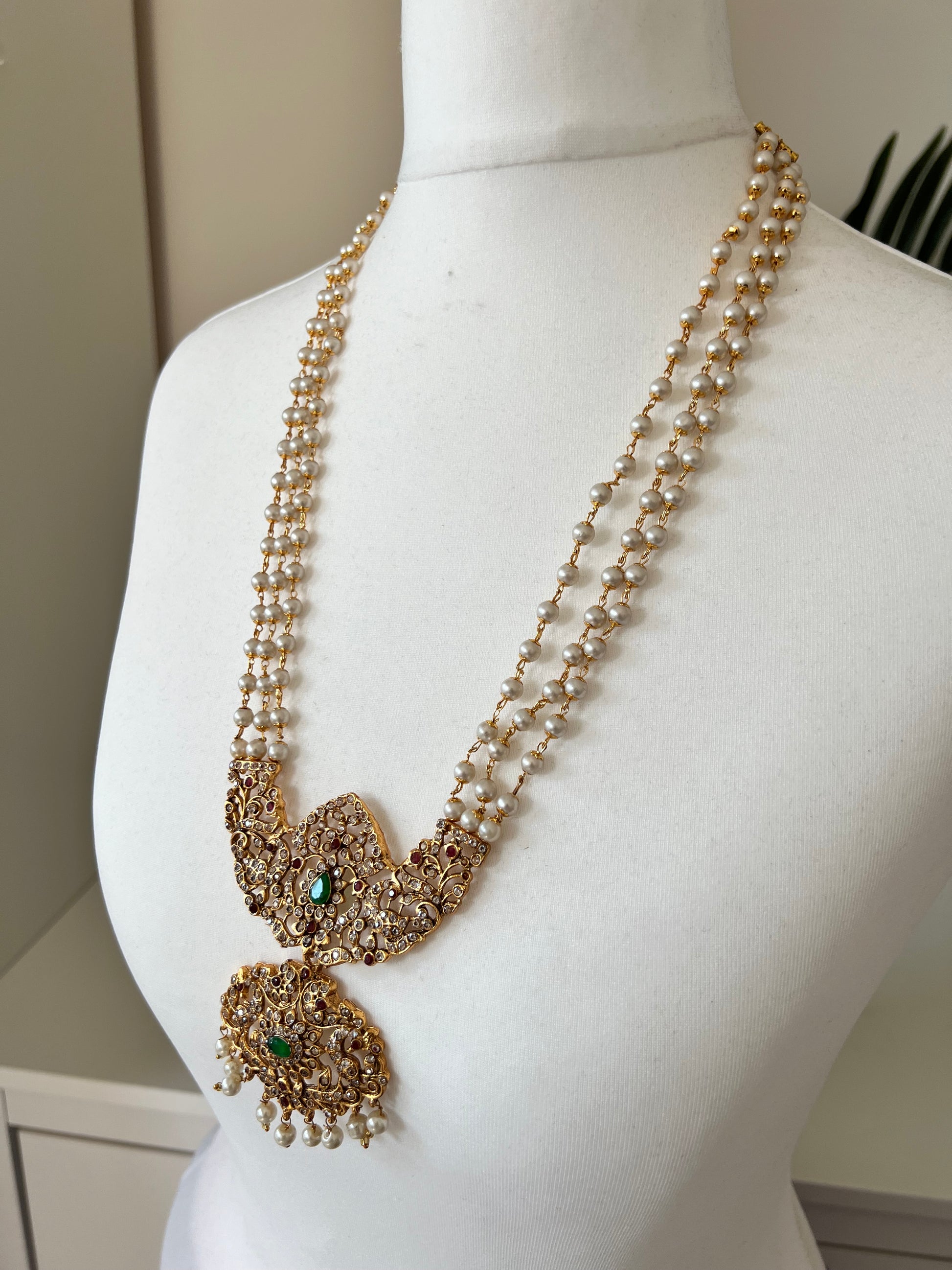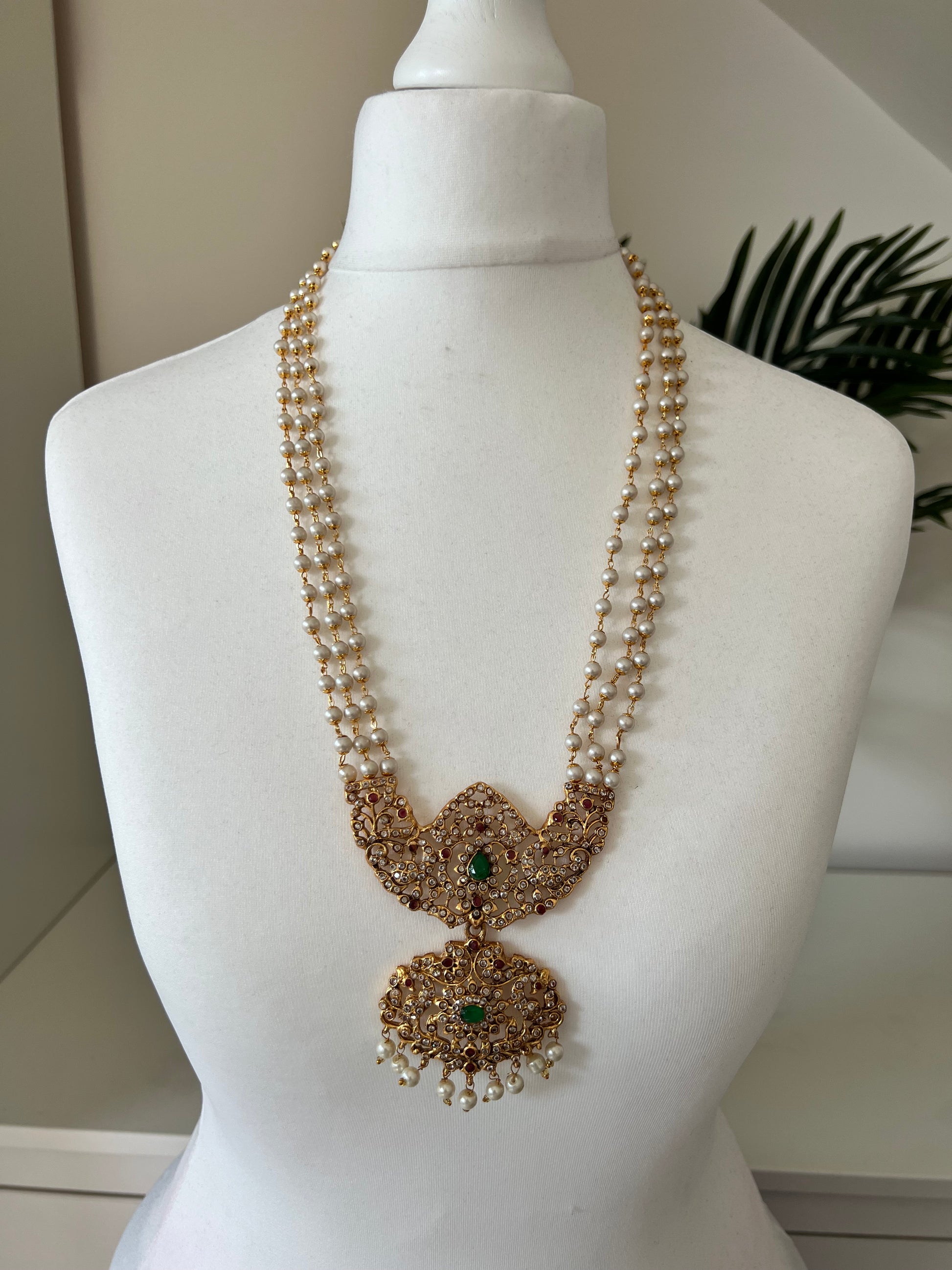 Long traditional haram necklace set embellished with green, ruby and white stones, comes with matching white stones.