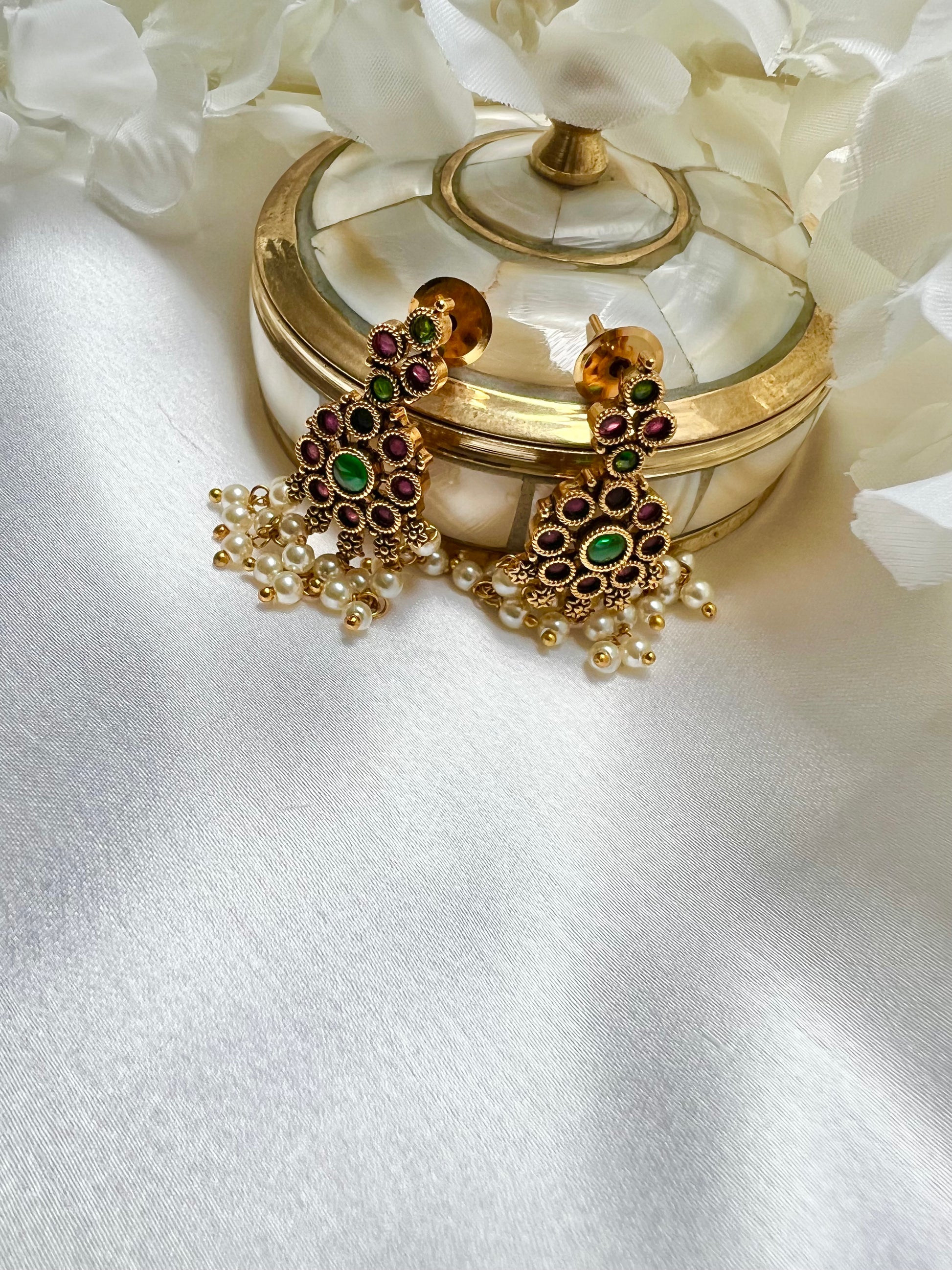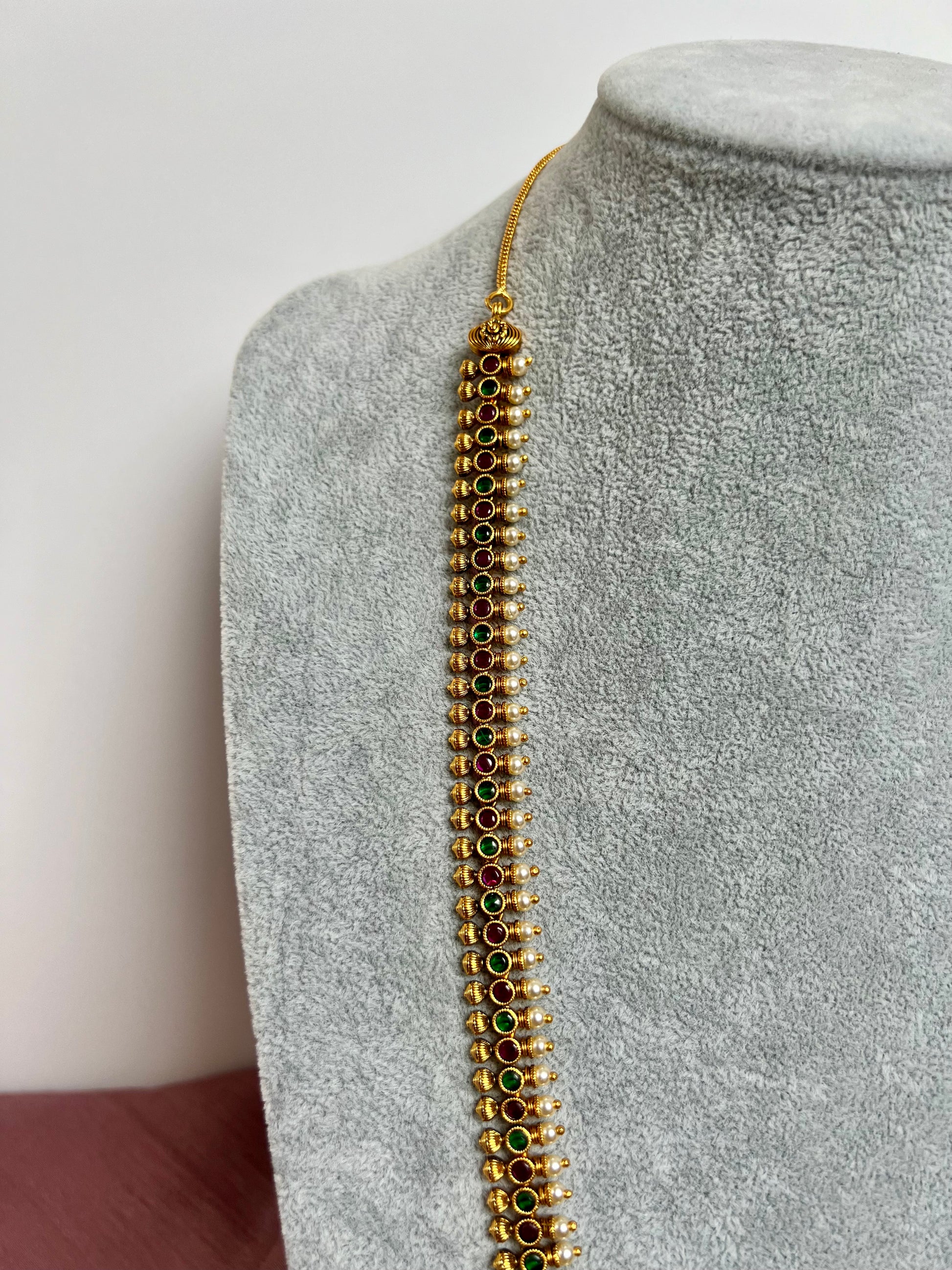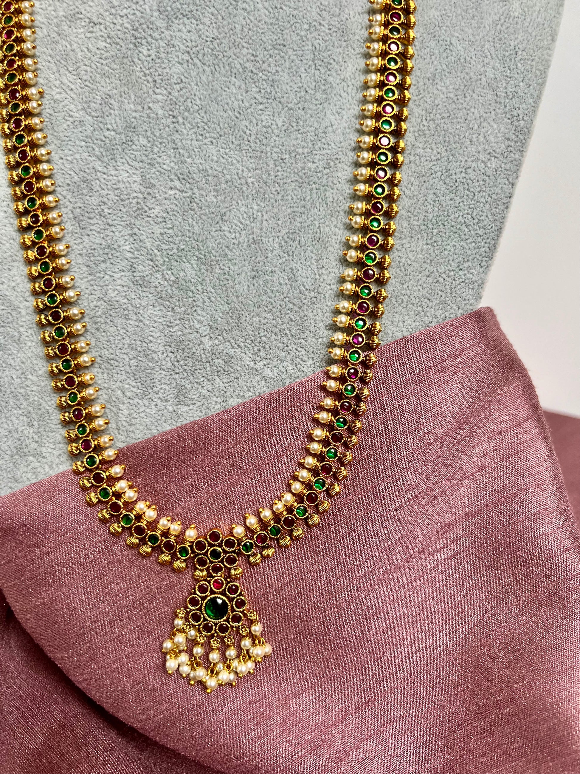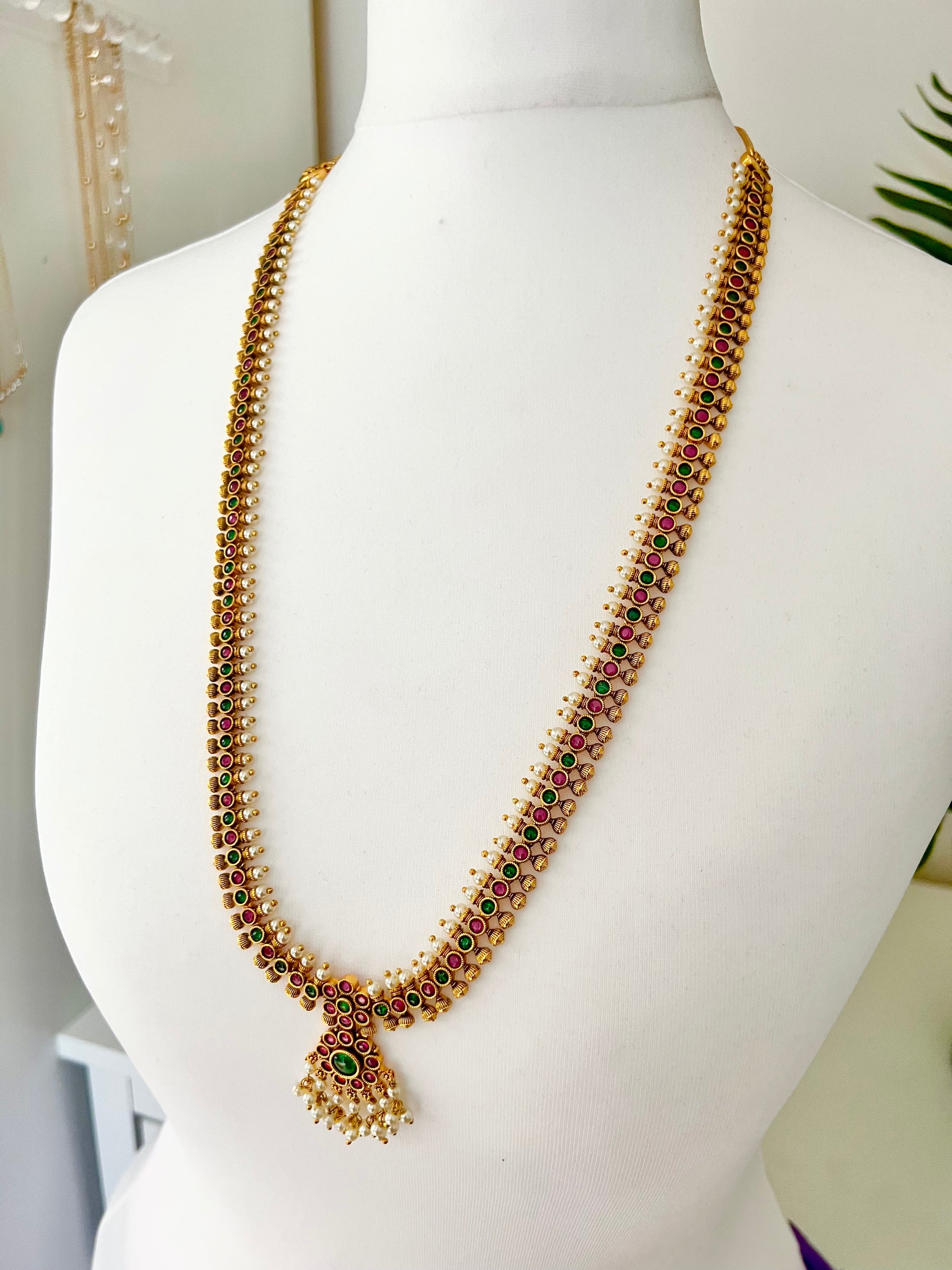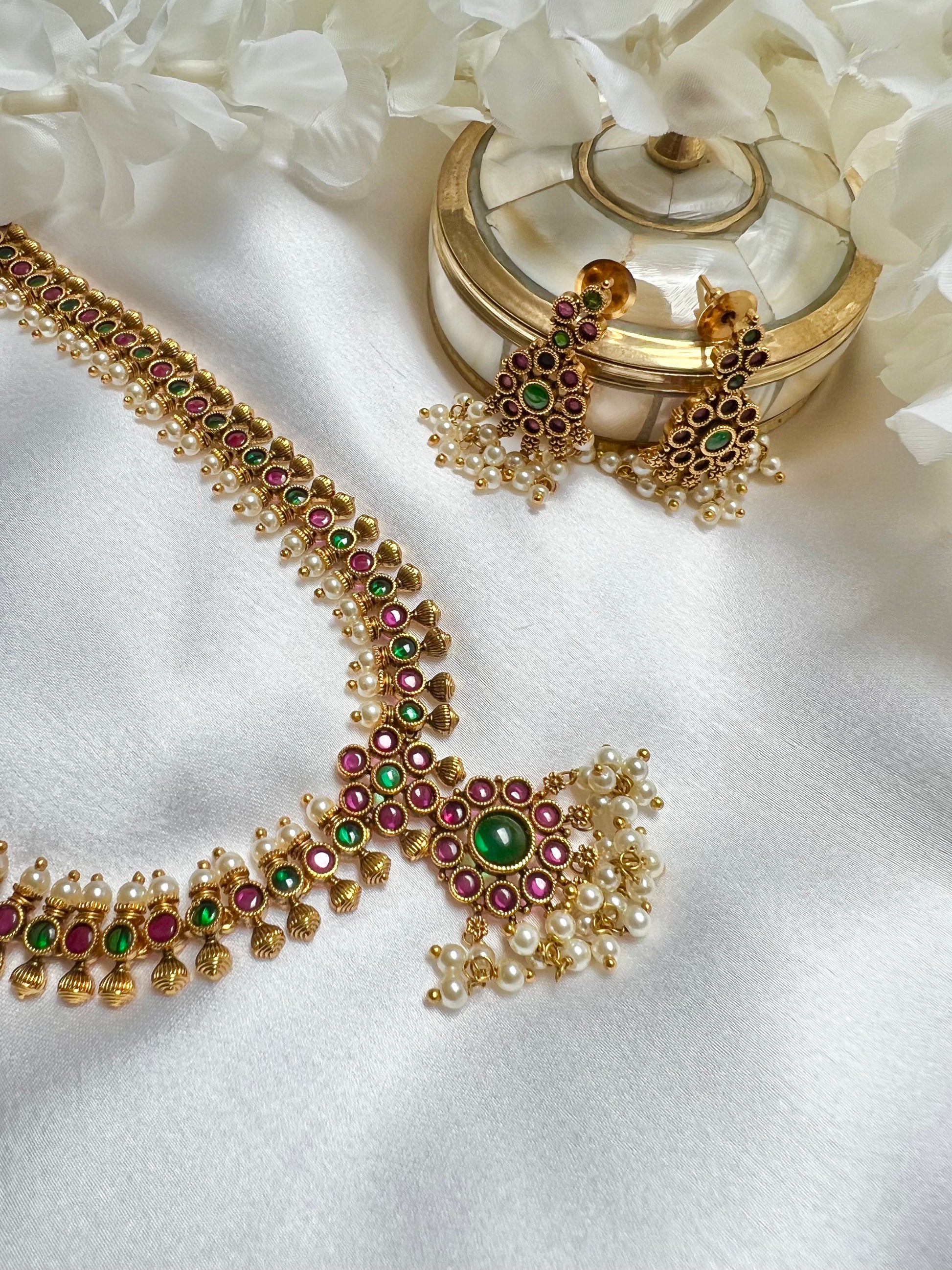 INIYA - Antique Kemp stone matte gold plated rubygreen South Indian long necklace set with a pair of earrings N3003