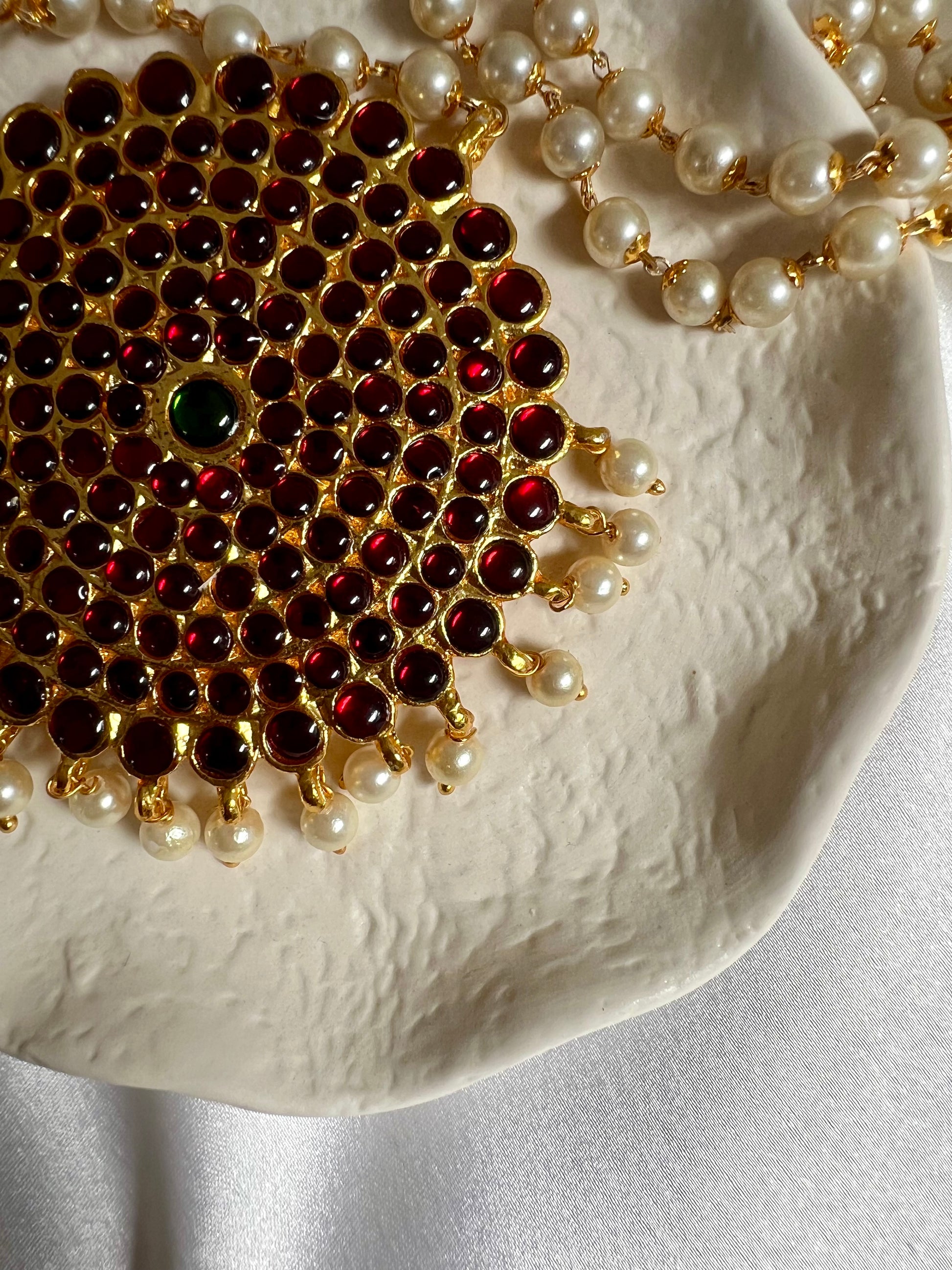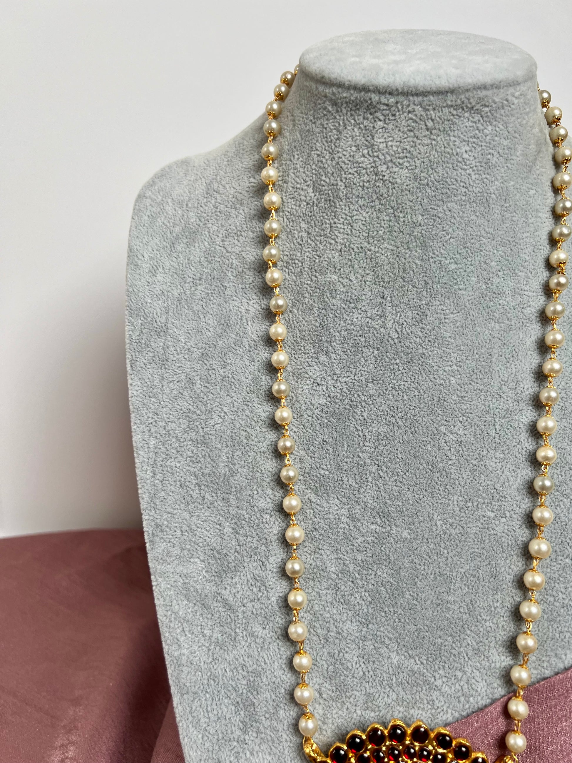 Traditional round long pendant embellished with imitation ruby kemp stones and pearls, hanging on a long pearl chain. Beautiful to wear with a traditional saree. Pair it up with other kemp jewels or wear on its own, either way its a stunning piece to add to your next collection.
